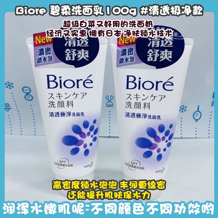 Biore 碧柔洗面乳100g👍超级白菜又好用的洗面奶,经济又实惠❗拥有日本🇯🇵净肤锁水技术💦,高密度锁水泡泡🌬,丰润更绵密☁,还能提升肌肤保水力,润泽水嫩肌呢😇~不同颜色不同功效哟!