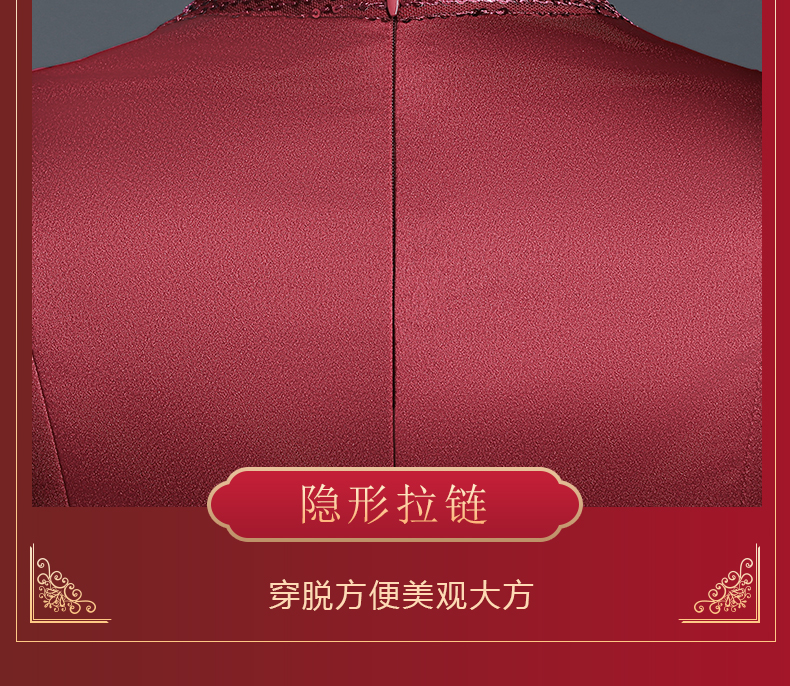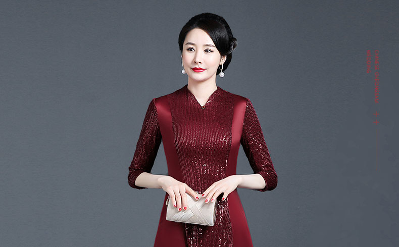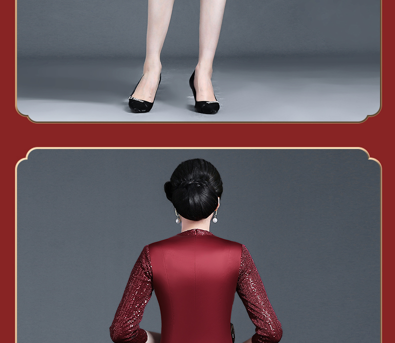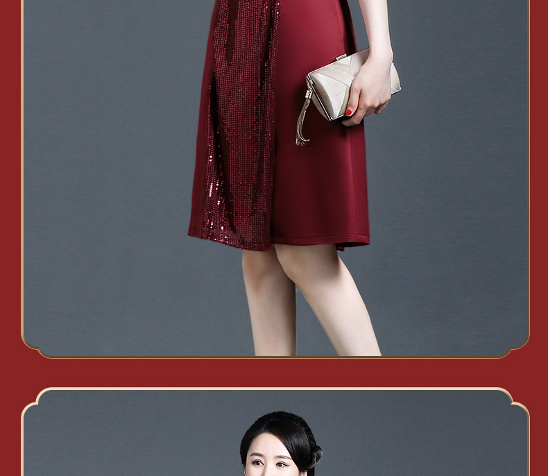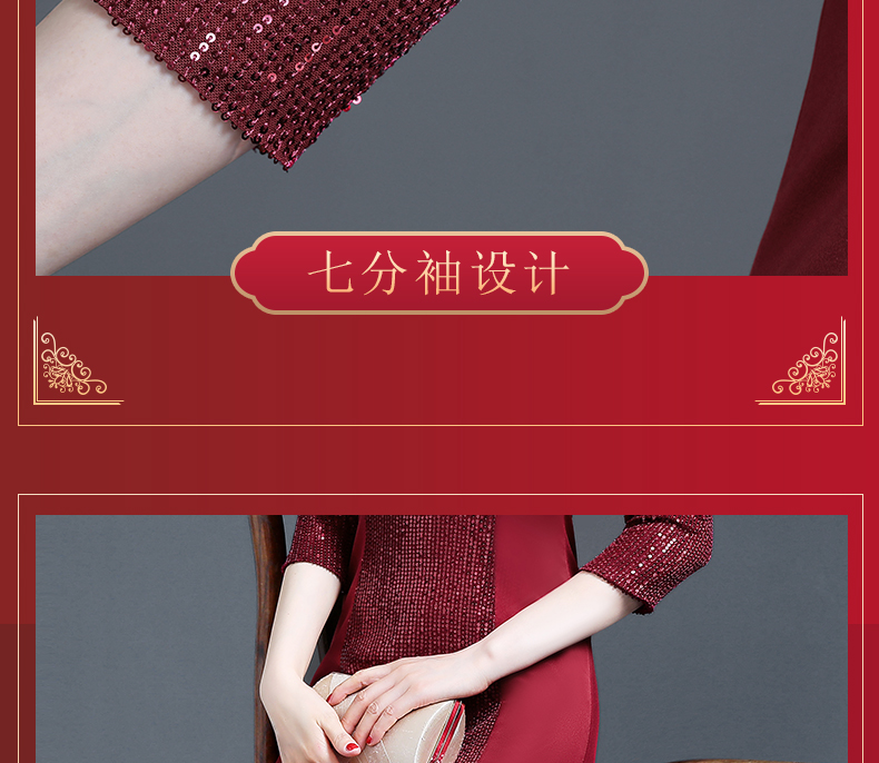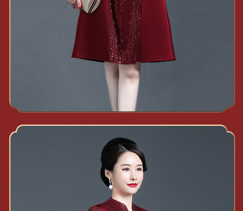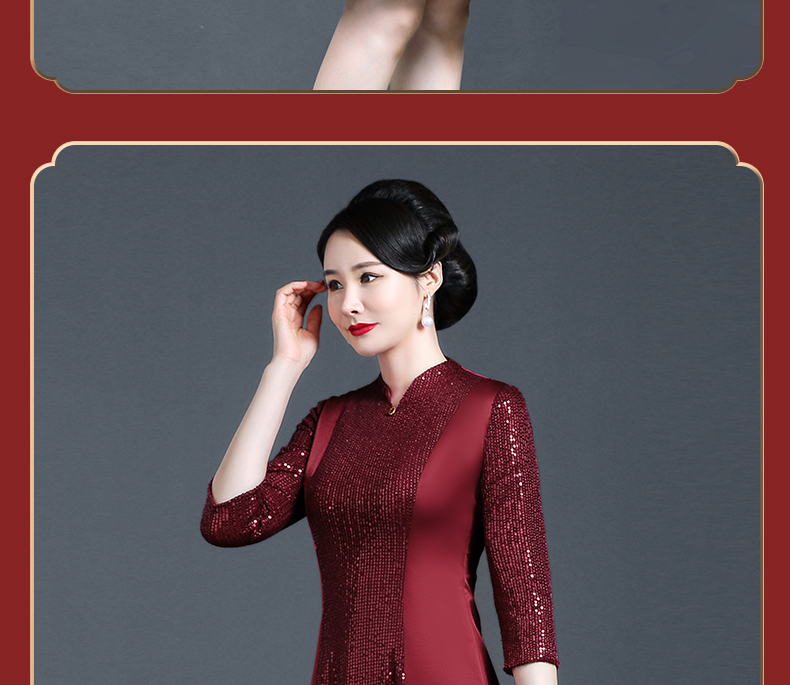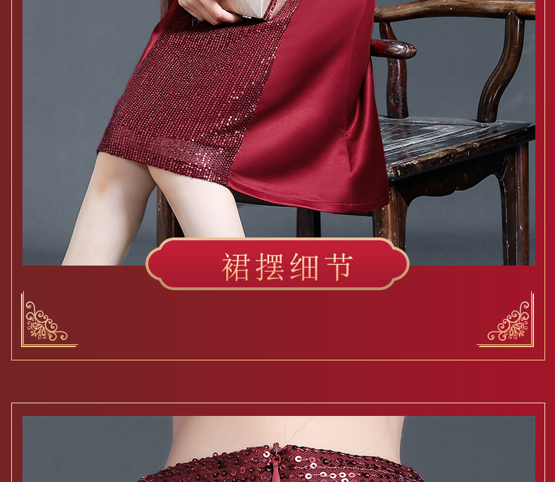 上海旗袍厂NBL-NZ207 酒红 结婚妈妈礼服年轻款丈母娘缎面与亮片拼接旗袍连衣裙婚礼婚宴装秋