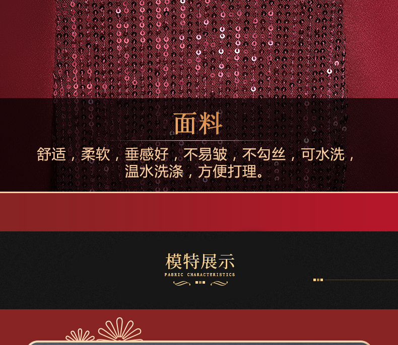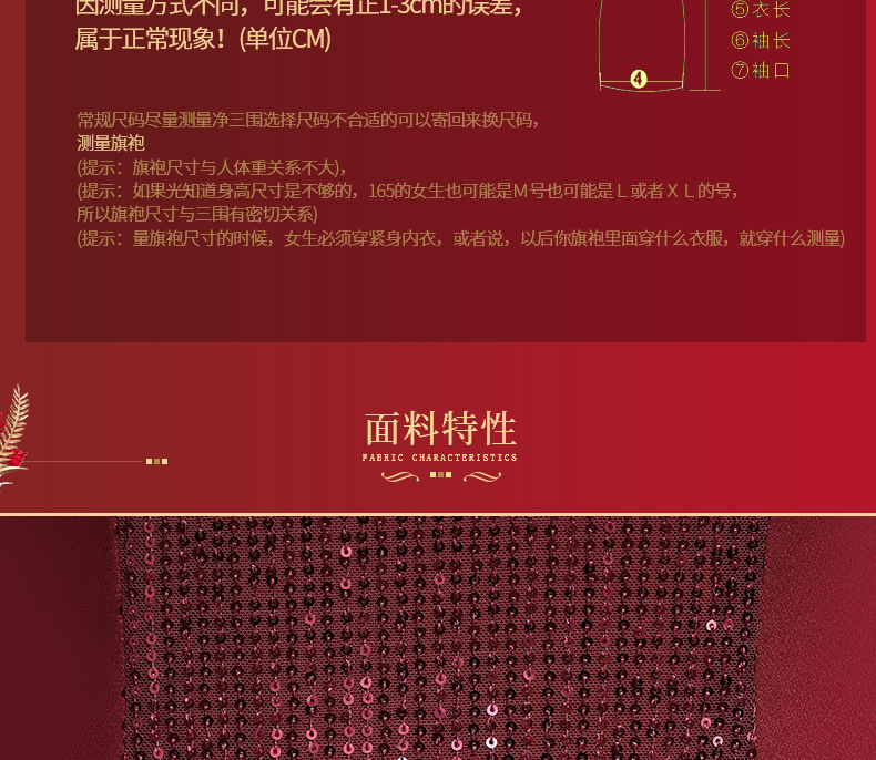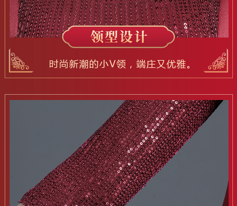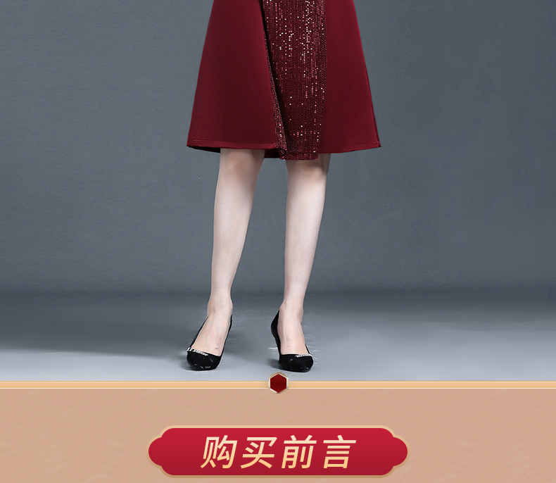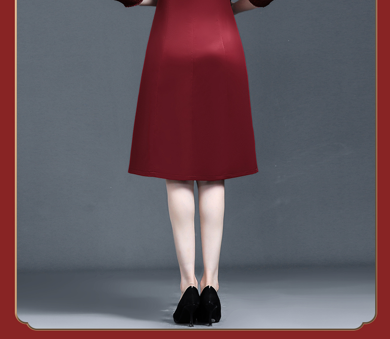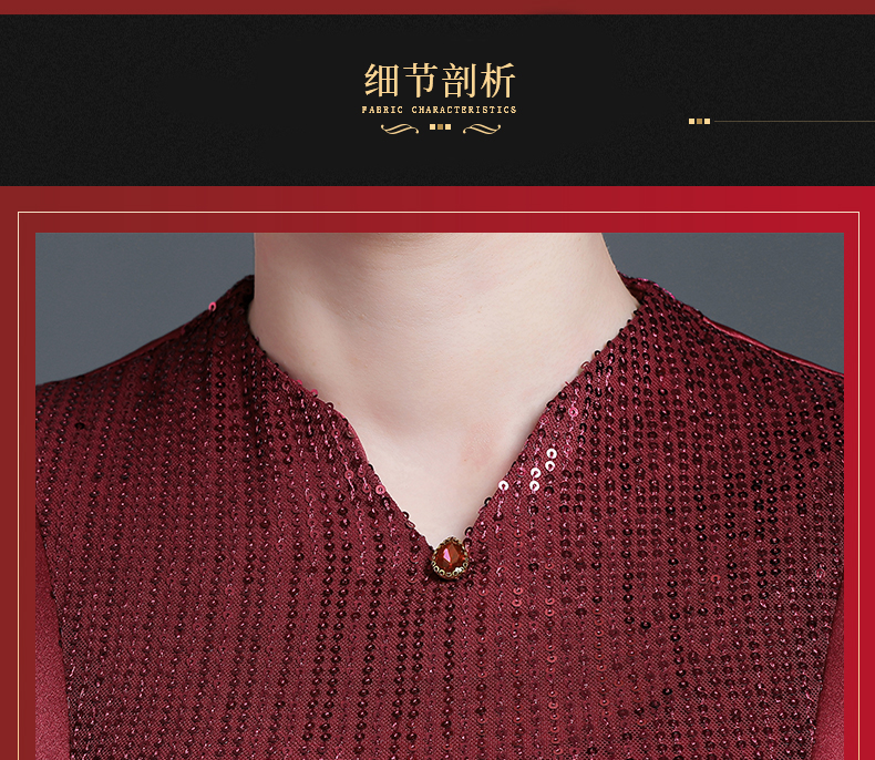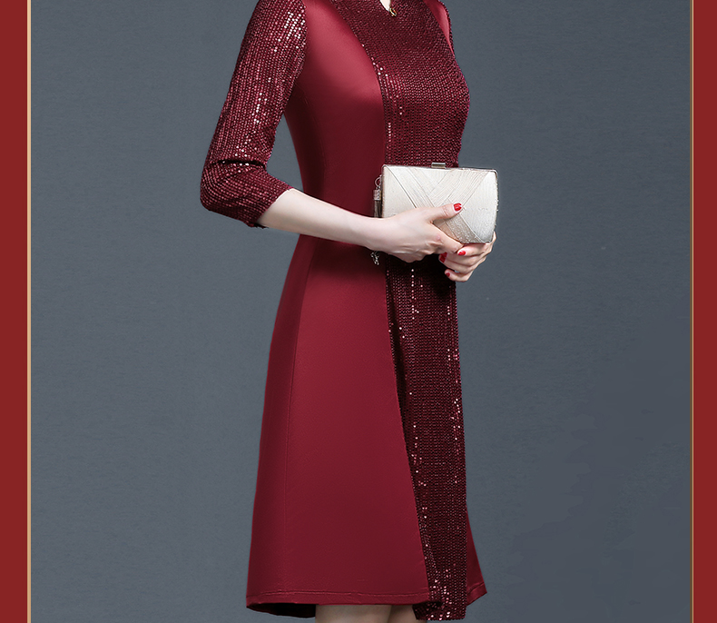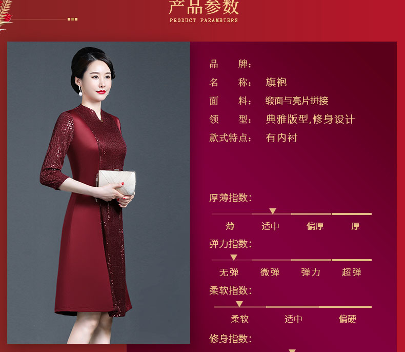 上海旗袍厂NBL-NZ207 酒红 结婚妈妈礼服年轻款丈母娘缎面与亮片拼接旗袍连衣裙婚礼婚宴装秋