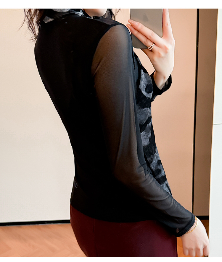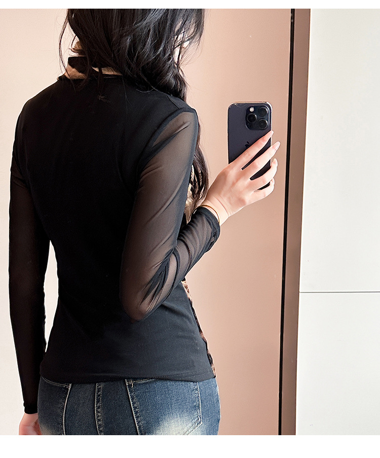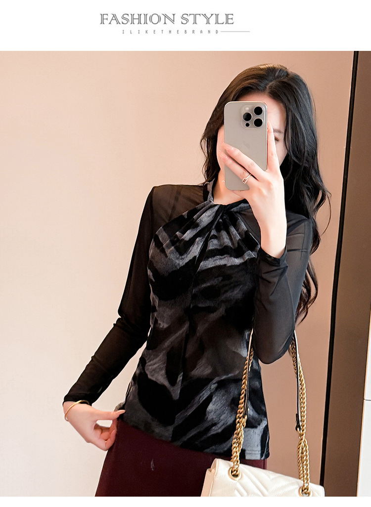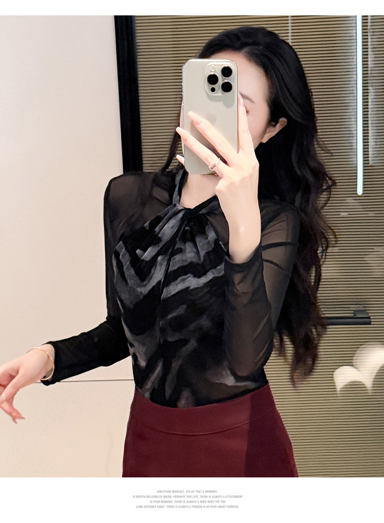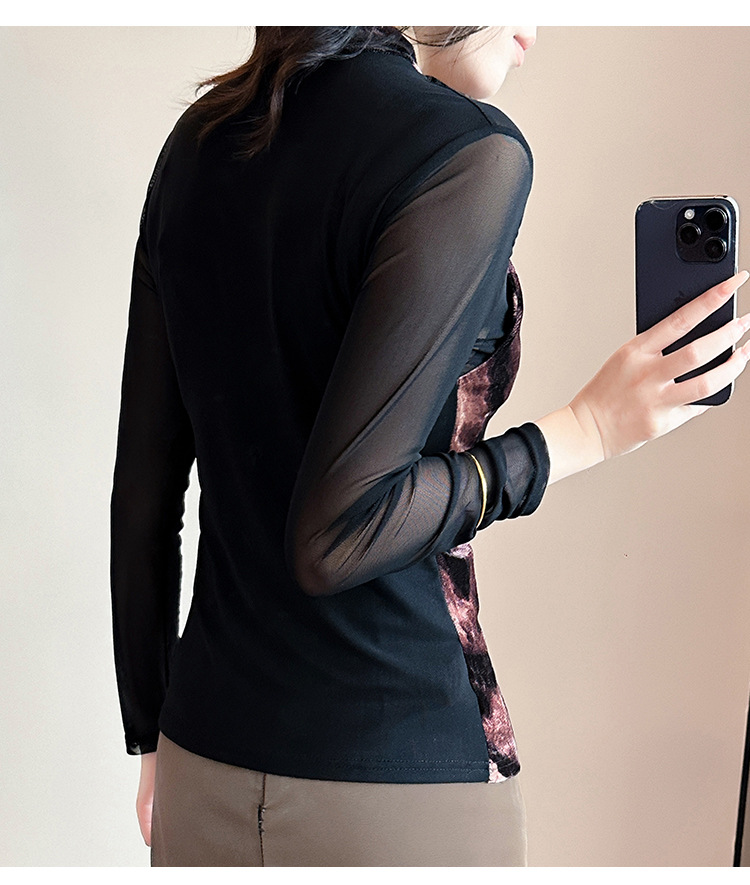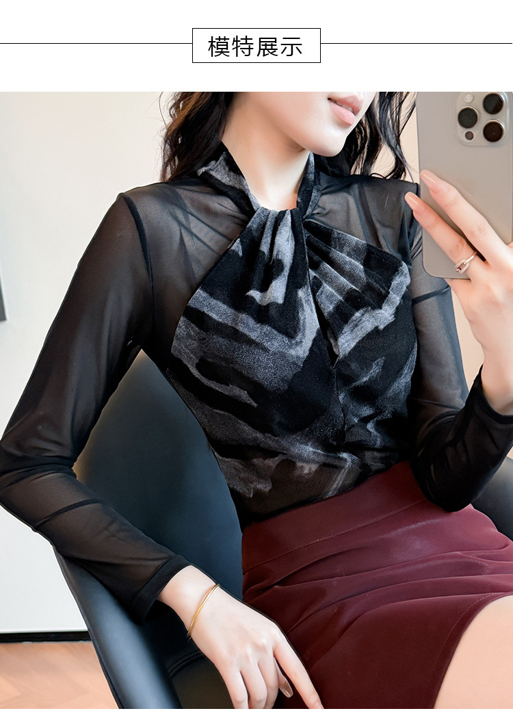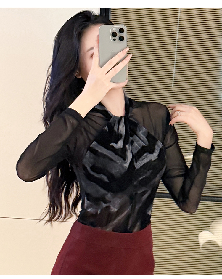 A55F87262025秋冬新款性感网纱复古印花小衫长袖上衣时尚打底衫
