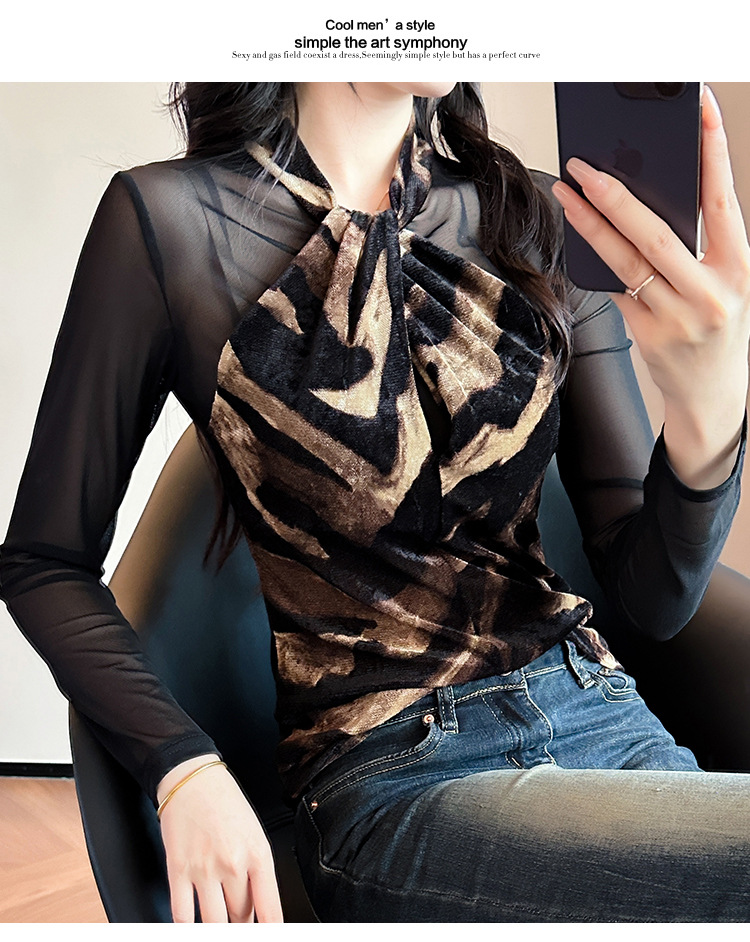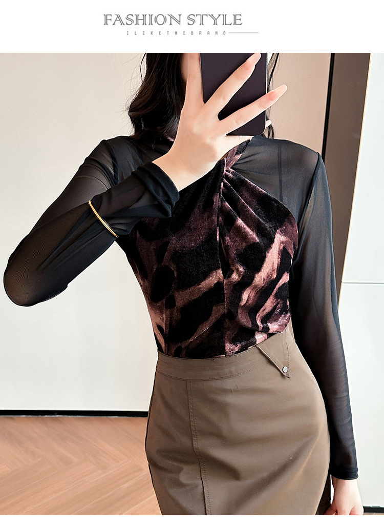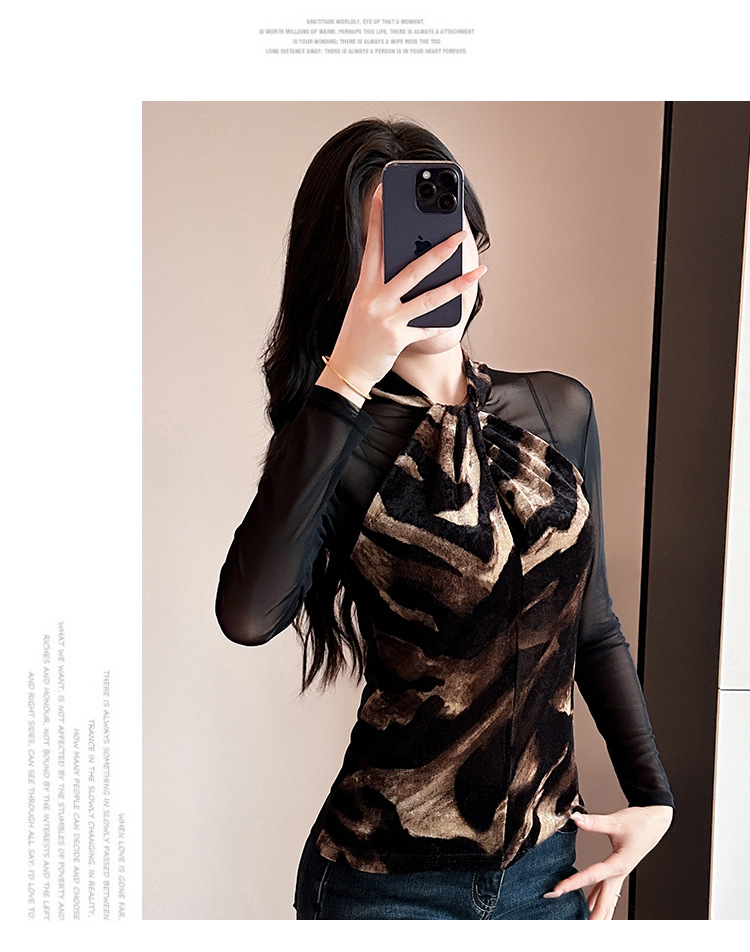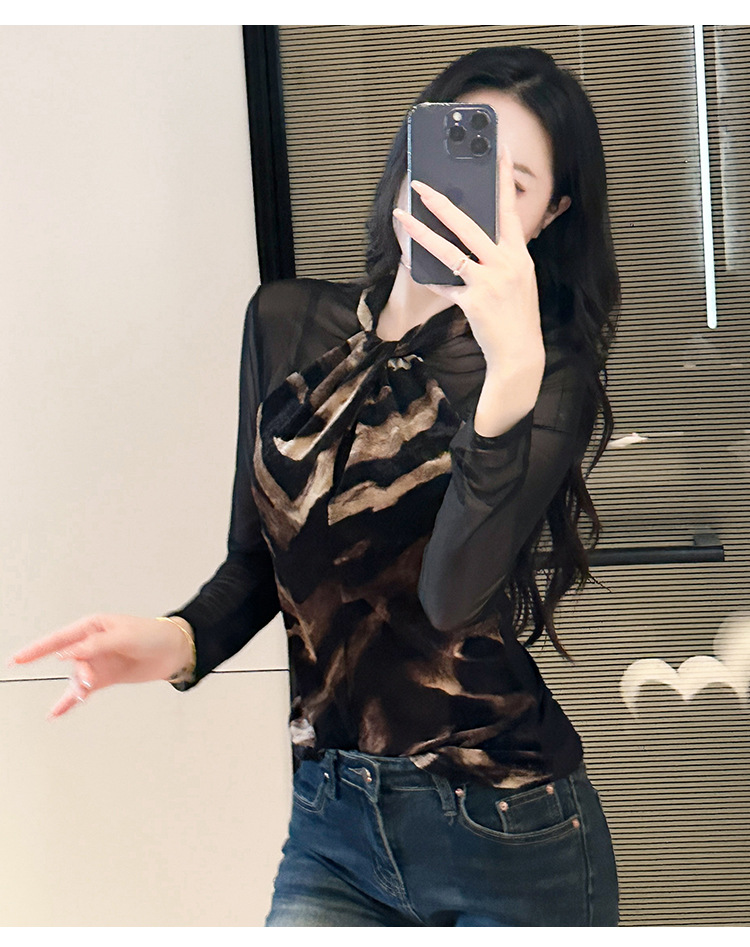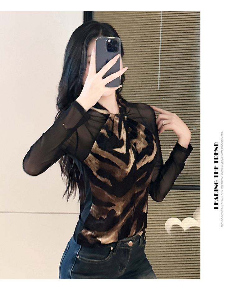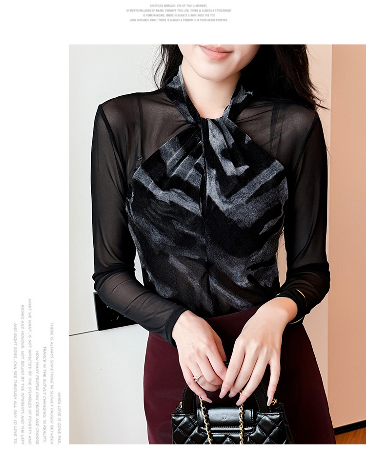A55F87262025秋冬新款性感网纱复古印花小衫长袖上衣时尚打底衫