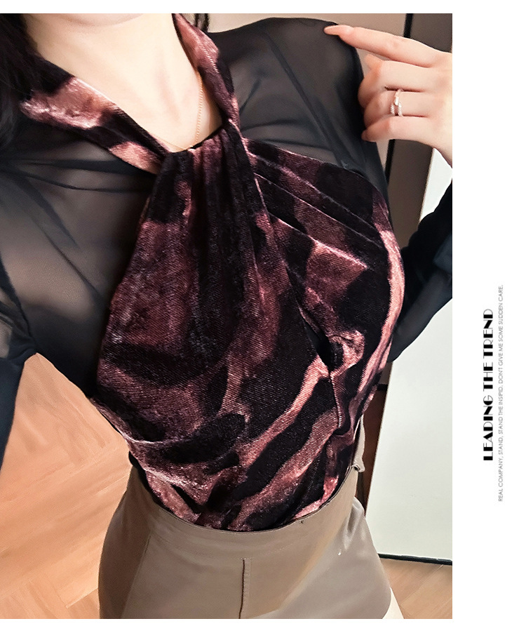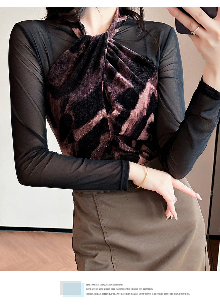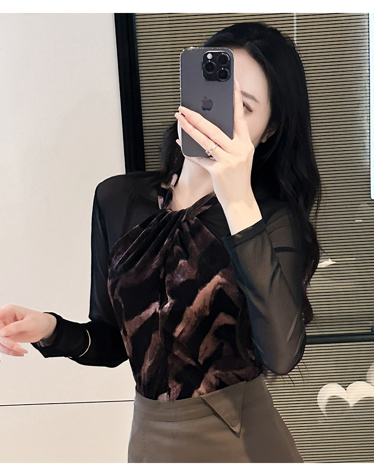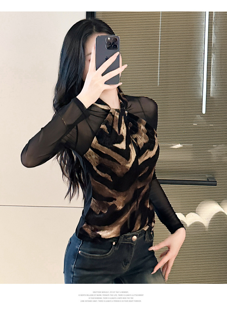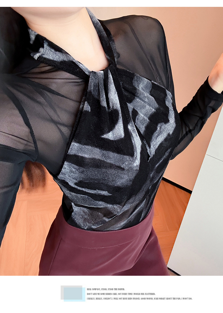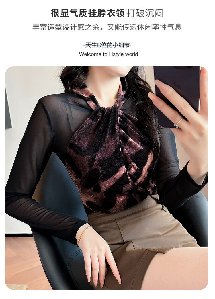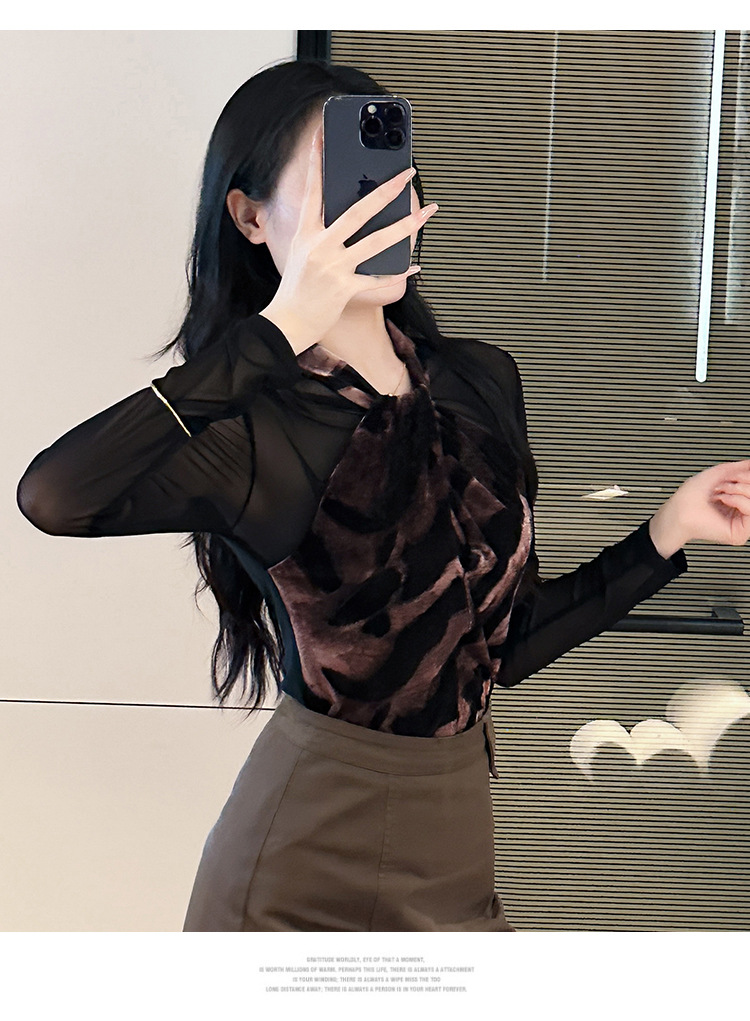 A55F87262025秋冬新款性感网纱复古印花小衫长袖上衣时尚打底衫