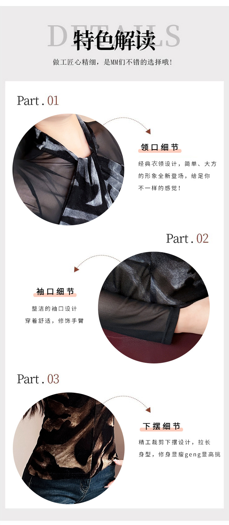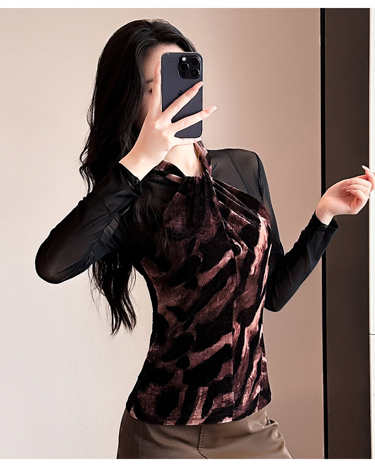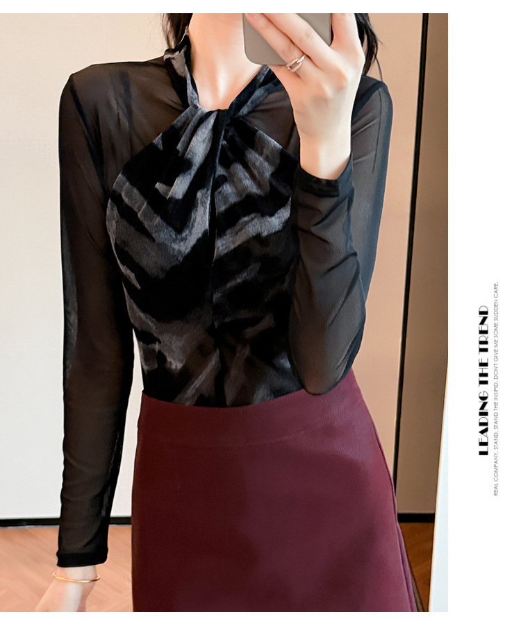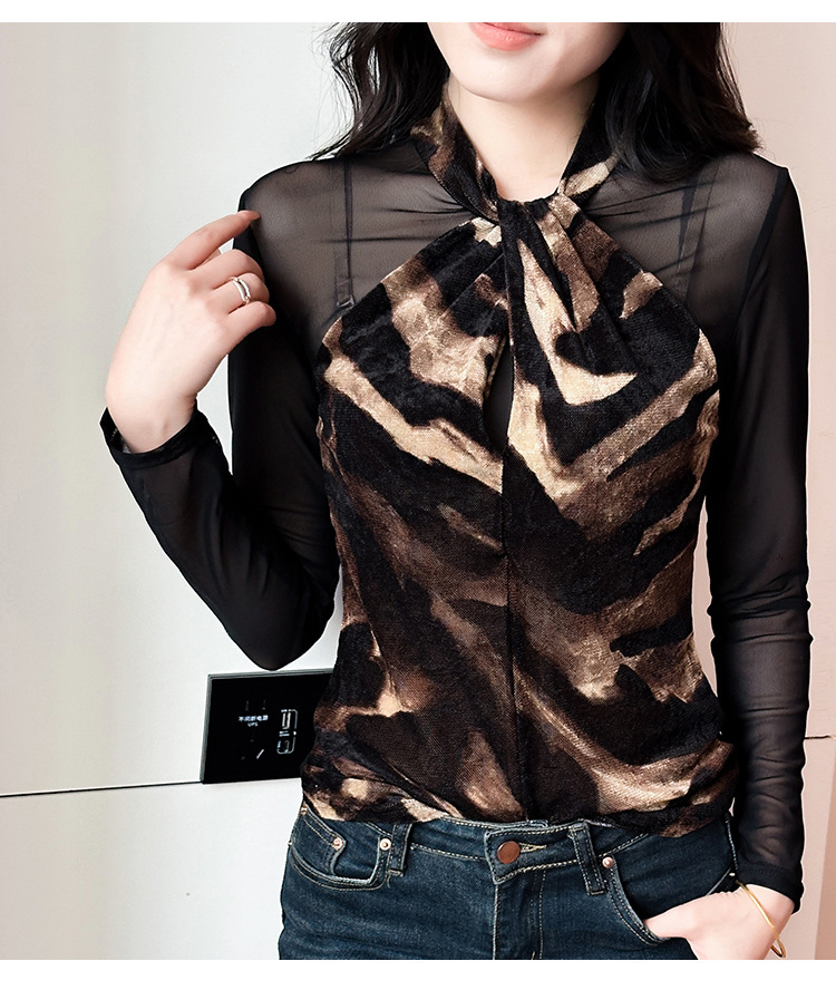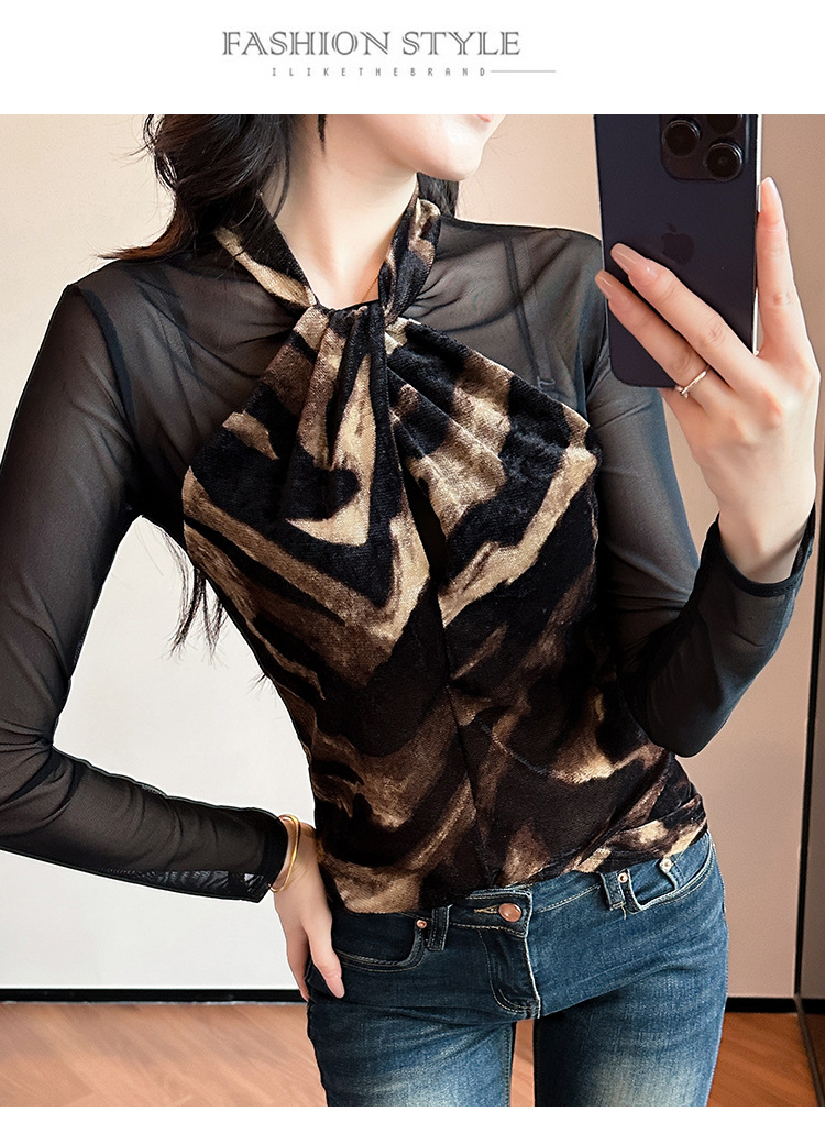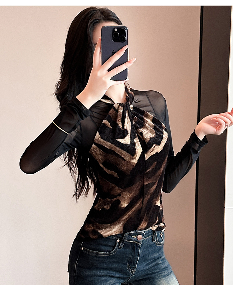 A55F87262025秋冬新款性感网纱复古印花小衫长袖上衣时尚打底衫