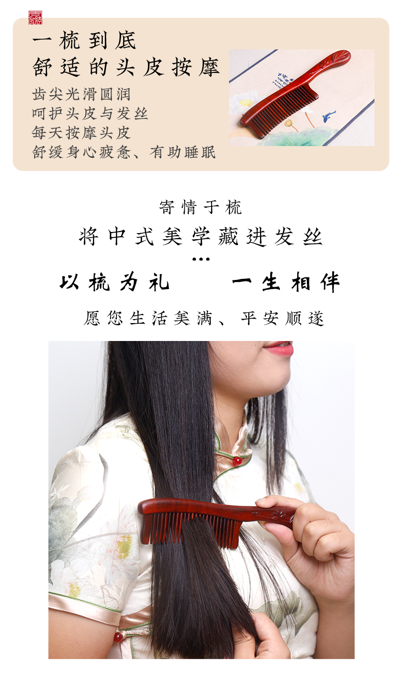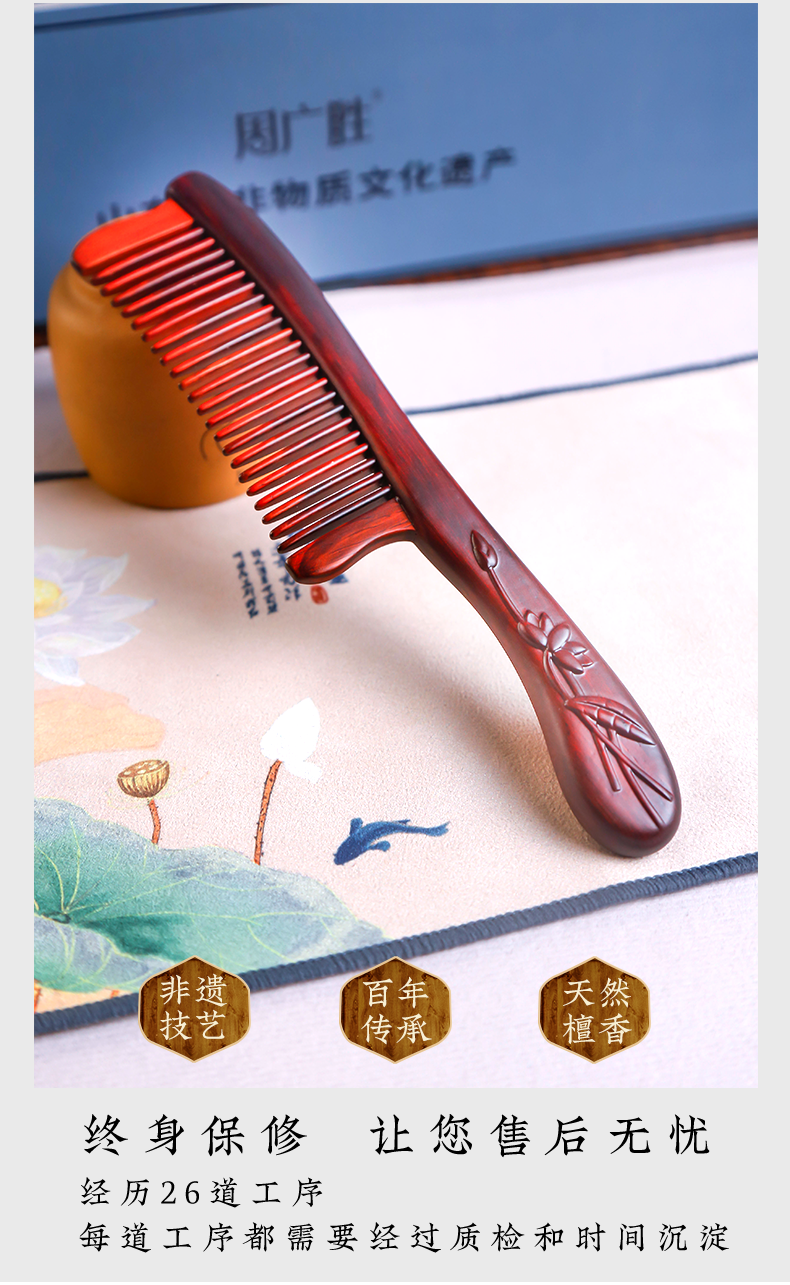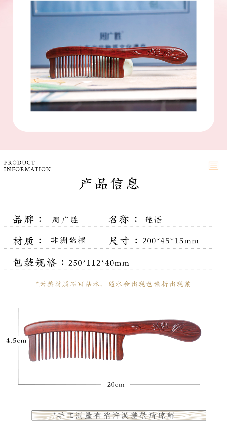 周广胜紫檀雕花礼盒镶齿木梳莲语女士专用头皮经络按摩护发