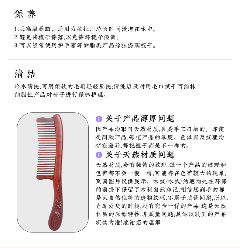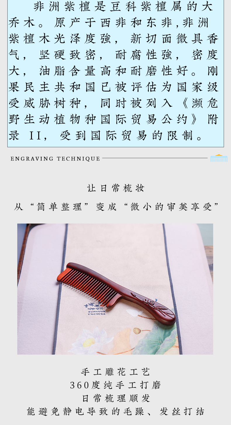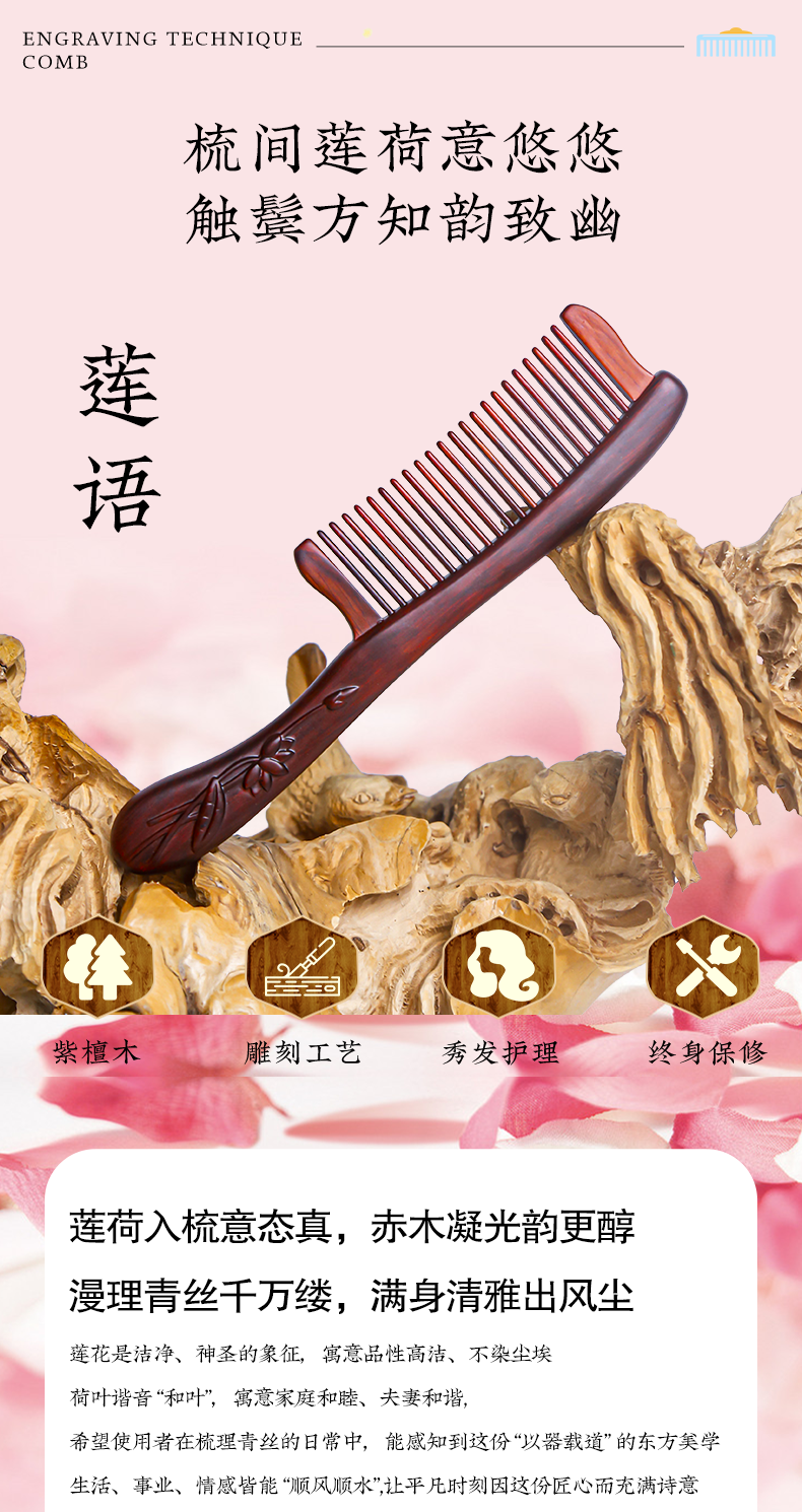 周广胜紫檀雕花礼盒镶齿木梳莲语女士专用头皮经络按摩护发
