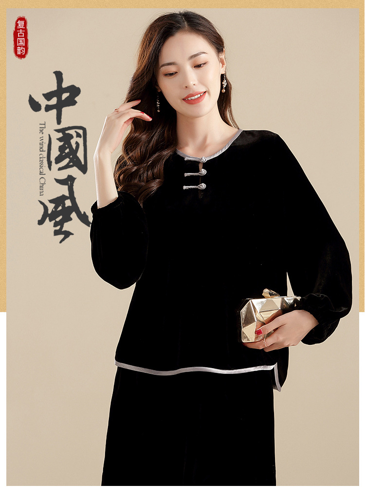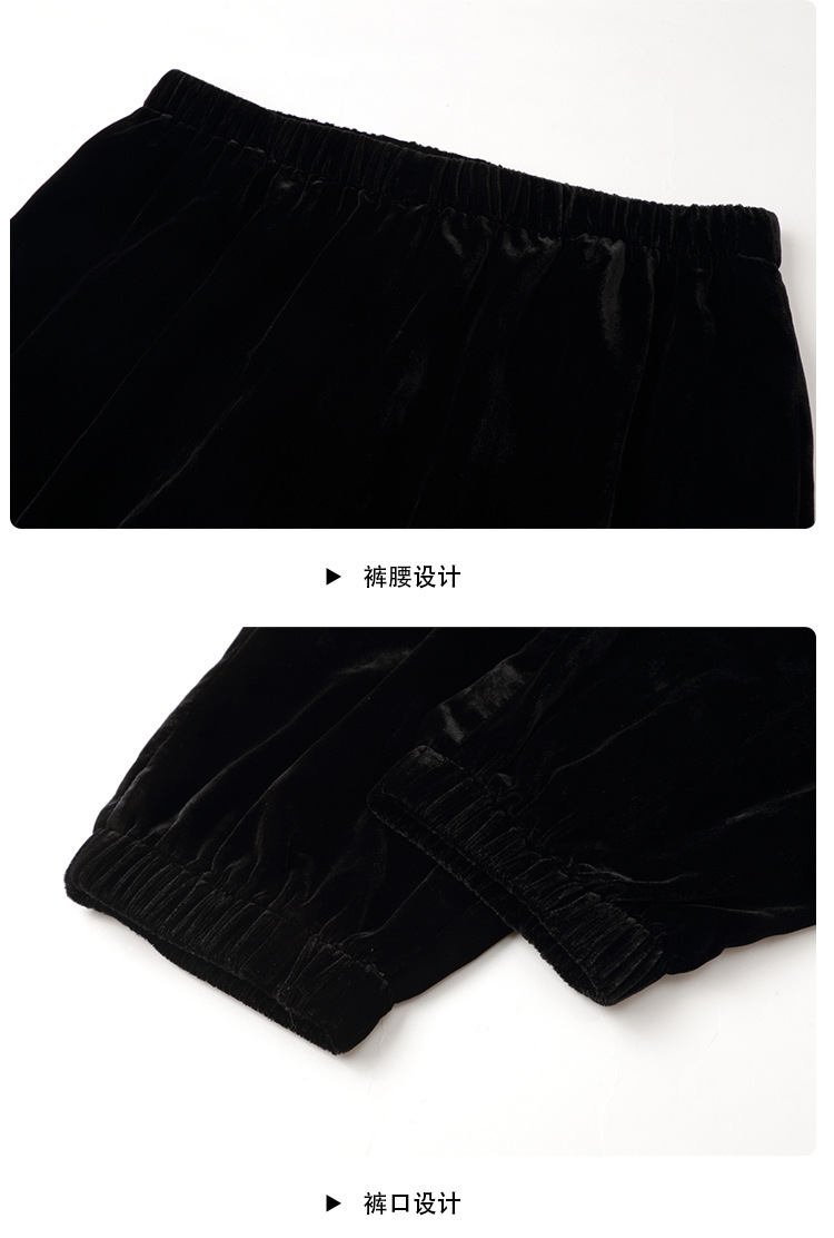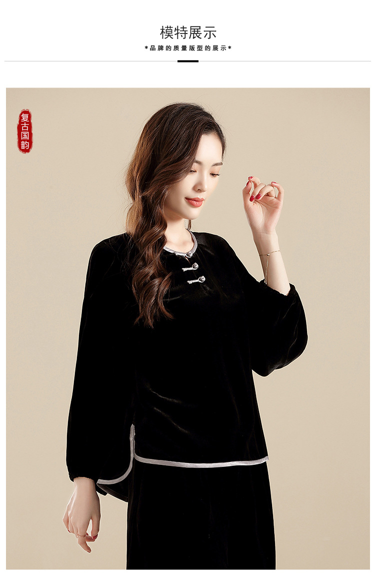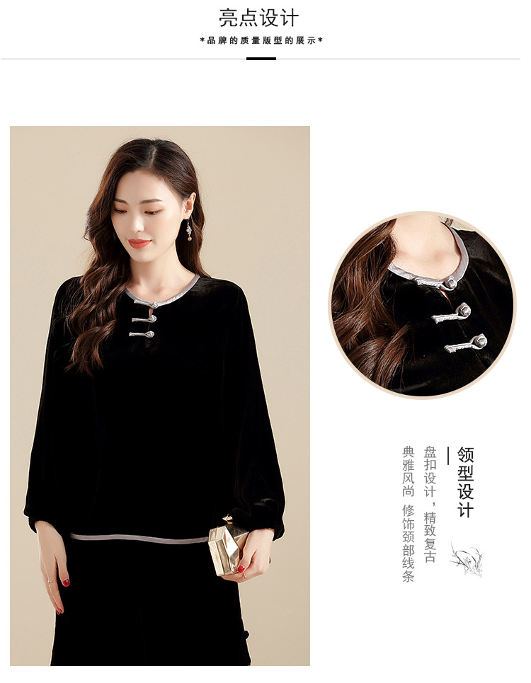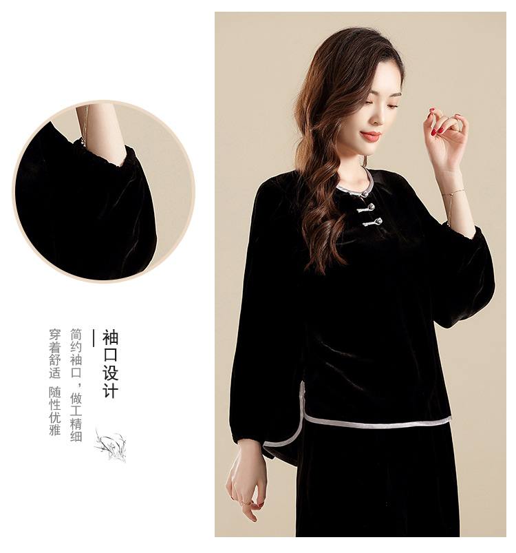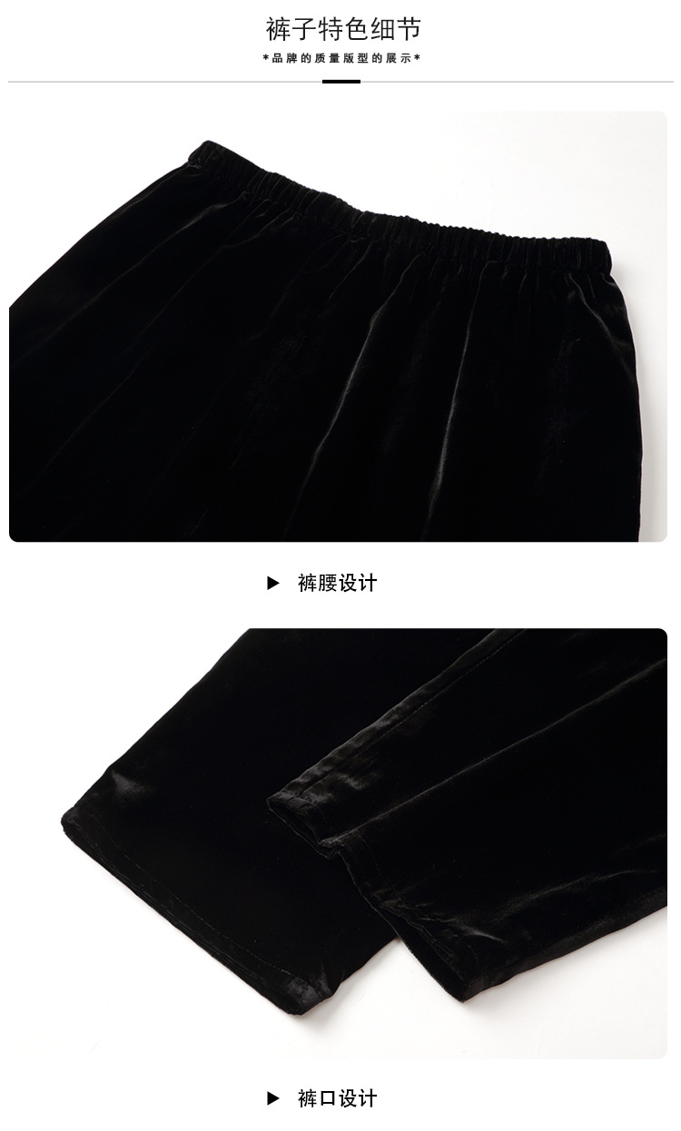 上海旗袍厂AYK-QF-210722净色真丝丝绒宽松圆领长袖上衣女+长裤女2021复古新款女装套装女