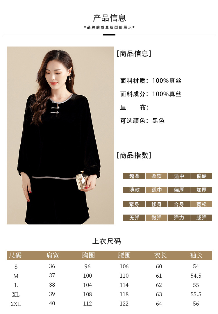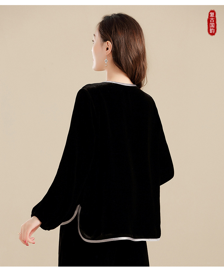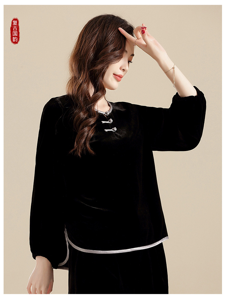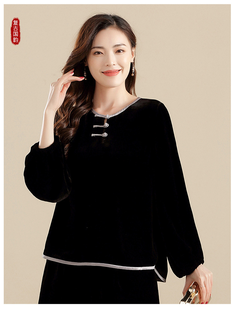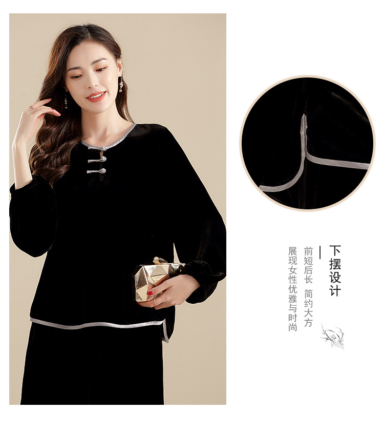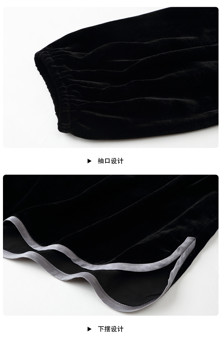 上海旗袍厂AYK-QF-210722净色真丝丝绒宽松圆领长袖上衣女+长裤女2021复古新款女装套装女