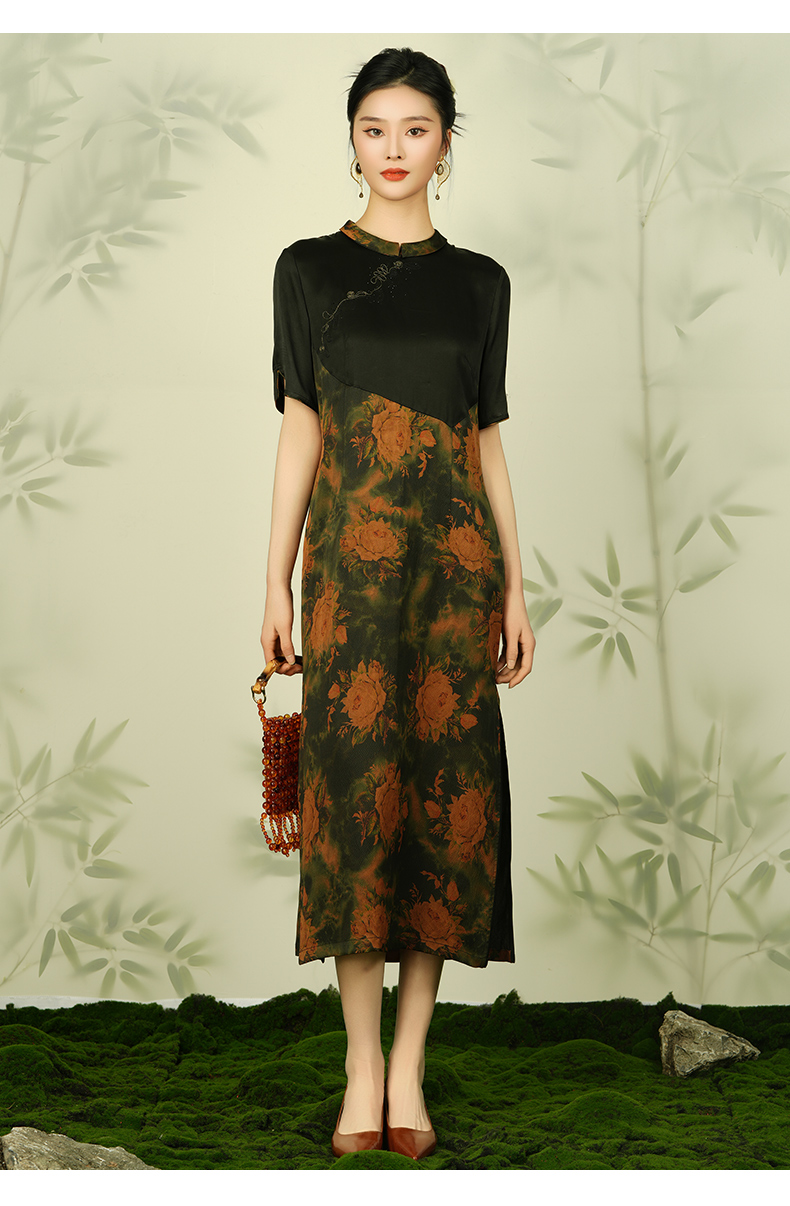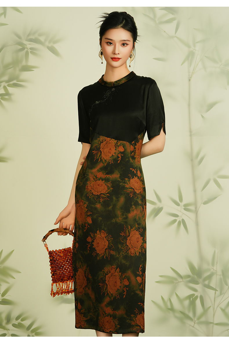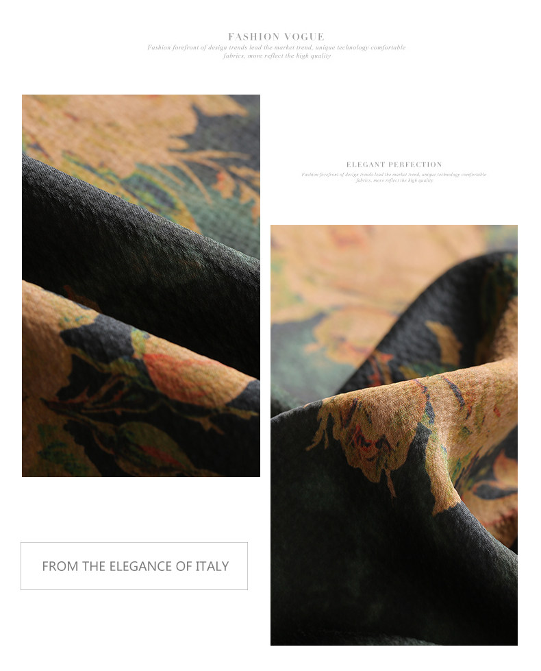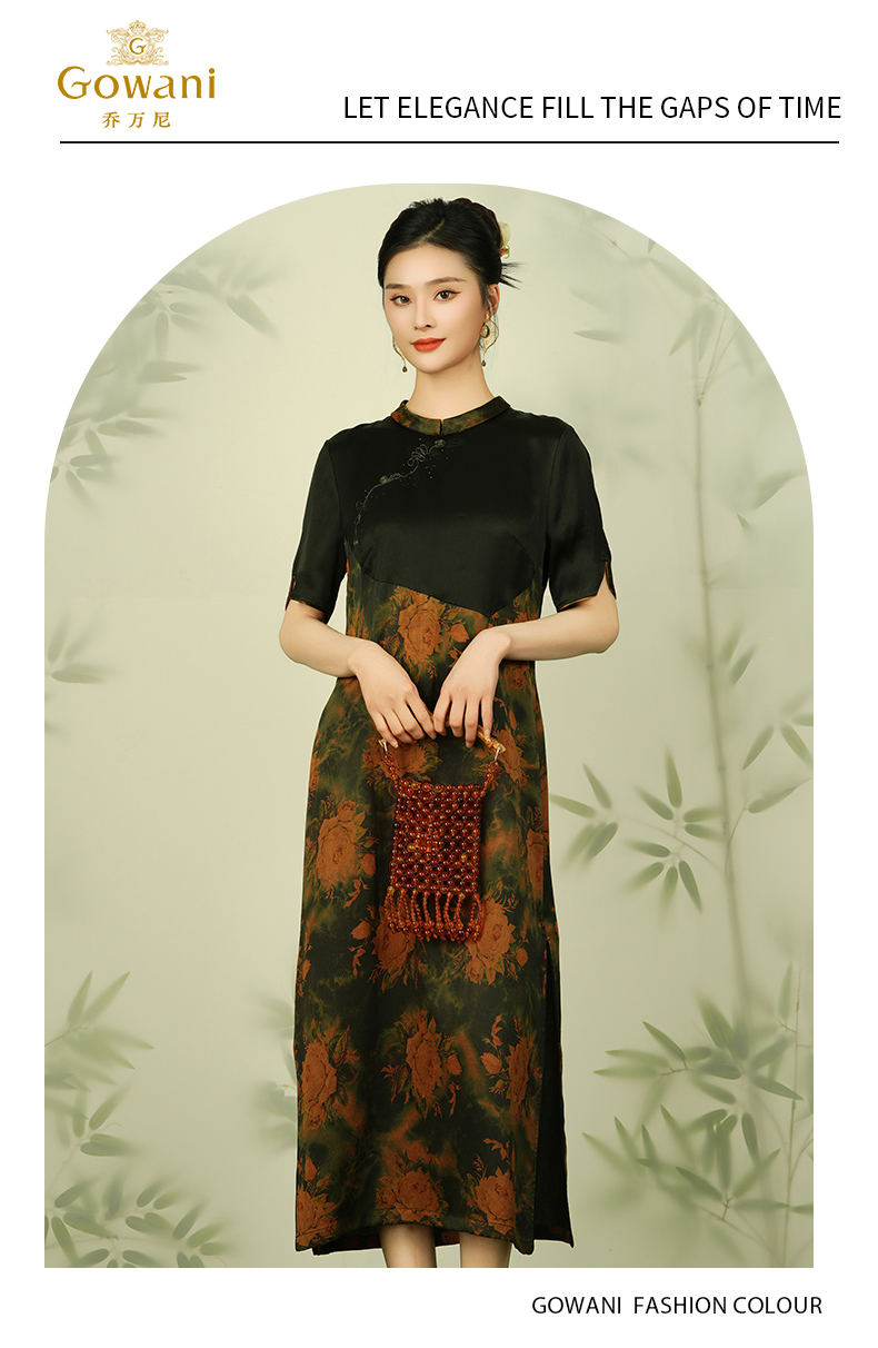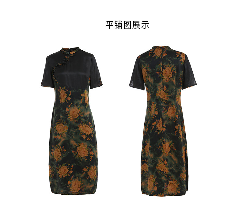 【黄色复古花】【香云纱】乔万尼新款夏重磅真丝桑蚕丝连衣裙拼接复古印花长裙ES2E123