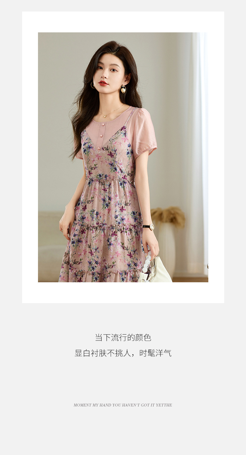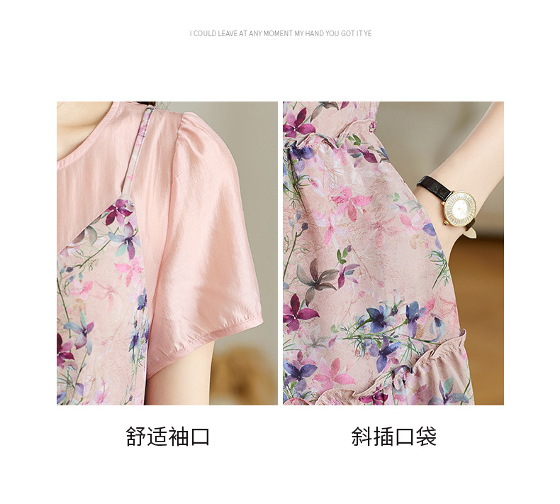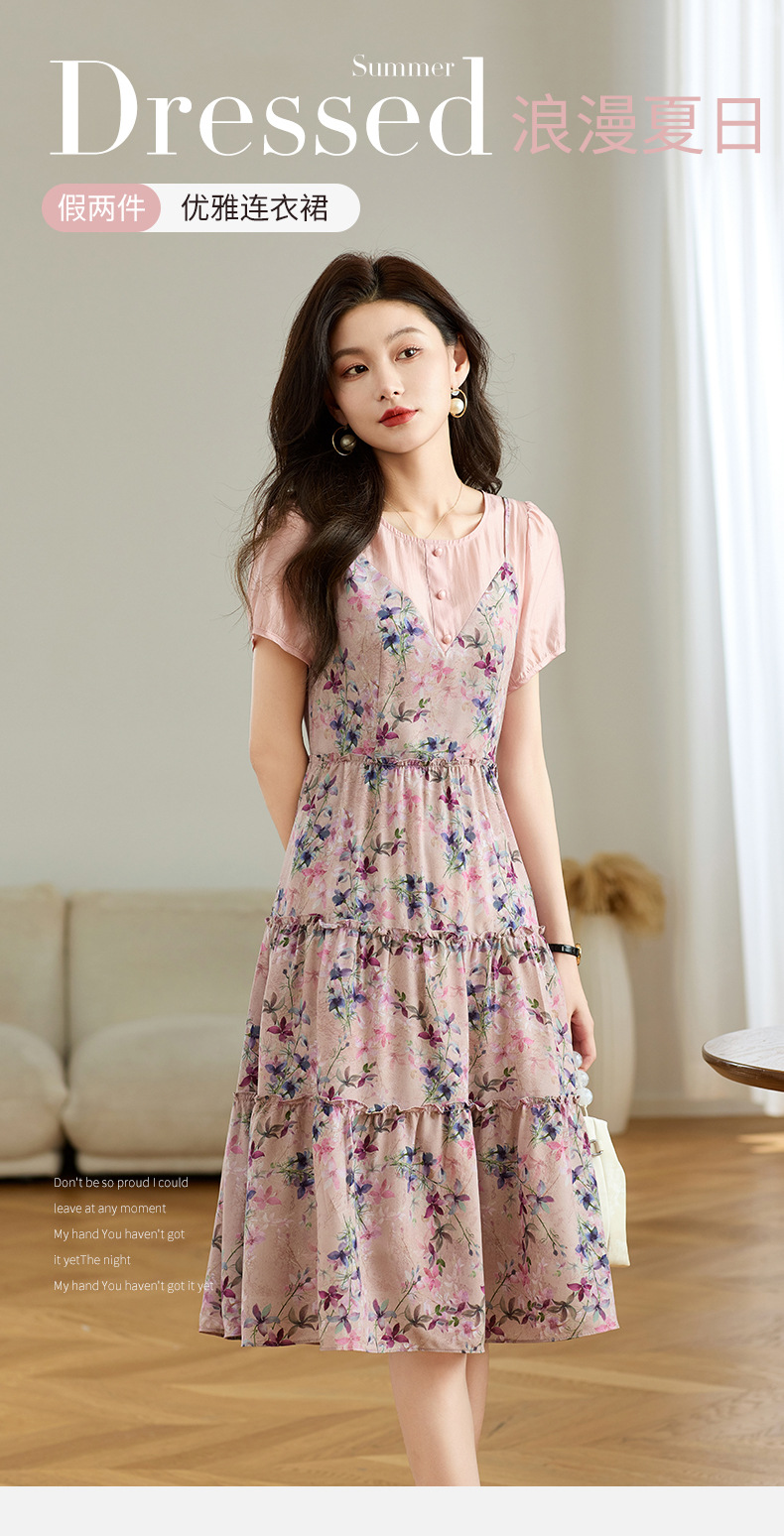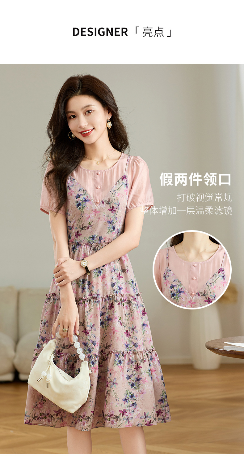 圆领短袖吊带假两件连衣裙,时尚印花裙A字裙QYM-TB-FD1970-Y