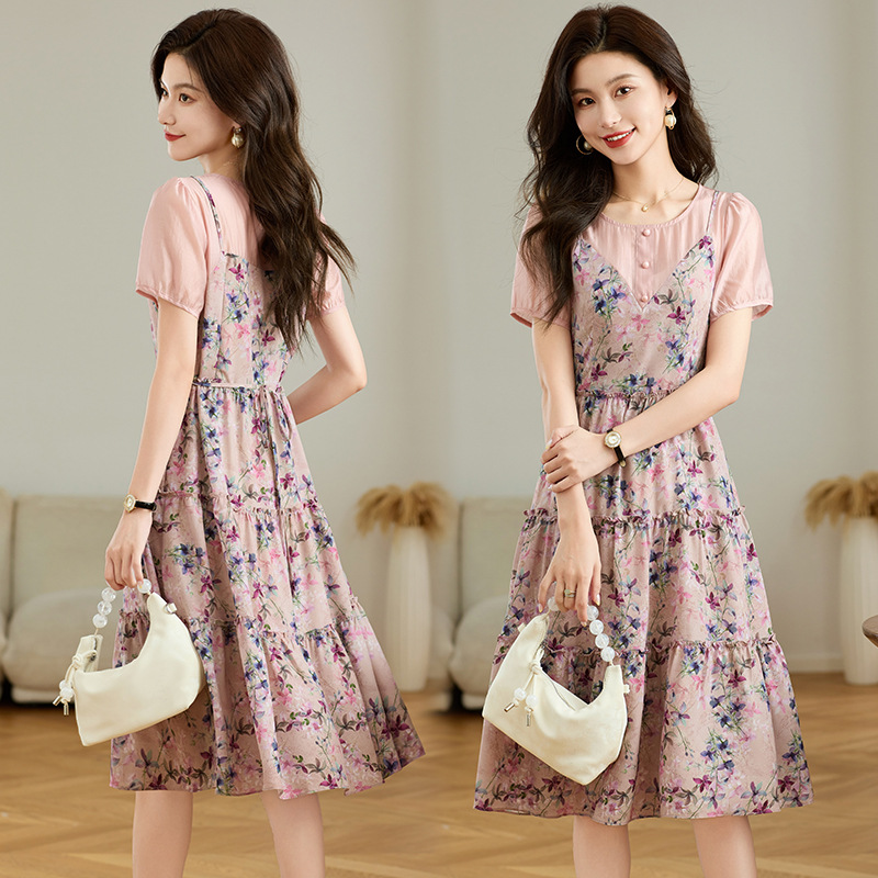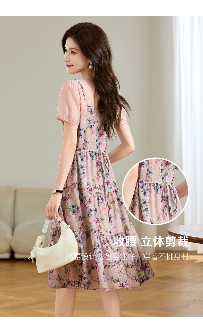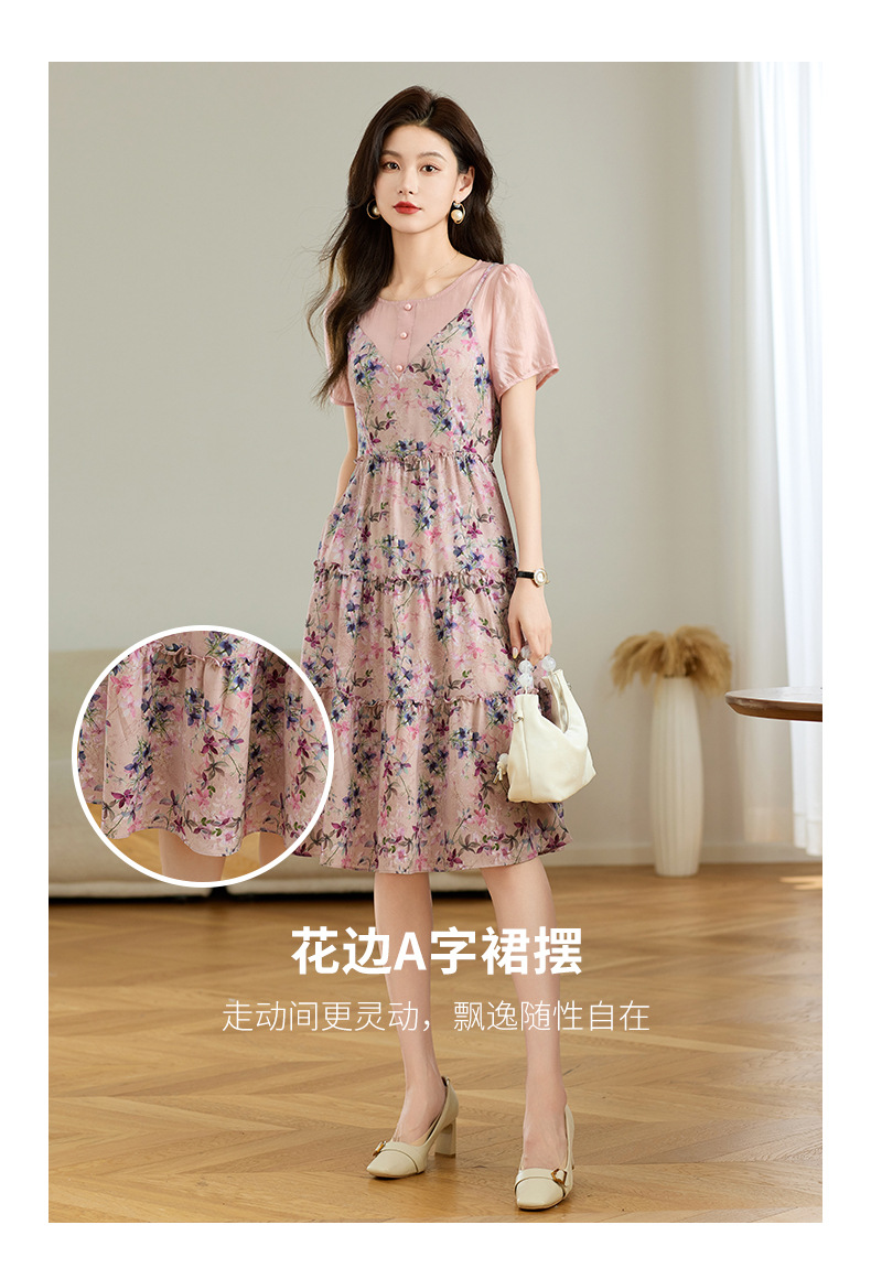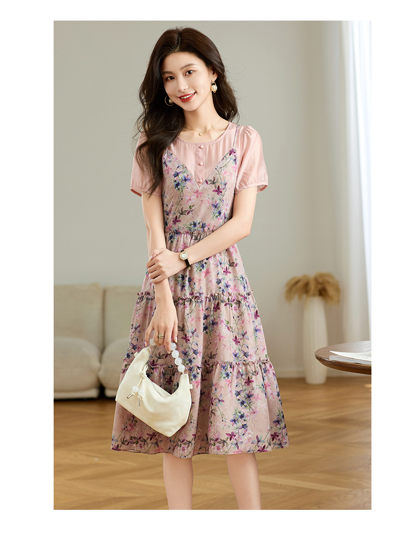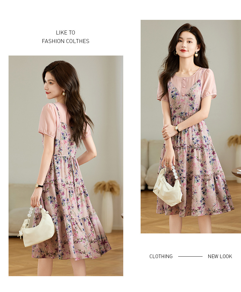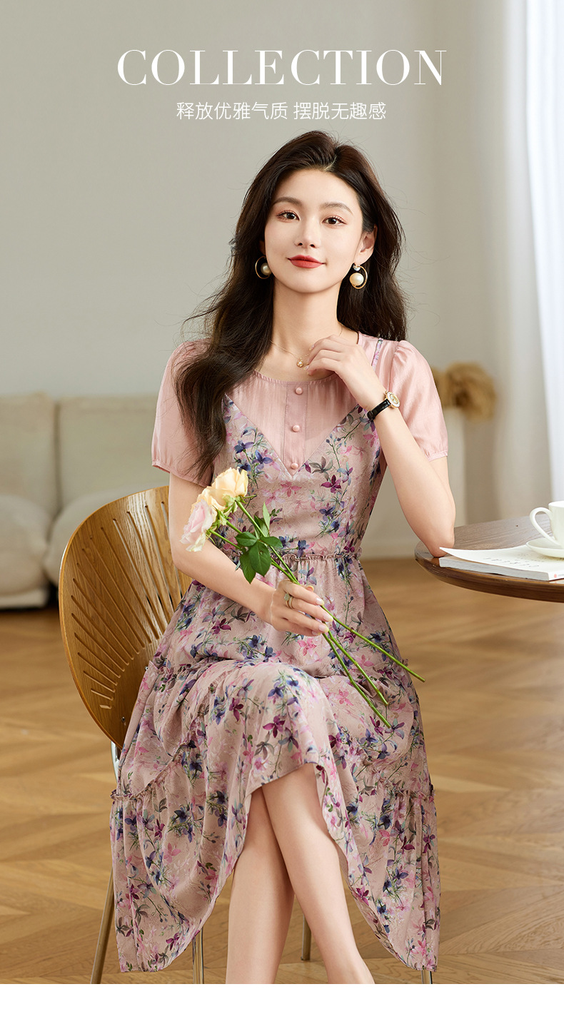 圆领短袖吊带假两件连衣裙,时尚印花裙A字裙QYM-TB-FD1970-Y