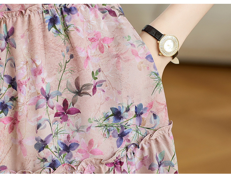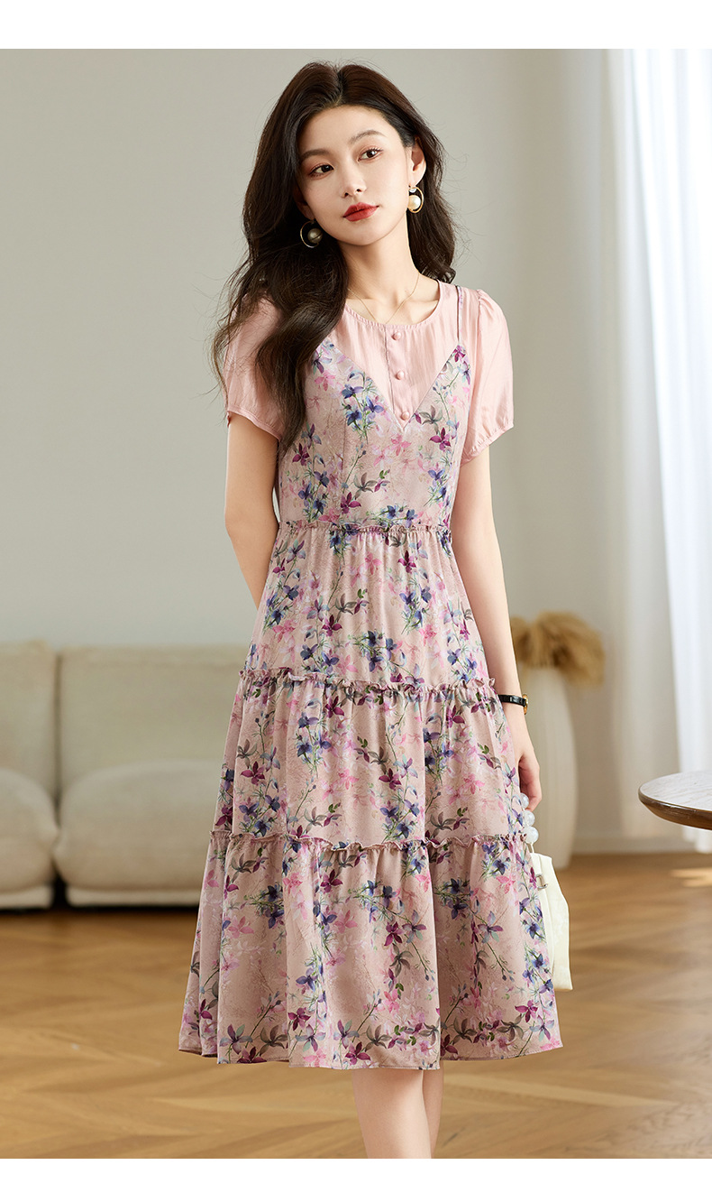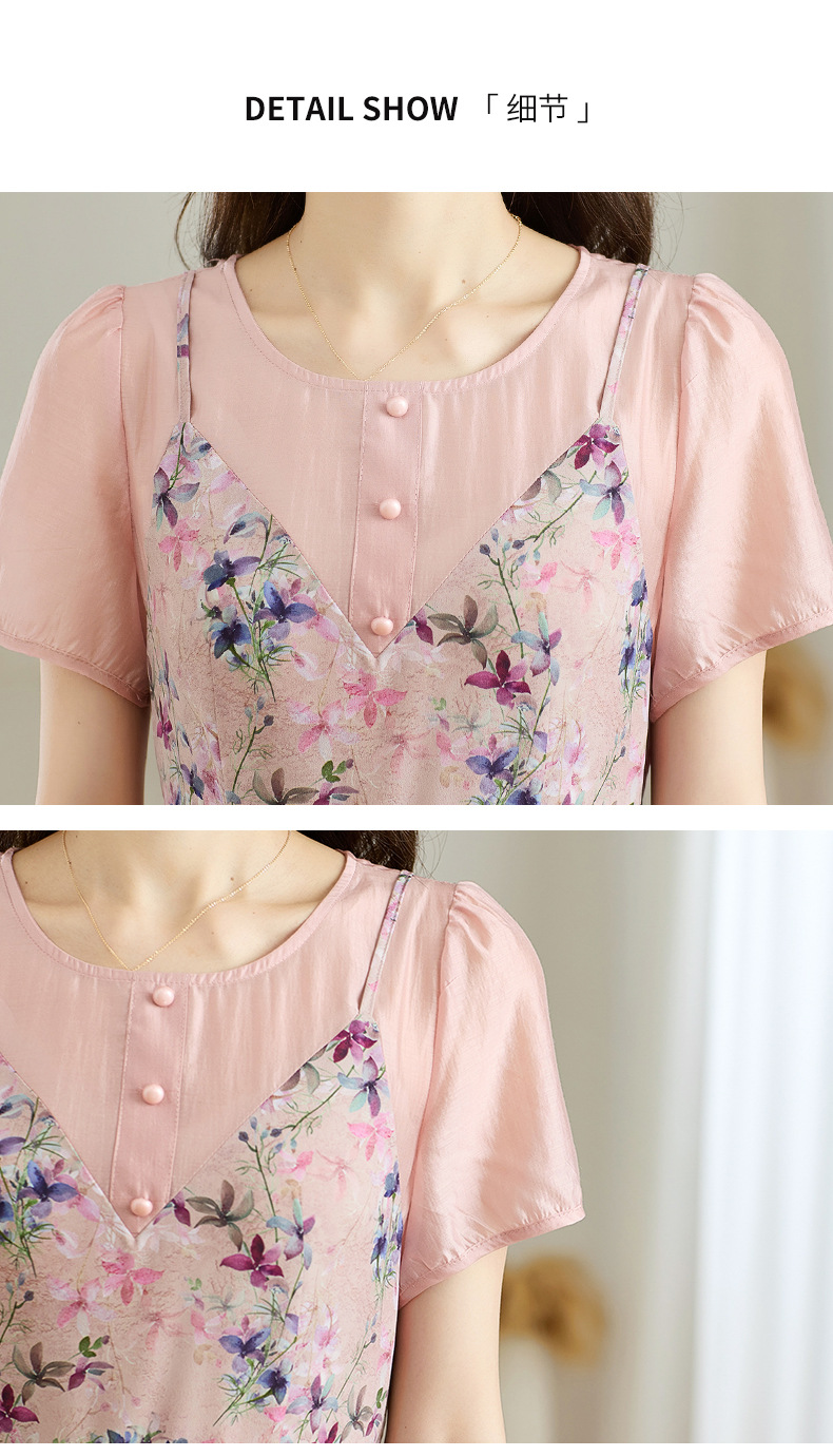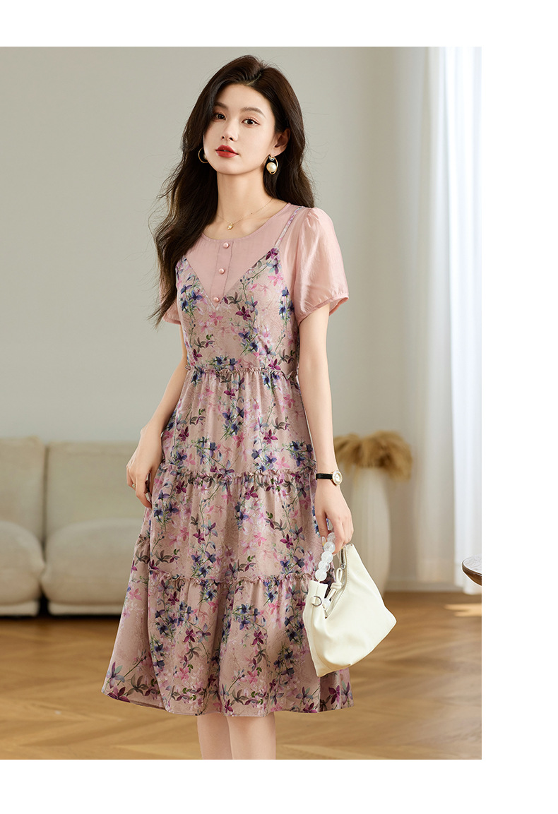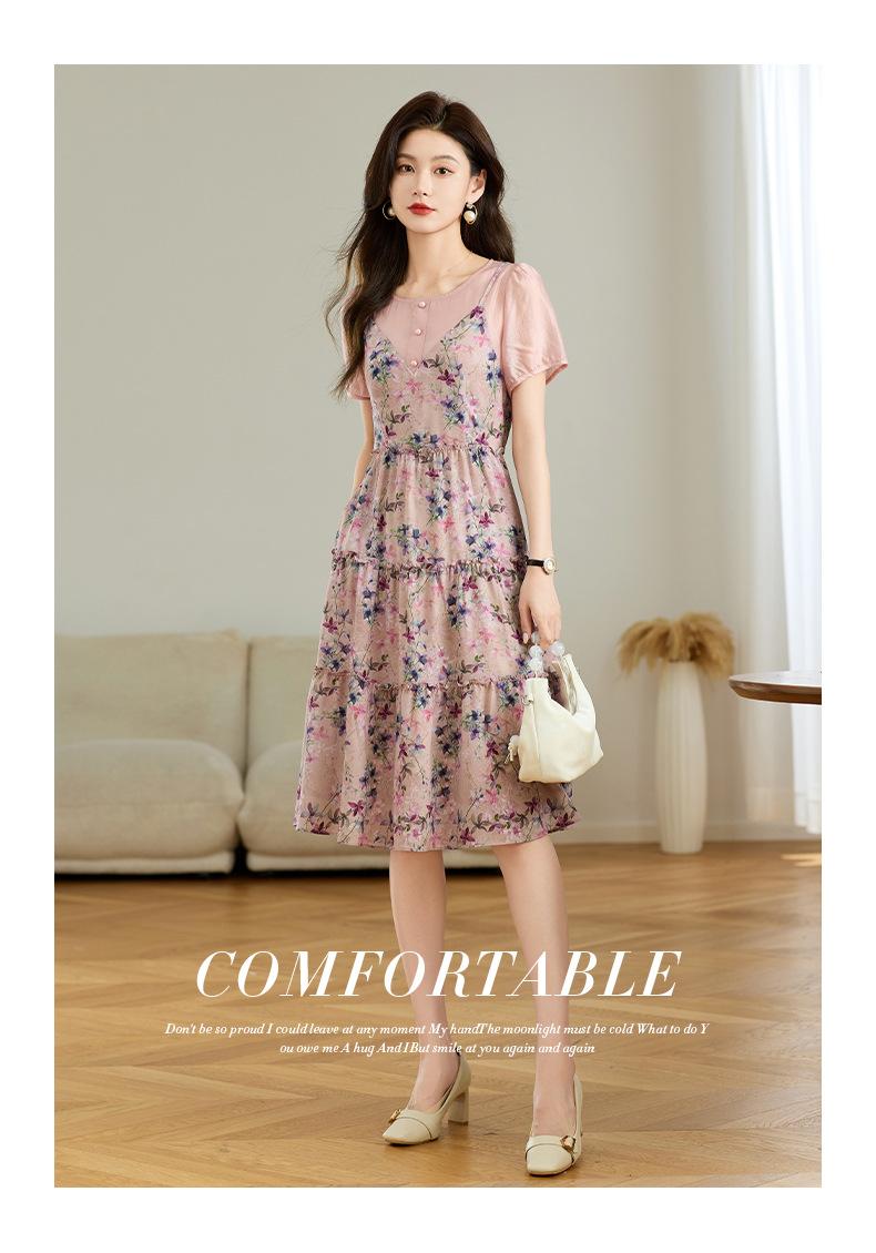 圆领短袖吊带假两件连衣裙,时尚印花裙A字裙QYM-TB-FD1970-Y
