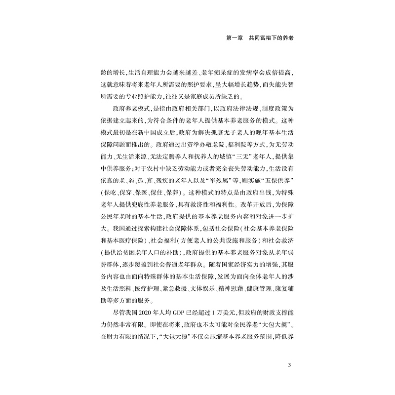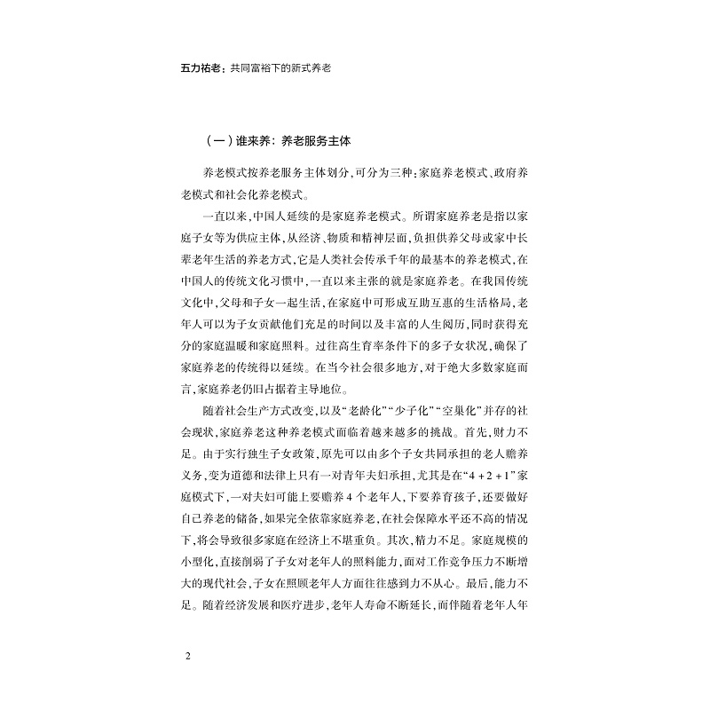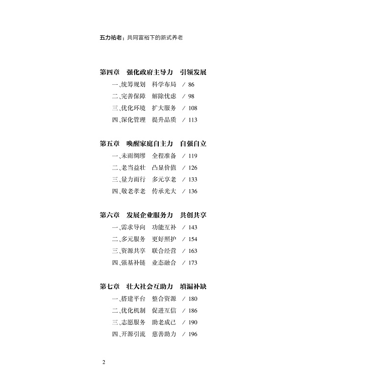 在老龄化不断加深的背景下,养老需求日益多元,特别是共同富裕的提出,赋予了养老以新的内涵。本书根据国家对老龄事业和养老服务体系发展的指导思想,以共同富裕为背景,对如何实现老年人“幸福颐养”进行积极思考和创新探索。本书揭示了主要的养老模式与养老服务、不同人群的养老需求特征以及共富下养老产生的新特点;分析了共同富裕与养老服务的相互关系,构建了“五力祐老”模式,按照政府、家庭、企业、社会、科技五大路径进行策略分析,着力探讨如何通过强化政府主导力、唤醒家庭自主力、优化企业服务力、壮大社会协同力、激活科技支撑力,五力相辅相成,共同推进老龄友好社会和多元化优质养老服务体系建设,护祐老年人欢度晚年。