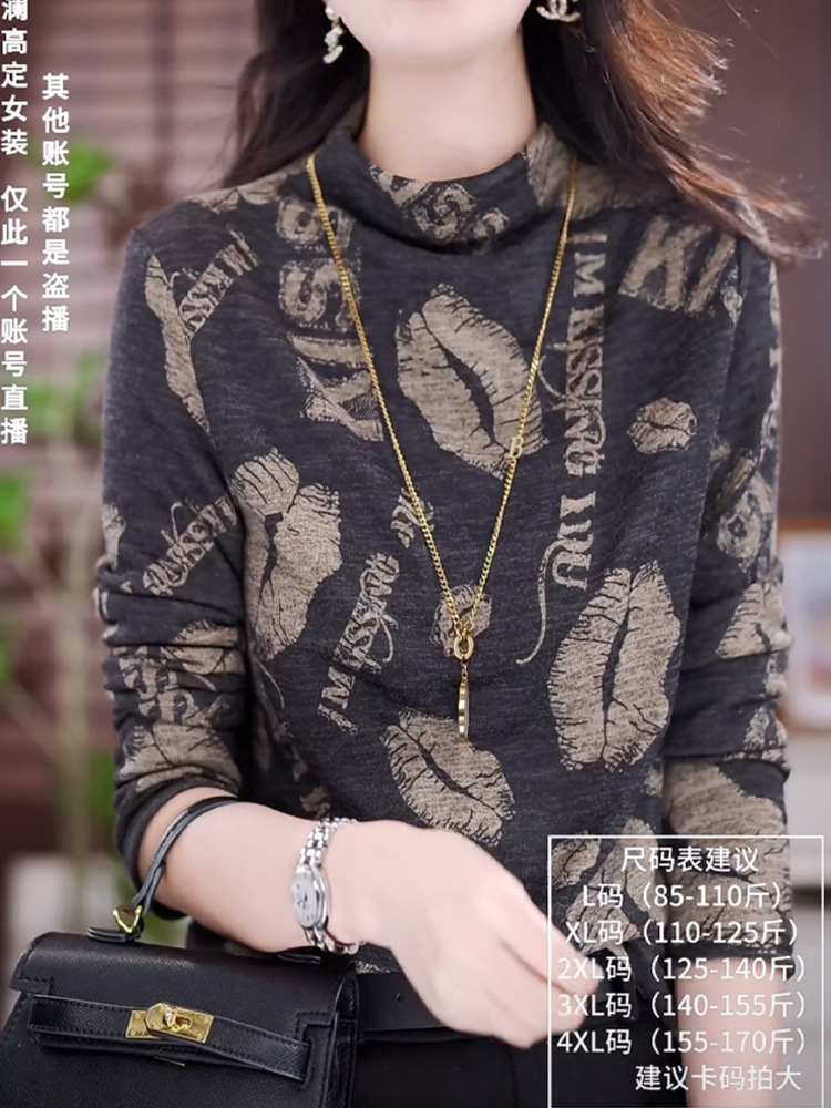 德绒打底衫女士妈妈款秋冬装内搭洋气高端印花小衫半高领长袖上衣