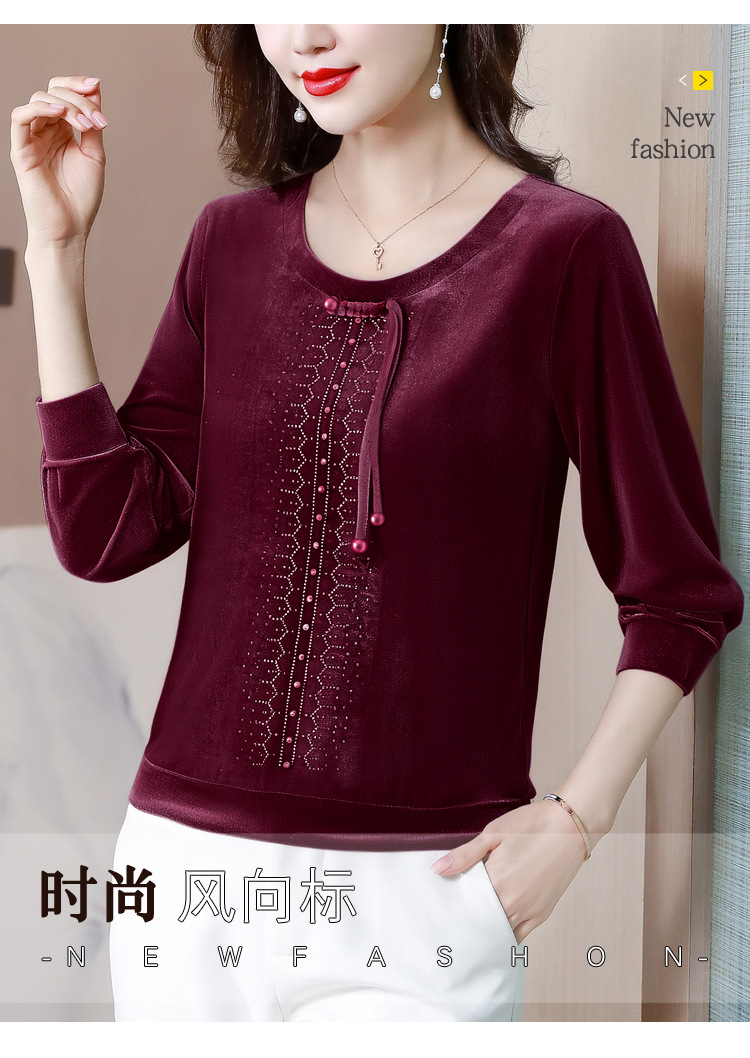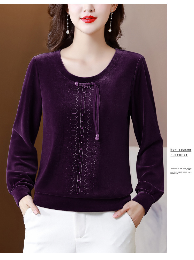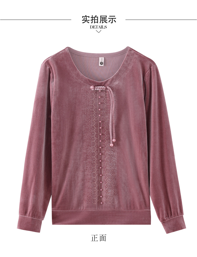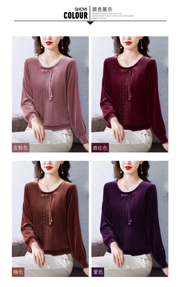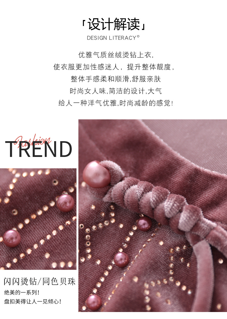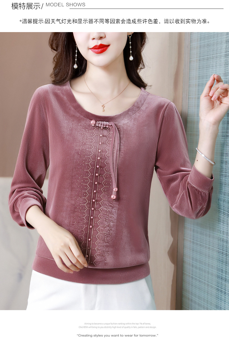 KQL 356H9239新中式国风金丝绒烫钻打底衫气质小衫