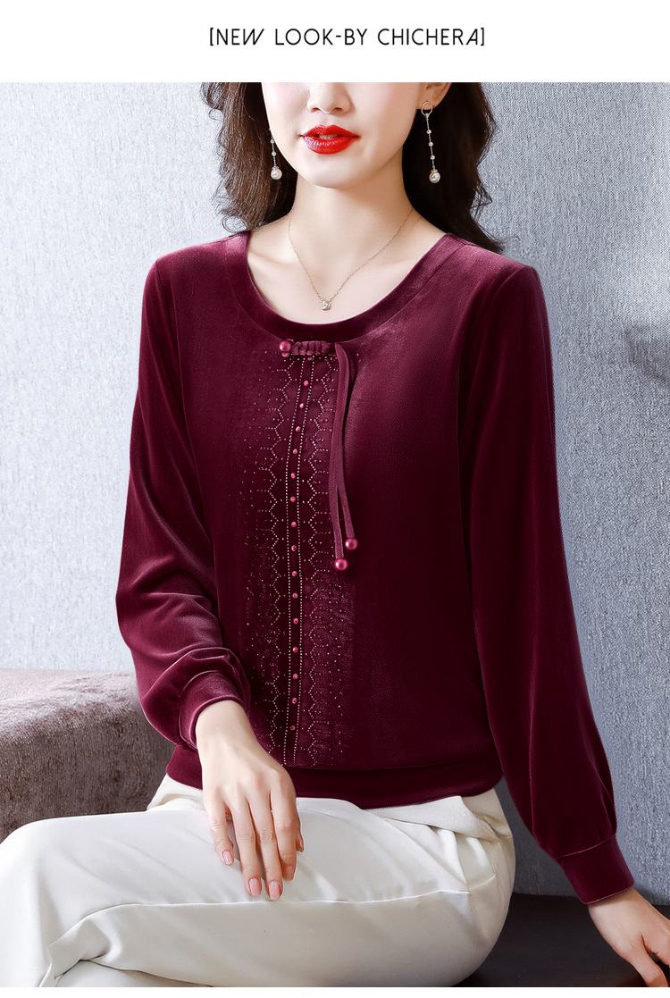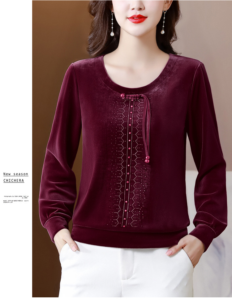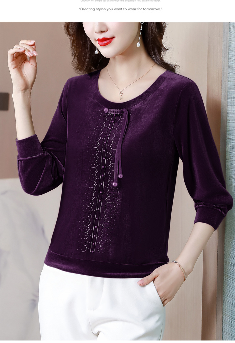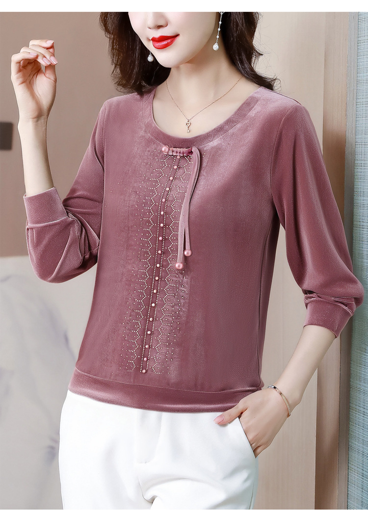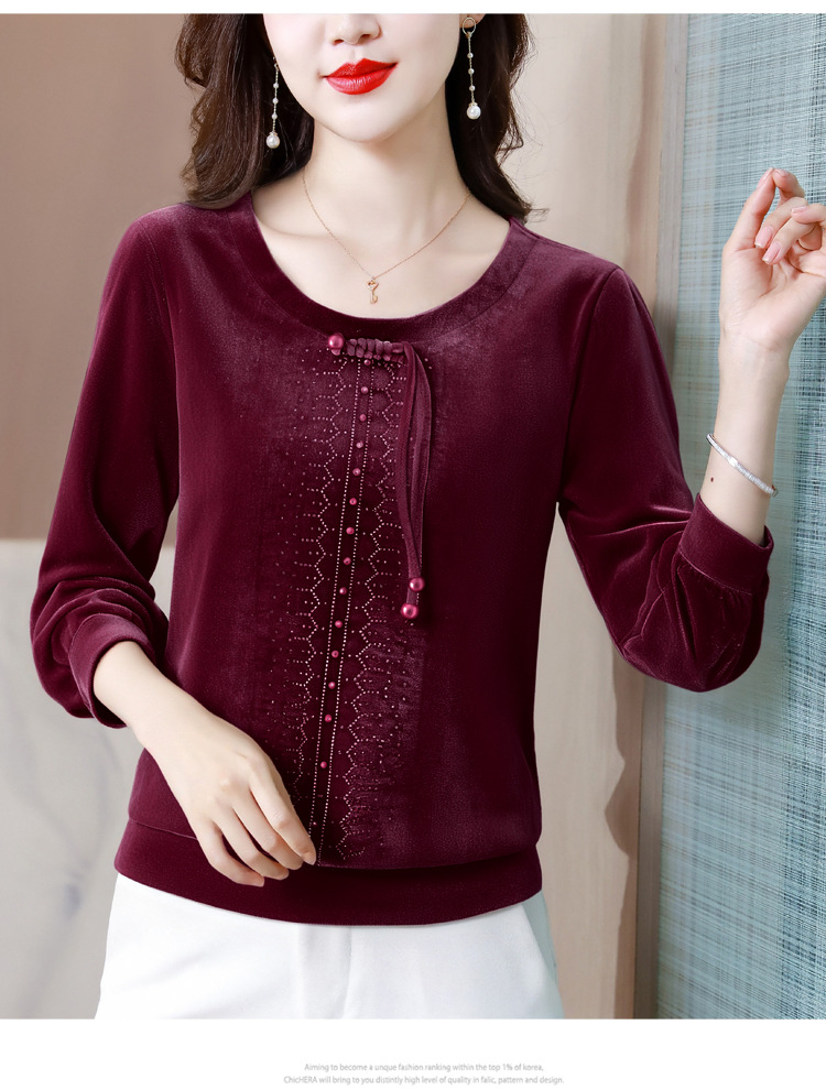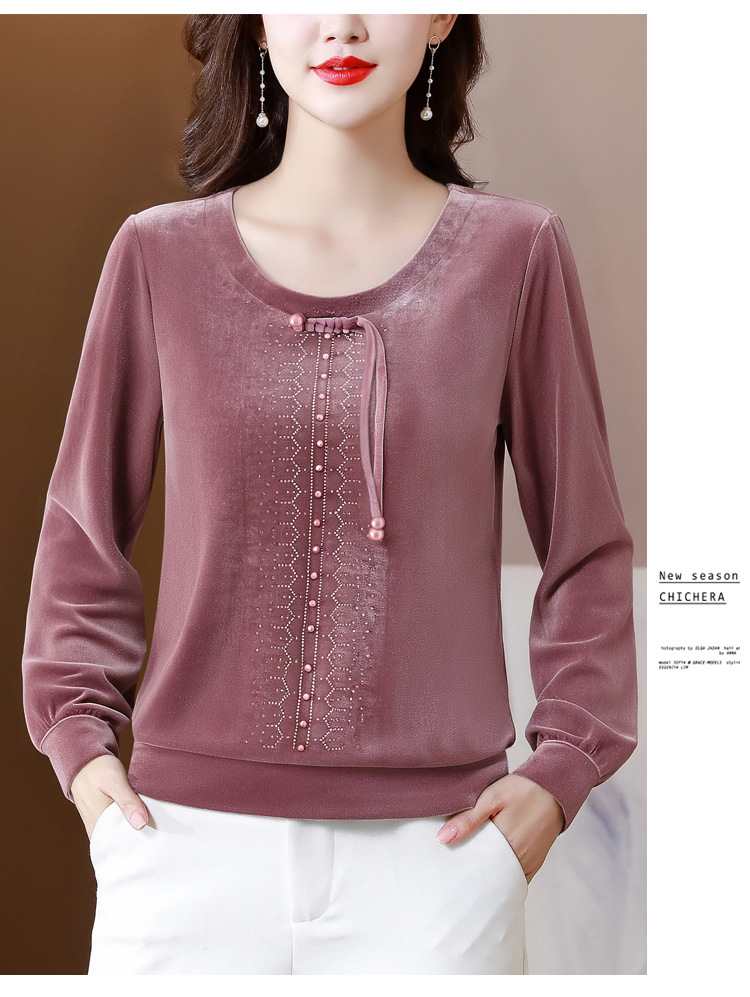 KQL 356H9239新中式国风金丝绒烫钻打底衫气质小衫