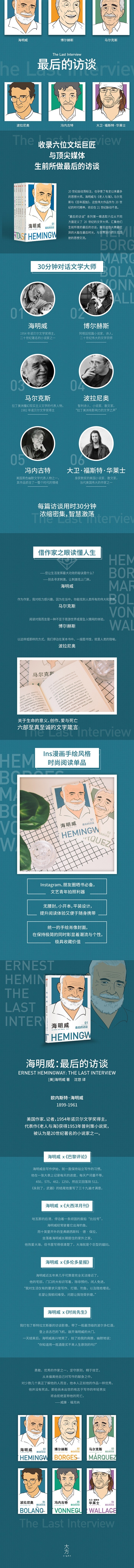 “最后的访谈”系列辑,收录六位二十世纪文坛巨匠(海明威、博尔赫斯、马尔克斯、波拉尼奥、冯内古特、大卫•福斯特•华莱士)与国际媒体生前所做后的访谈。