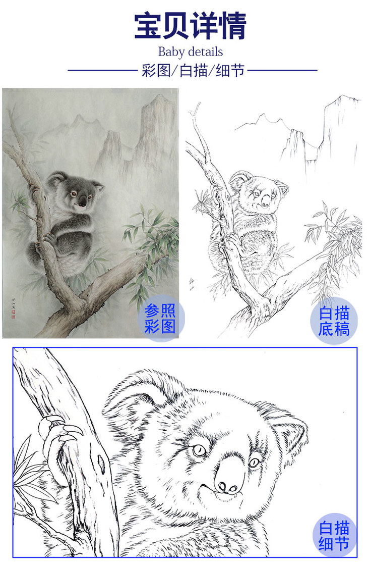 竖幅工笔动物白描底稿-李保山-考拉-多种白描尺寸可选-EL18