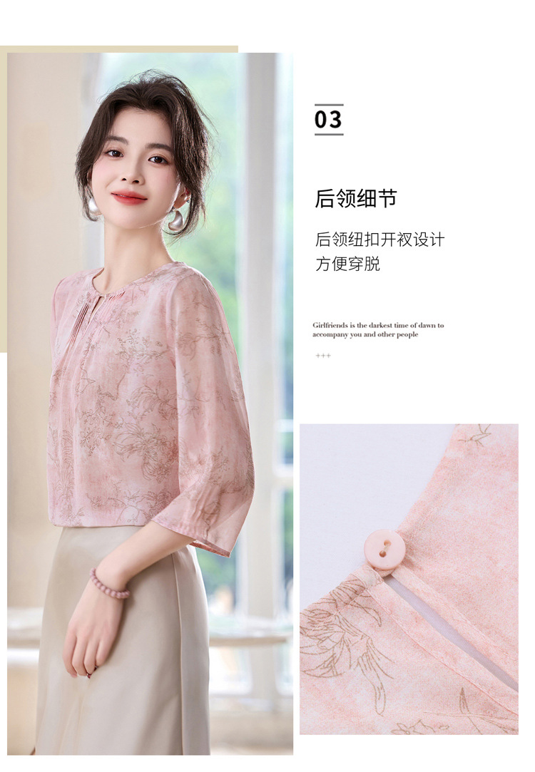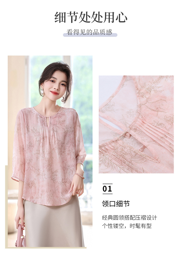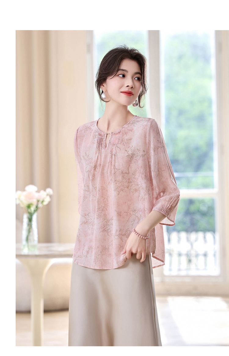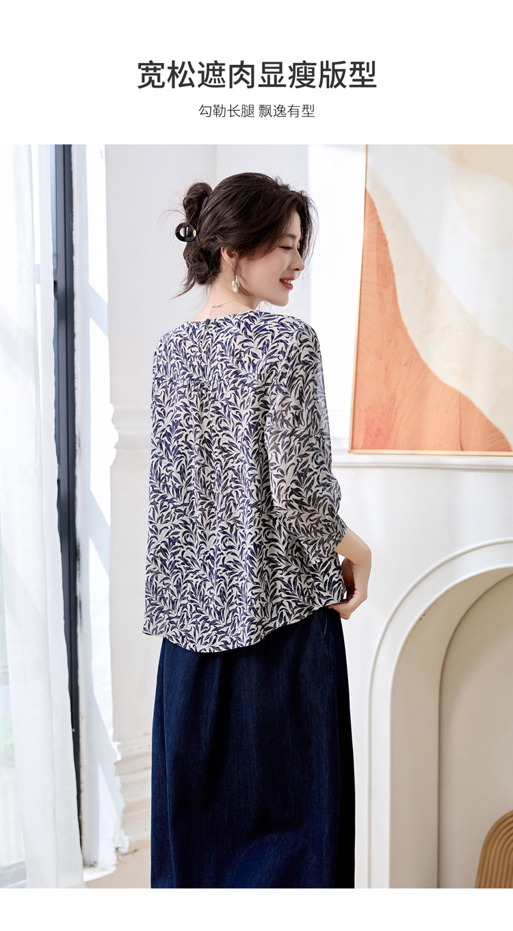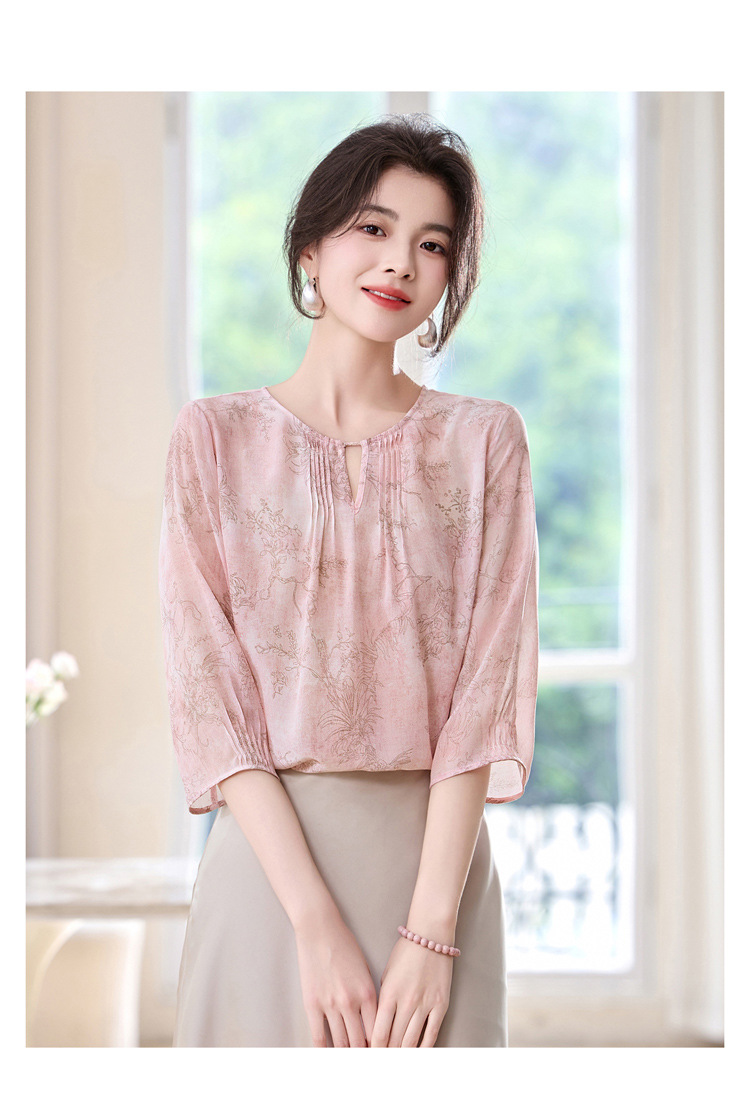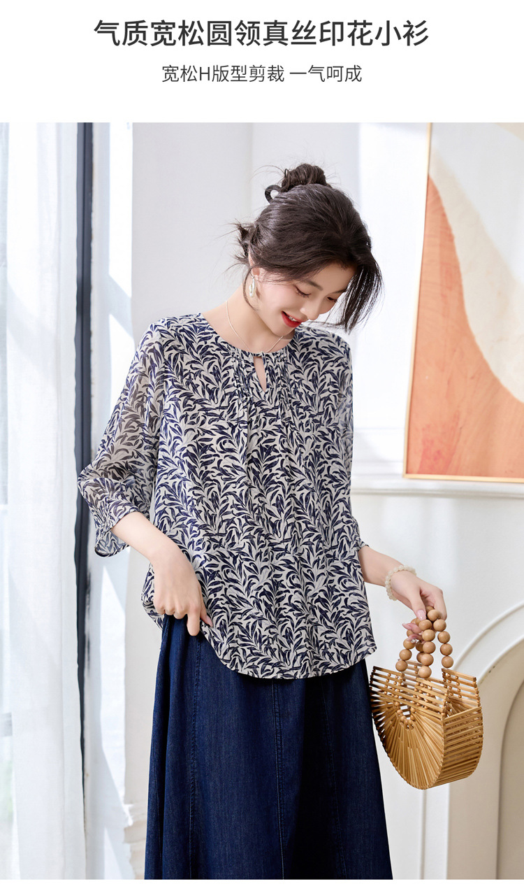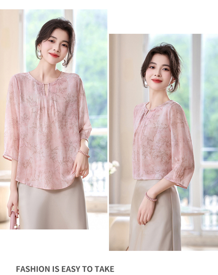 ASE2025夏季新款新中式复古印花衬衫圆领设计感七分袖套头上衣通勤