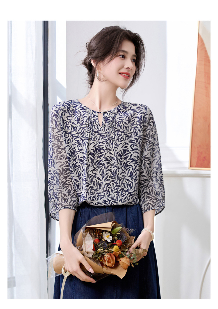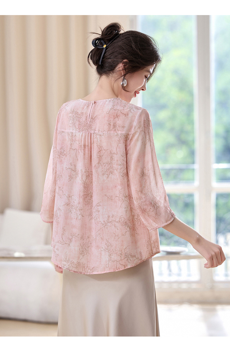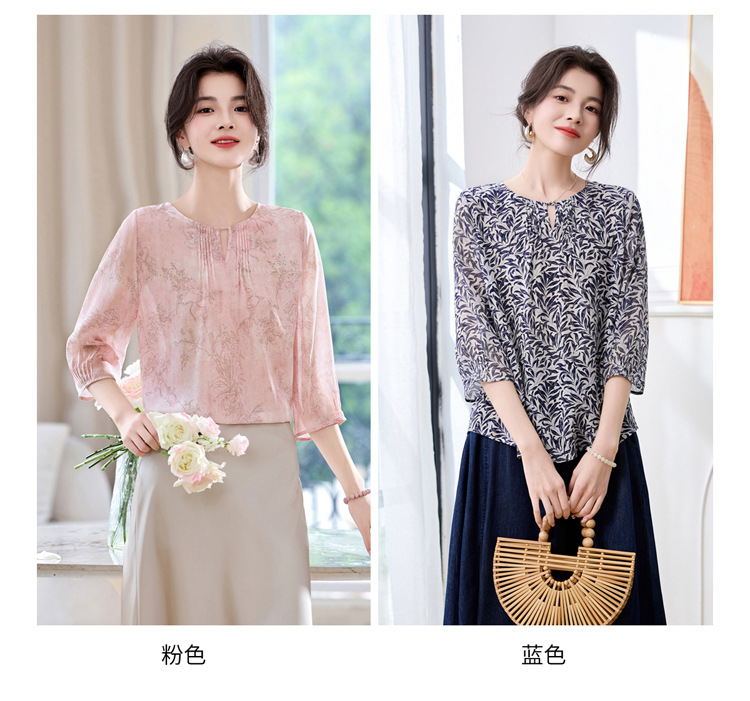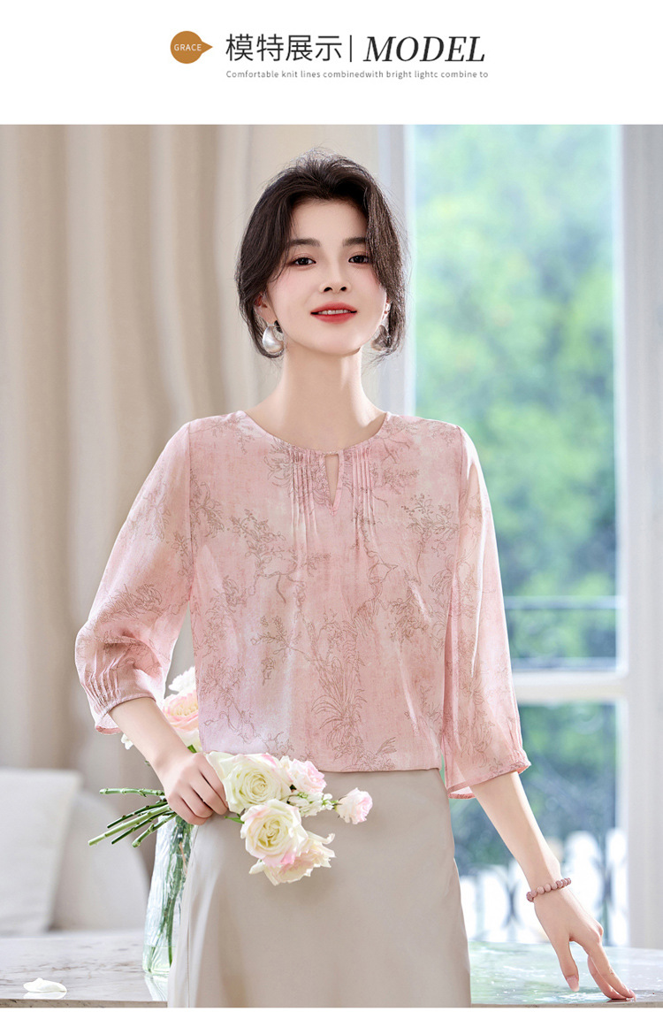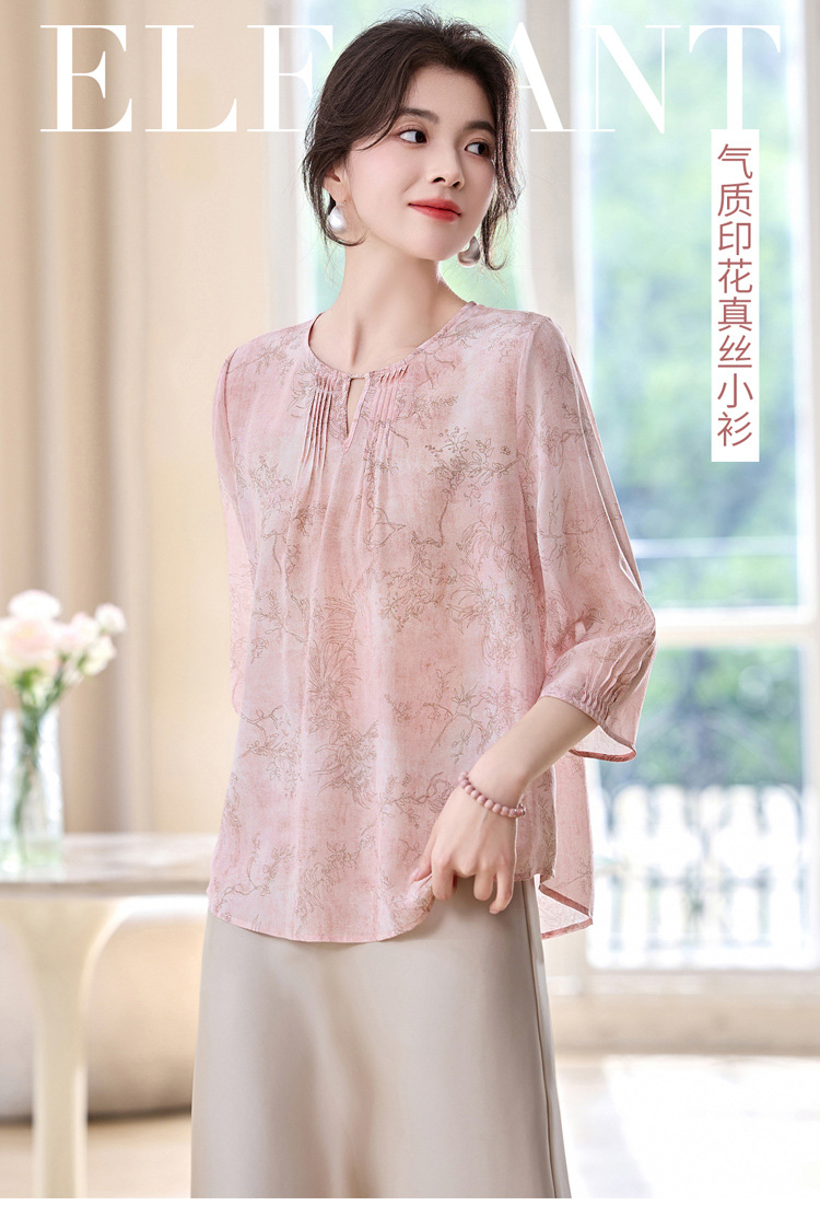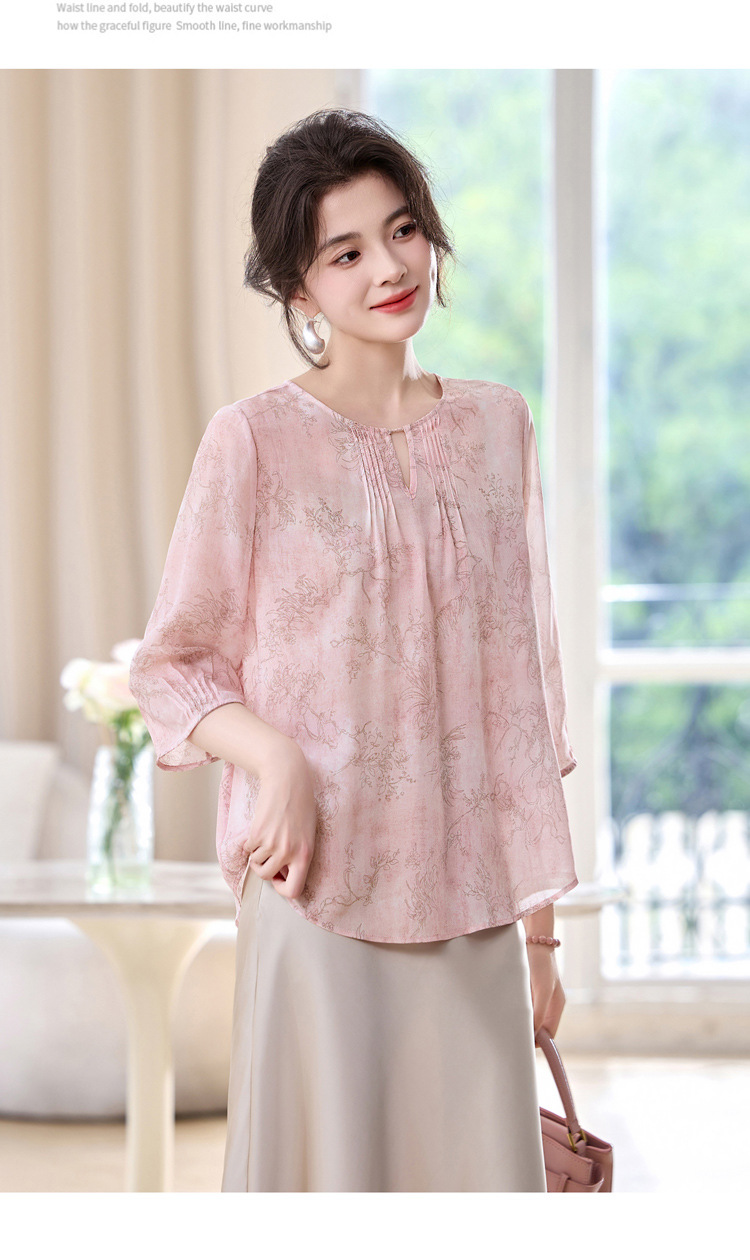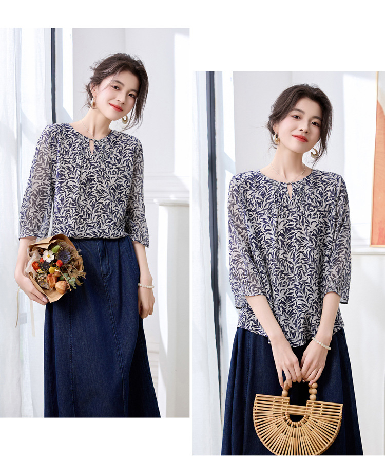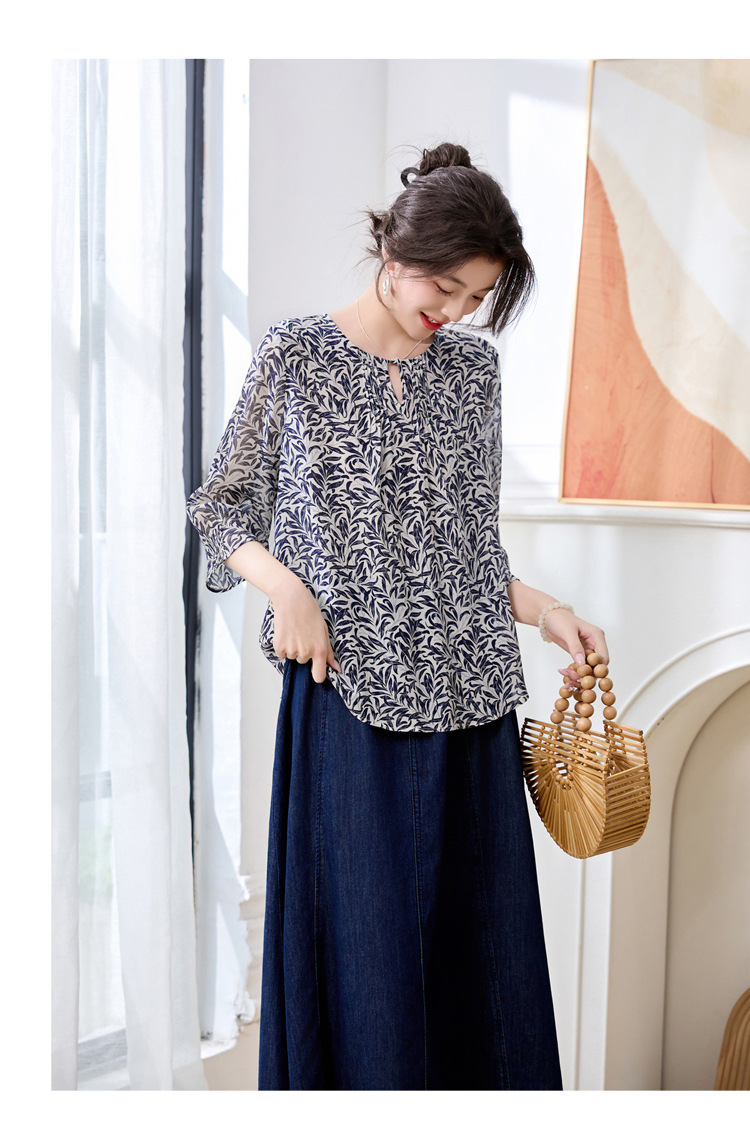 ASE2025夏季新款新中式复古印花衬衫圆领设计感七分袖套头上衣通勤