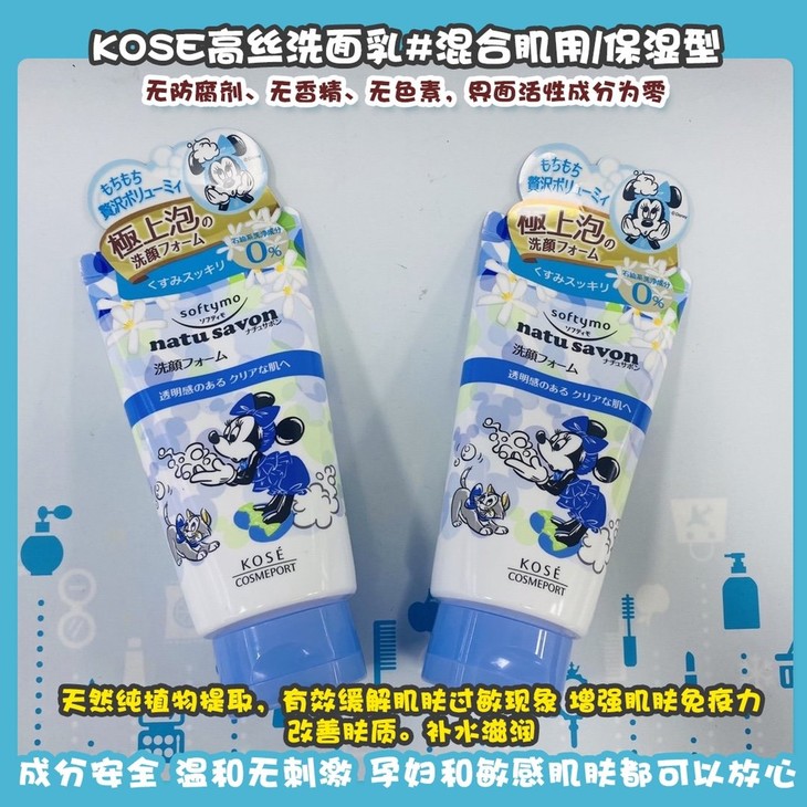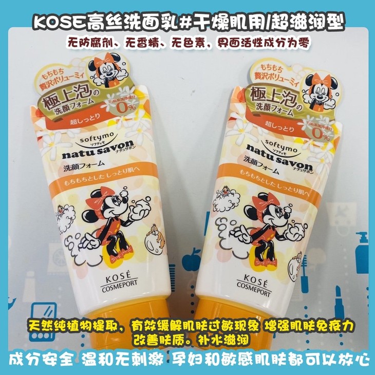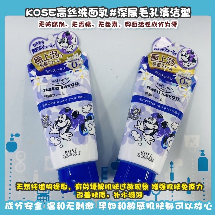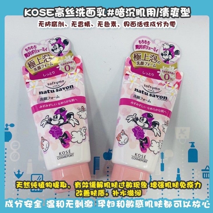 KOSE高丝洗面乳👍迪士尼米妮系列植物精粹洗面奶🌿。无防腐剂、无香精、无色素,界面活性成分为零✅。天然纯植物提取,有效缓解肌肤过敏现象,增强肌肤免疫力,改善肤质。补水滋润💦,有效调节肌肤水油平衡。成分安全,温和无刺激,孕妇和敏感肌肤都可以放心使用🙇。供四款可选,亲亲可根据个人需求自行选择。