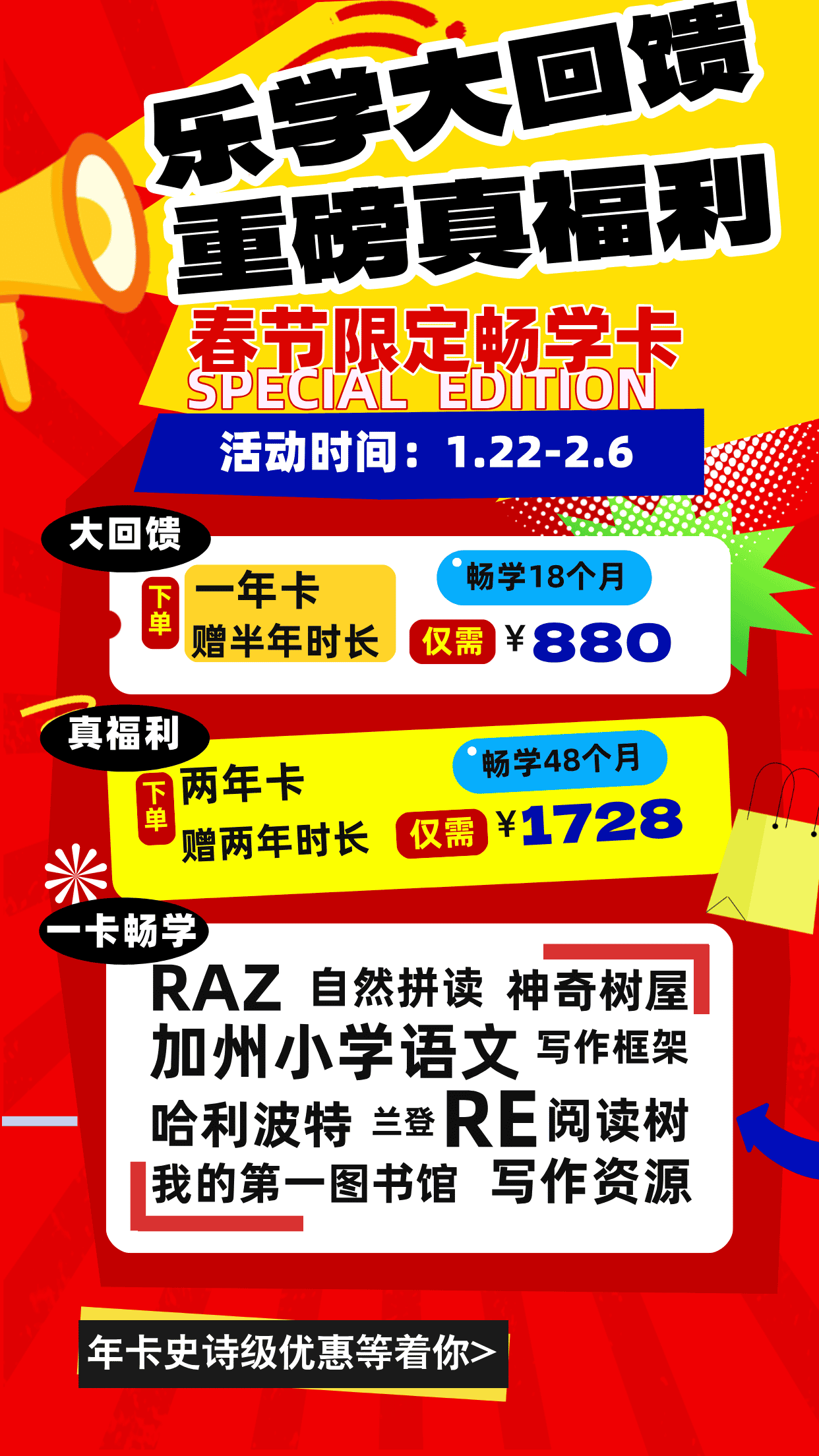 【春节不打烊】史诗级钜惠-乐学畅学卡特别版 ◾16大系列◾50+级别◾1700+精读指导视频,美国讲师全程英语精读讲解!(发货即代表课程开通)