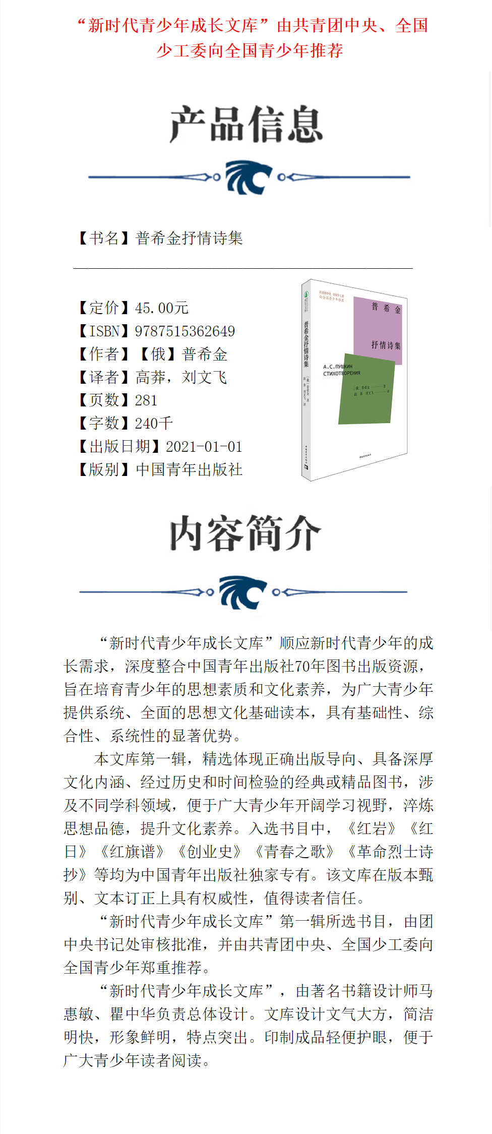 普希金抒情诗集 【俄】普希金 著;高莽,刘文飞 译 中国青年出版社