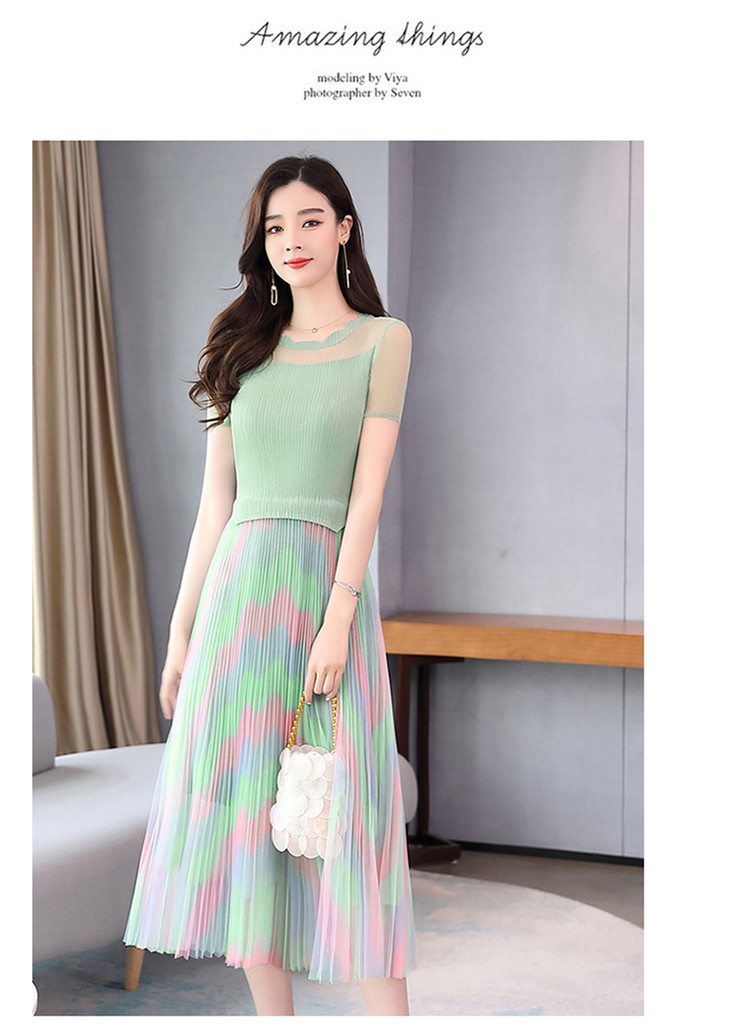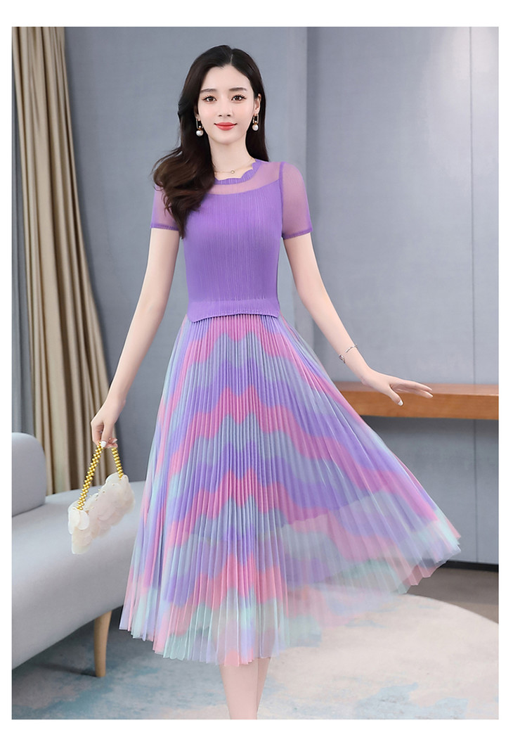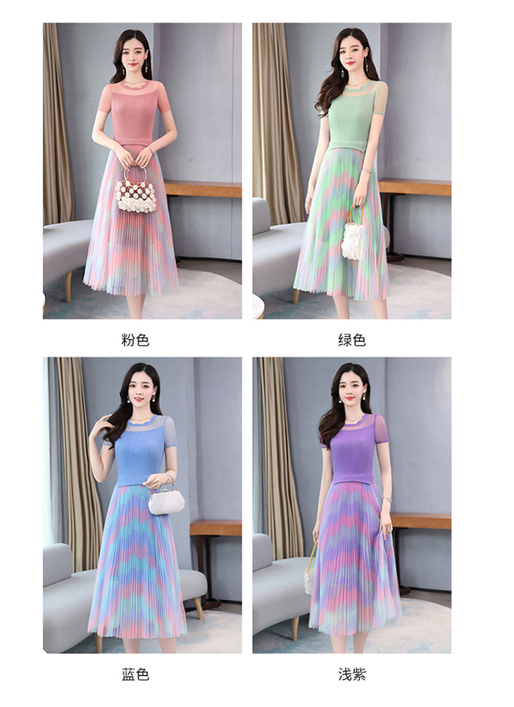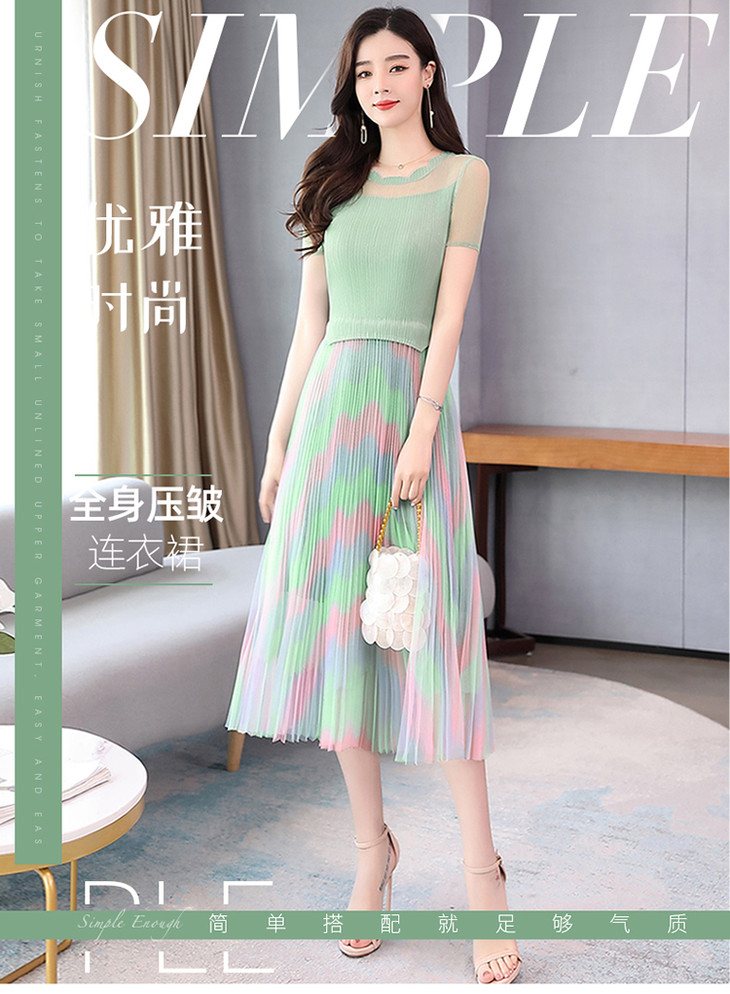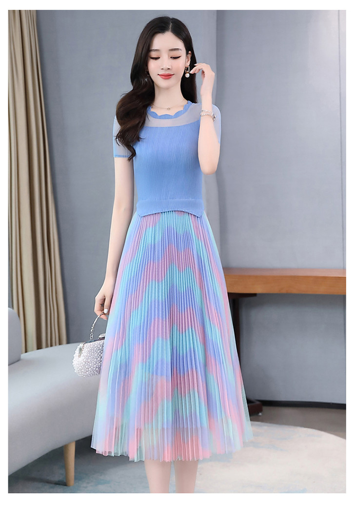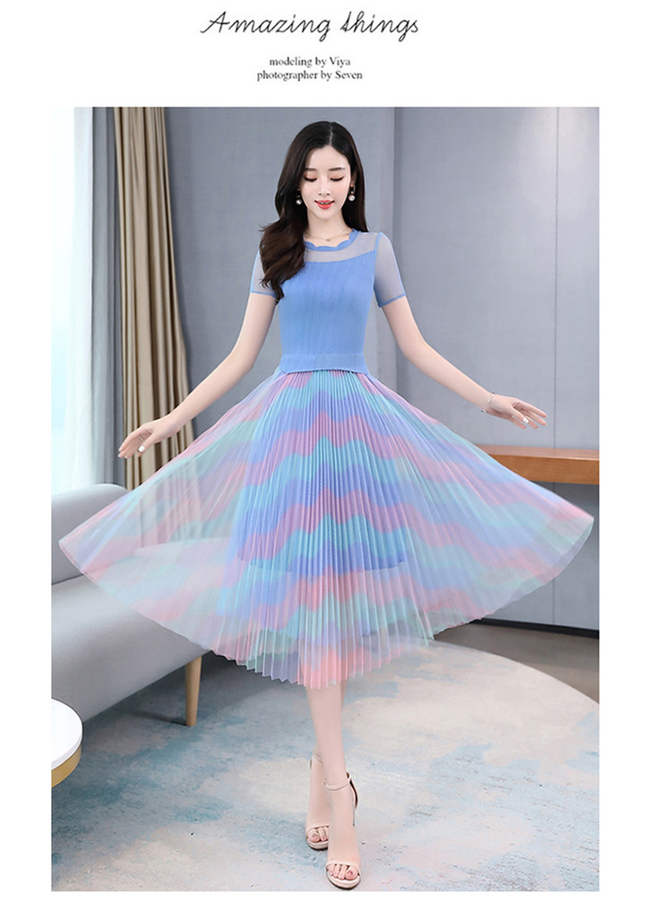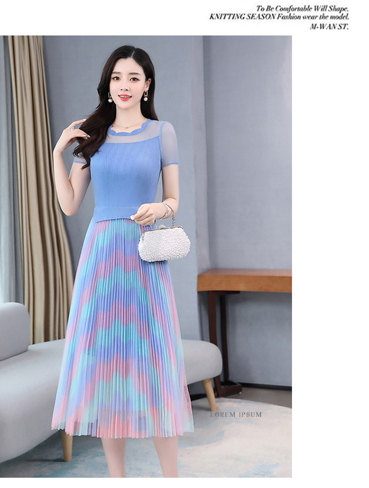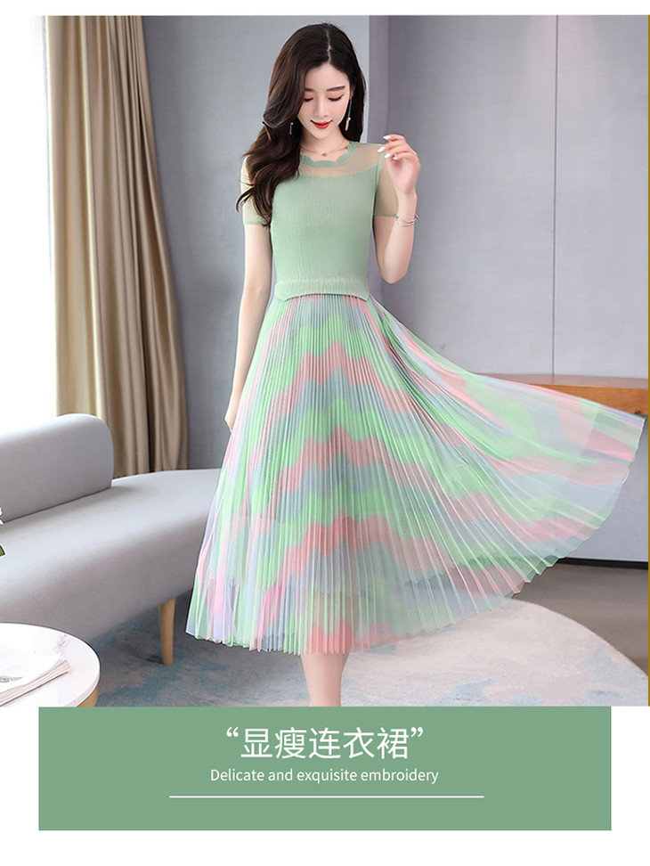 KY-XXM818-2新款收腰显瘦气质渐变色条纹百褶连衣裙