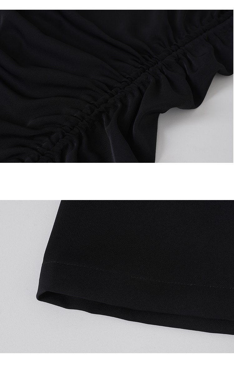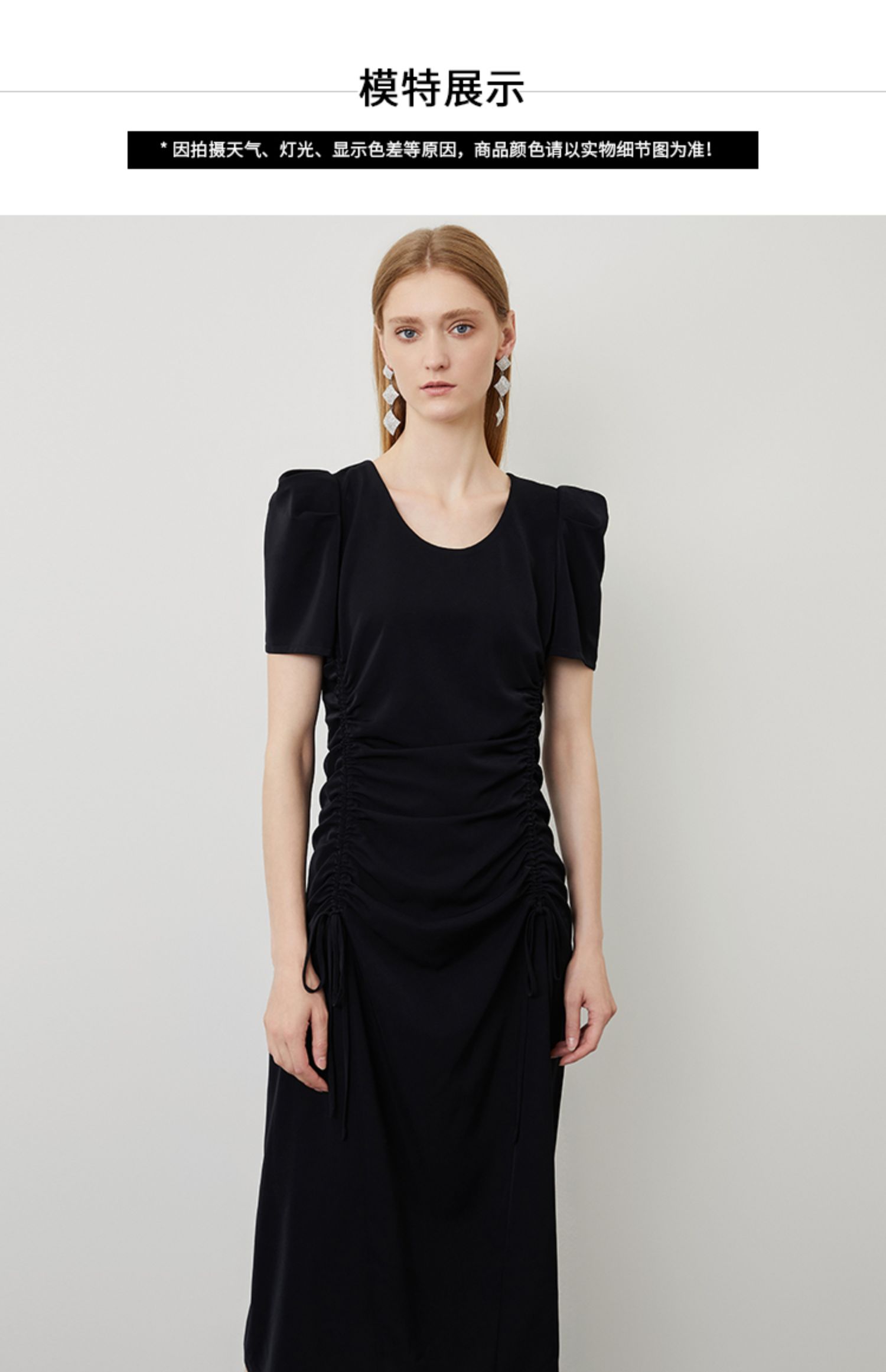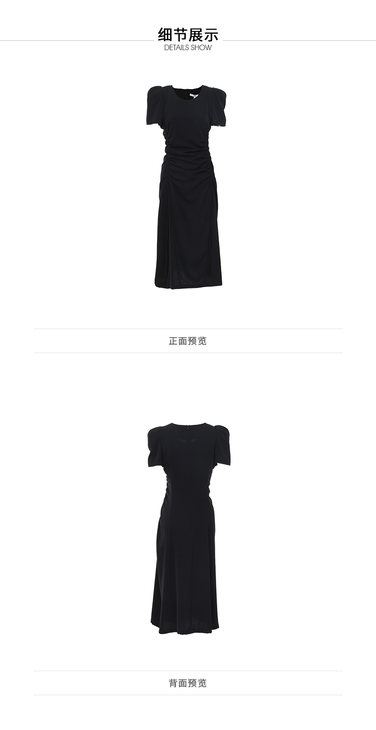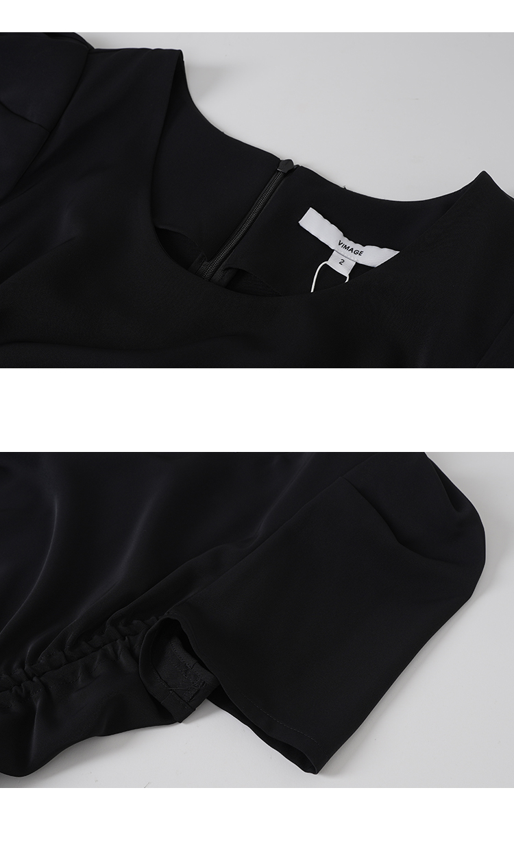VIMAGE/纬漫纪夏季新款复古u领垫肩泡泡袖抽褶显瘦黑色连衣裙VB2207908