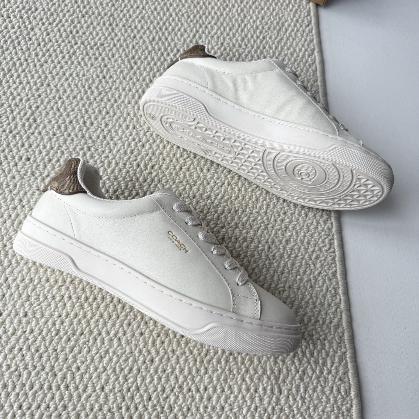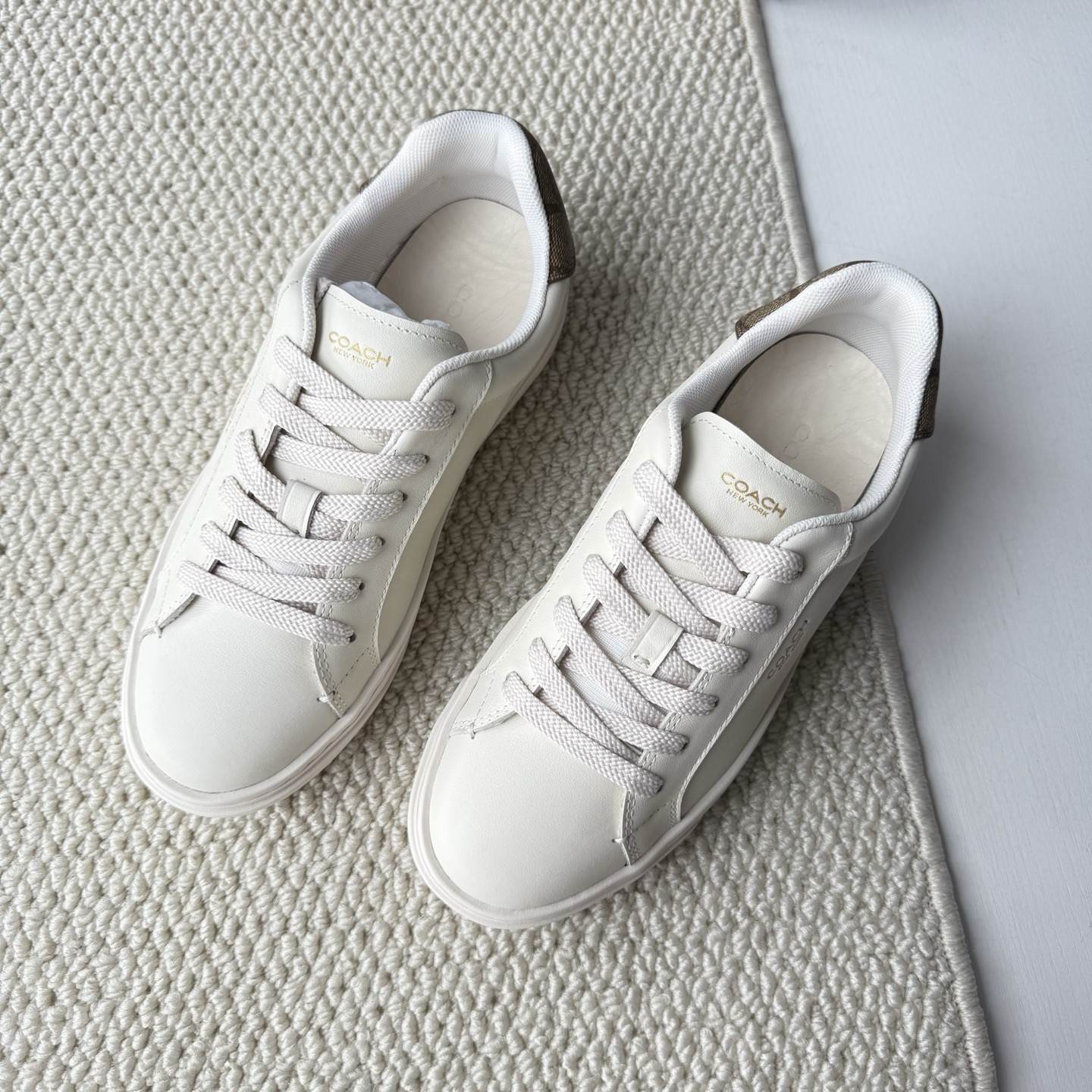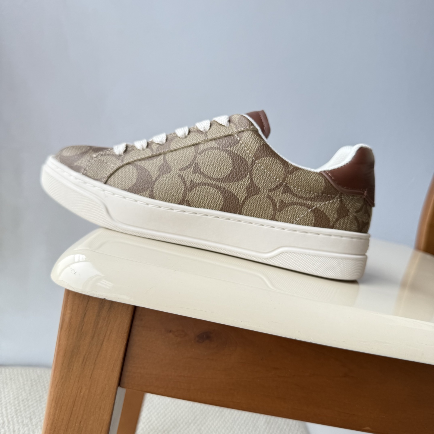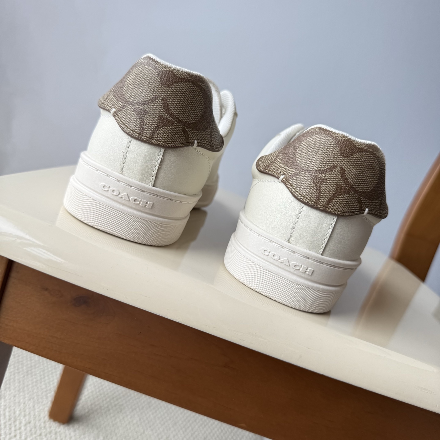 350 货号310722350 dx 👍蔻驰COACH女款经典老花舒适运动休闲鞋,轻潮登场,精选牛剖层革与标志性老花帆布拼接,细腻皮革自带温润质感,老花元素复刻品牌经典,鞋身侧面的低调金属Logo点缀,让精致感藏在细节里。