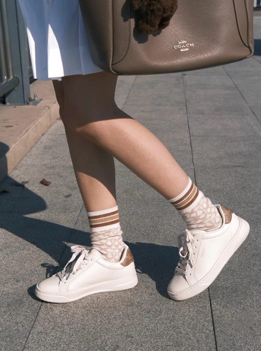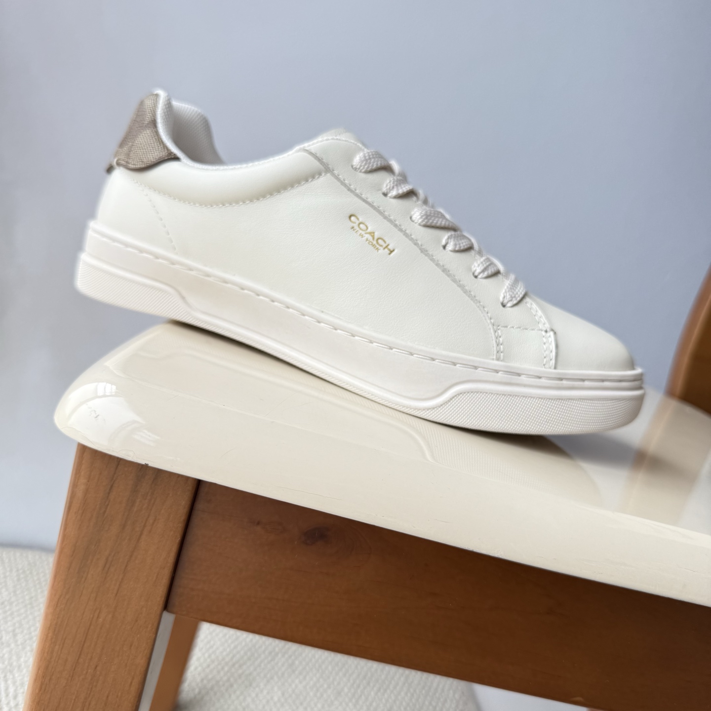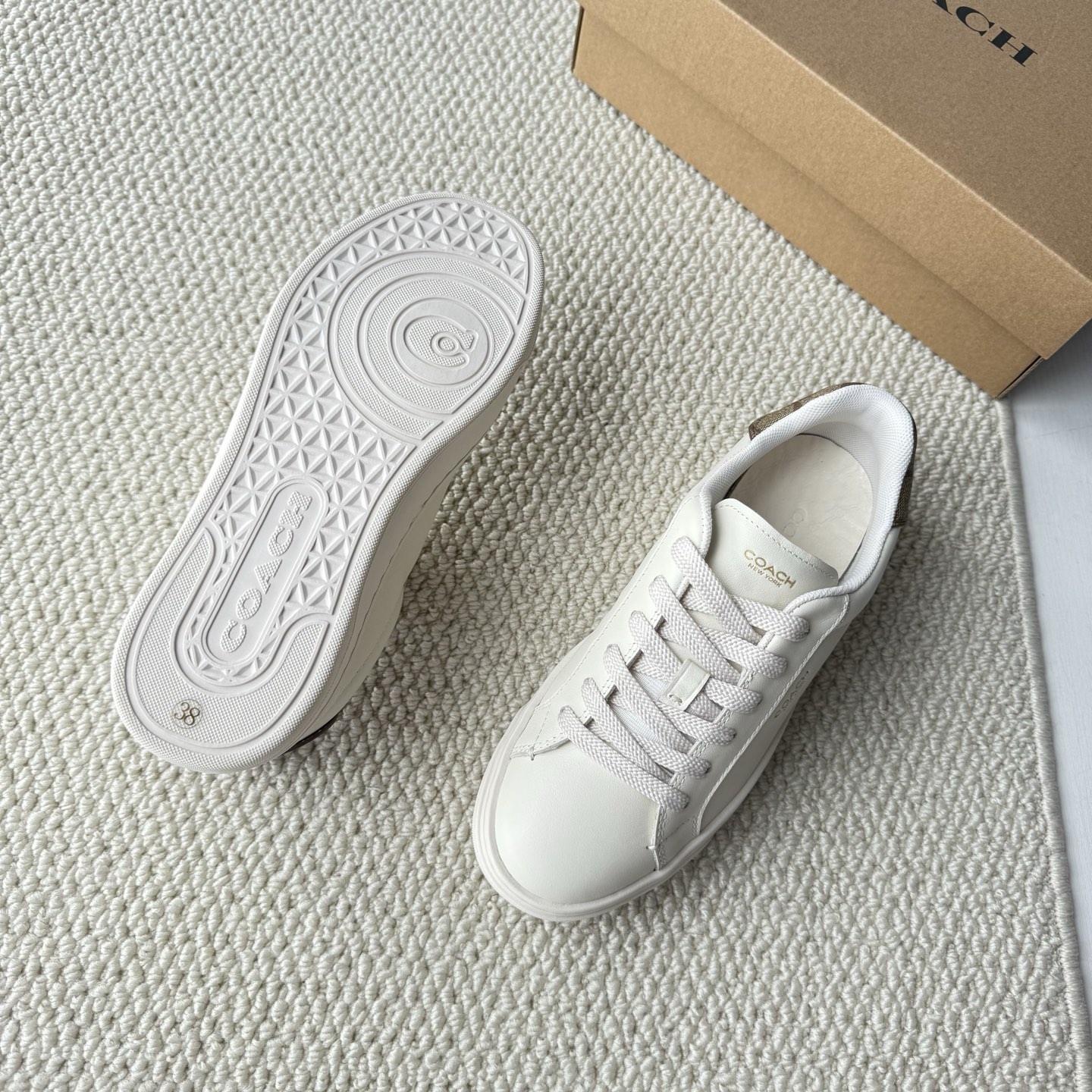 350 货号310722350 dx 👍蔻驰COACH女款经典老花舒适运动休闲鞋,轻潮登场,精选牛剖层革与标志性老花帆布拼接,细腻皮革自带温润质感,老花元素复刻品牌经典,鞋身侧面的低调金属Logo点缀,让精致感藏在细节里。