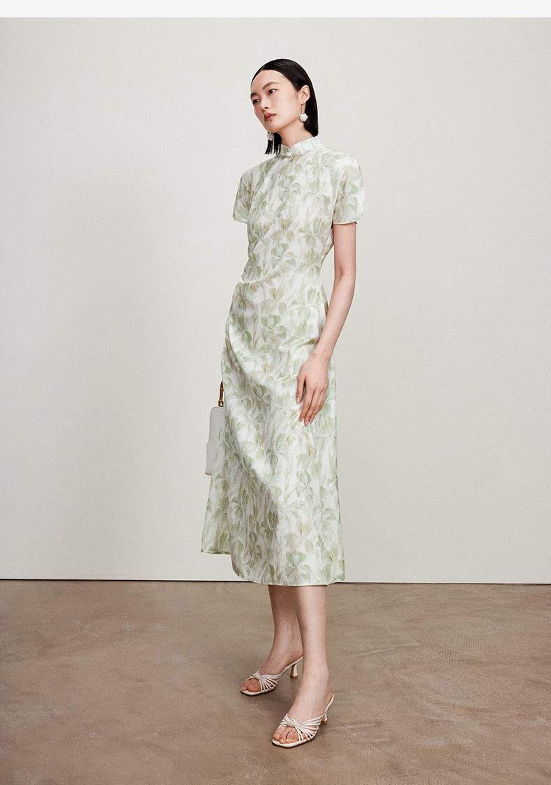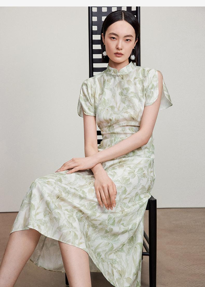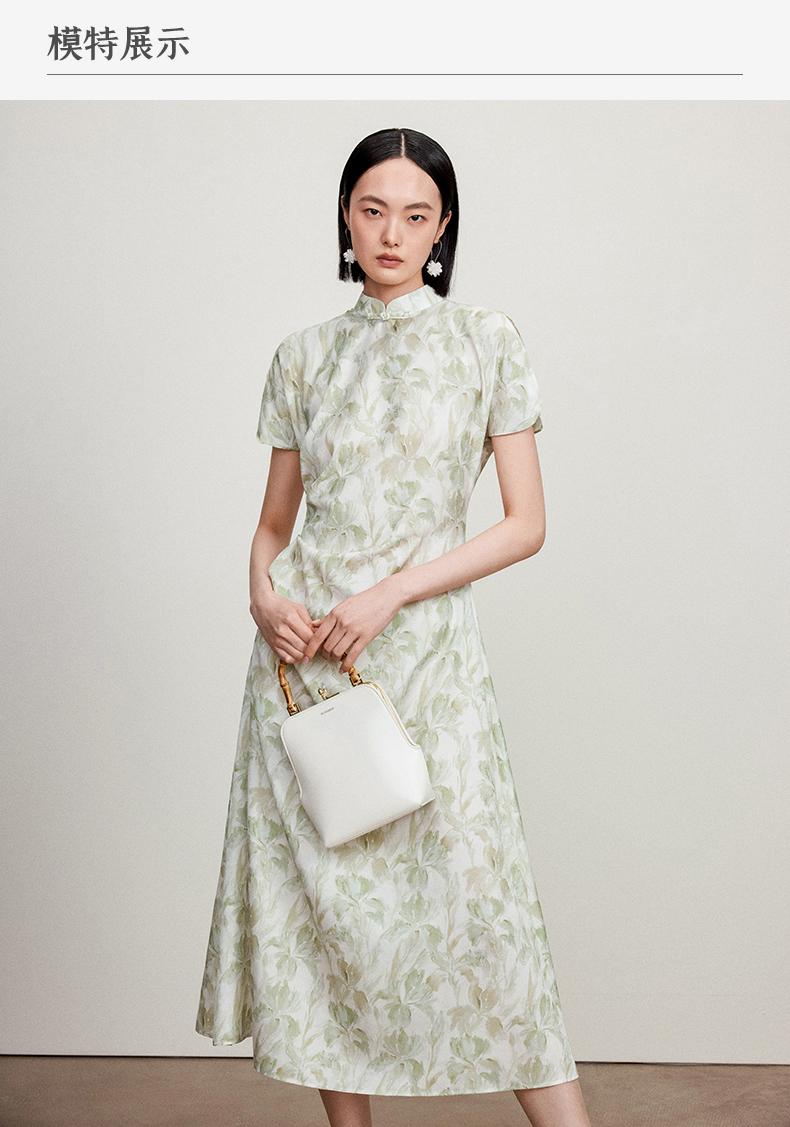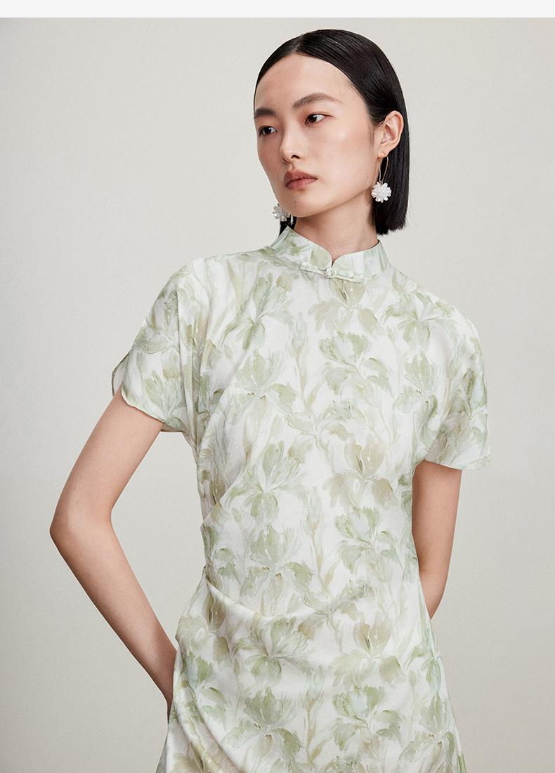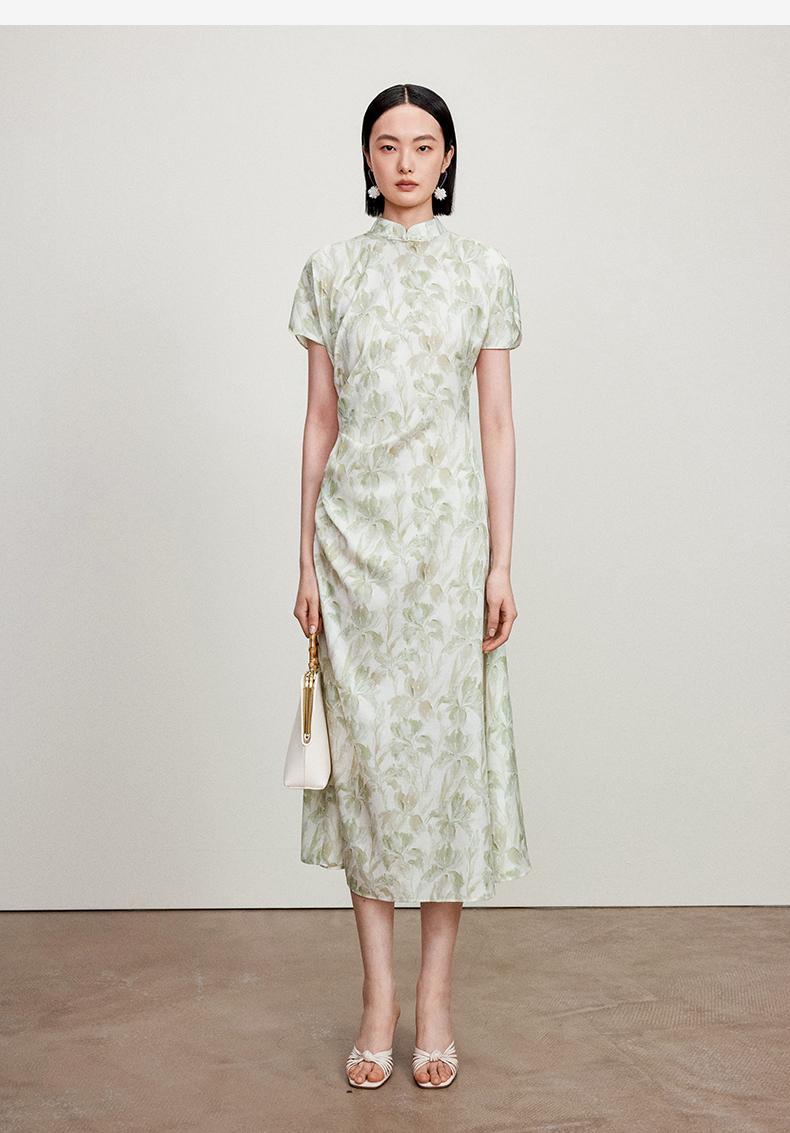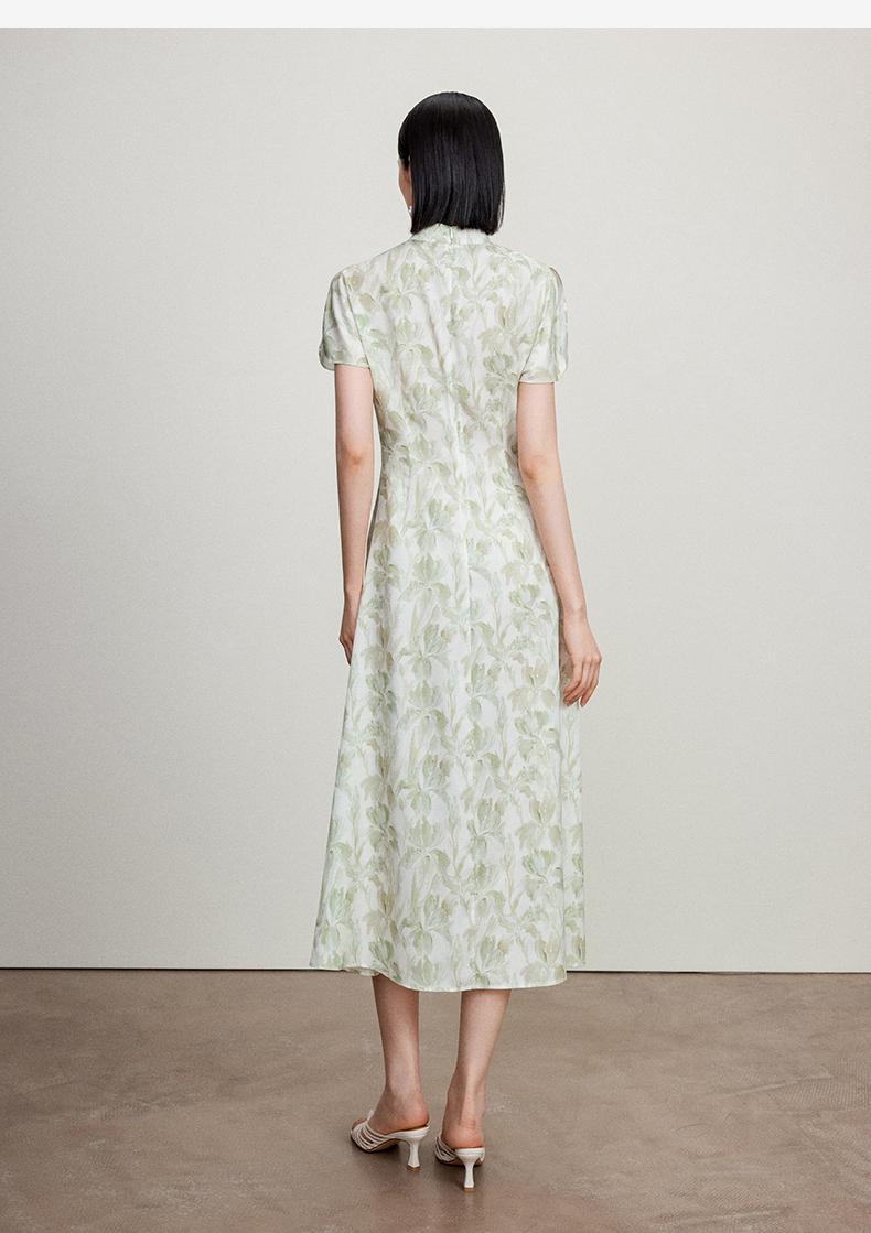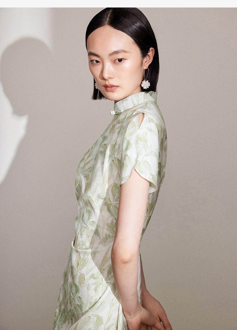 YQ2402012西嘉薄荷曼波提花新中式连衣裙女夏立领醋酸花瓣袖长裙L