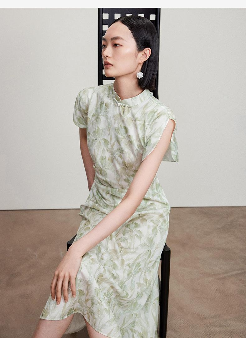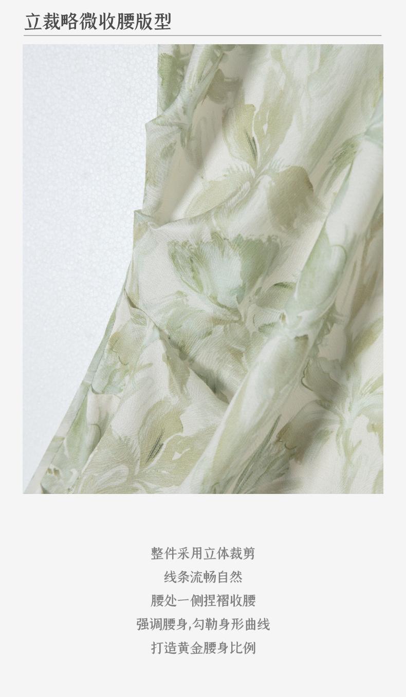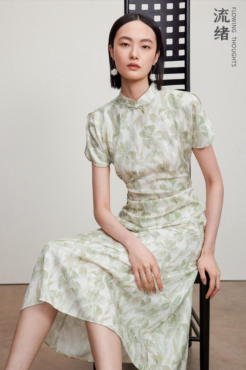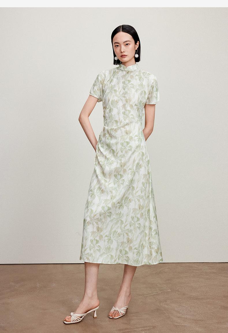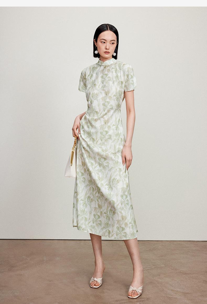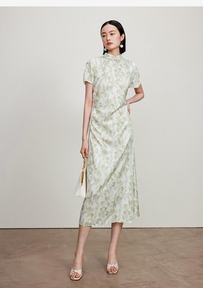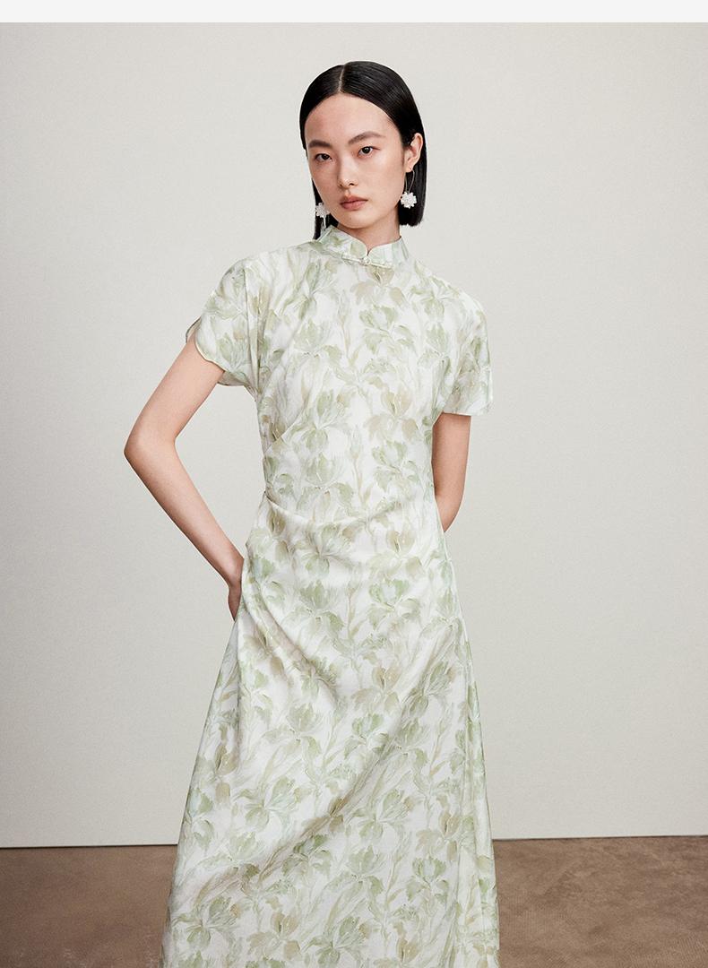 YQ2402012西嘉薄荷曼波提花新中式连衣裙女夏立领醋酸花瓣袖长裙L