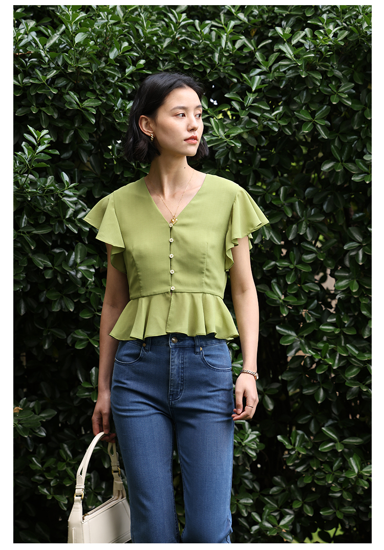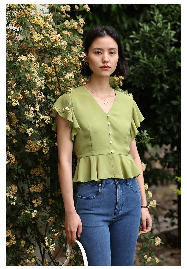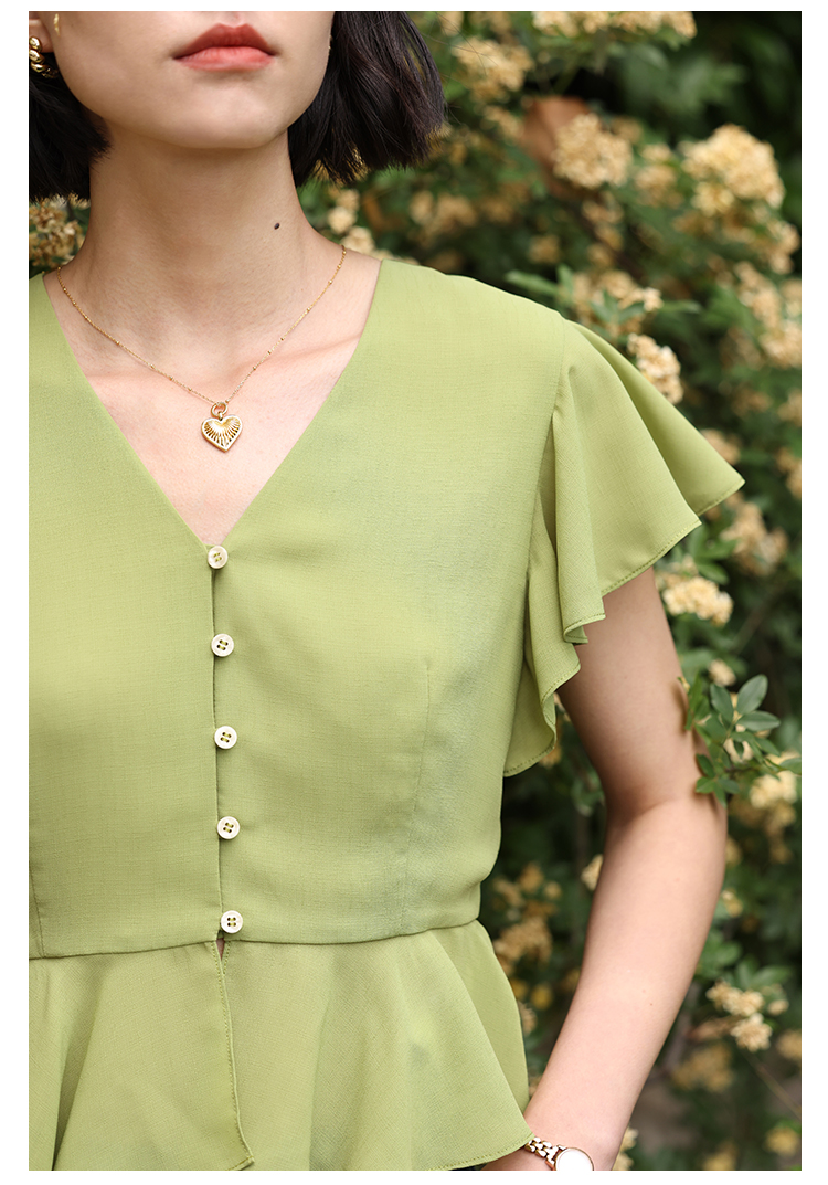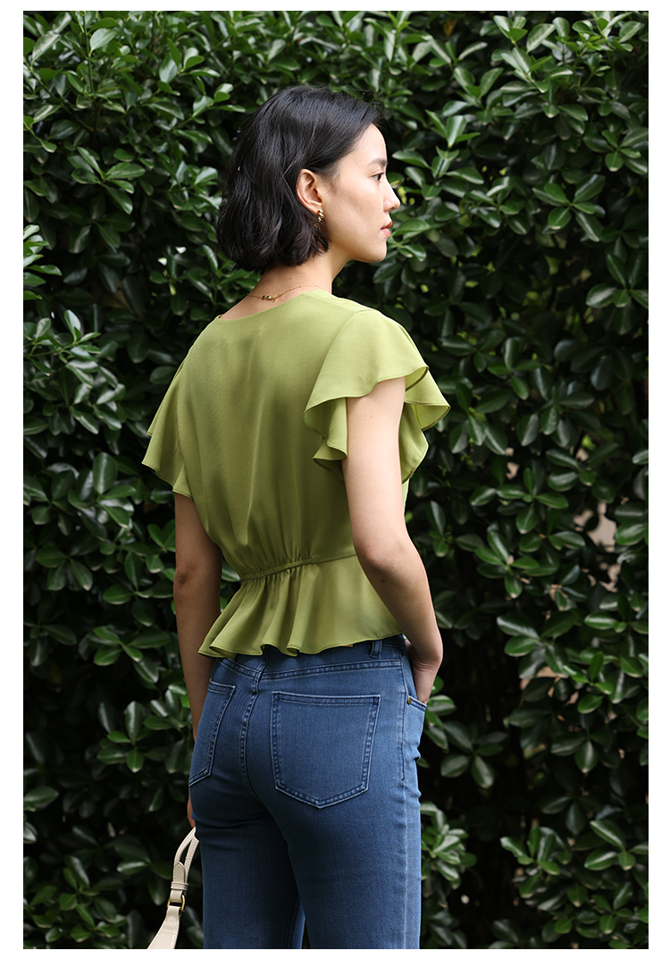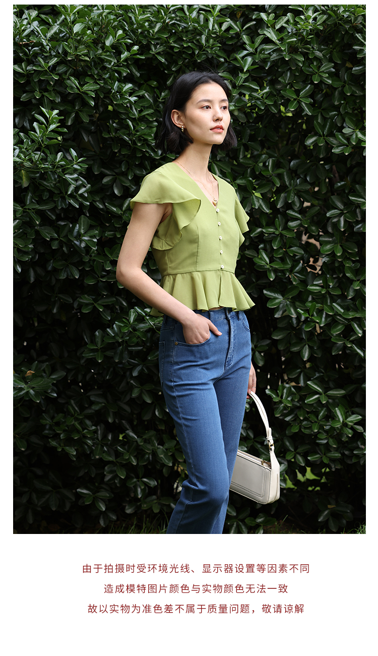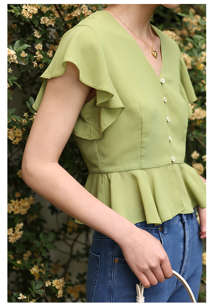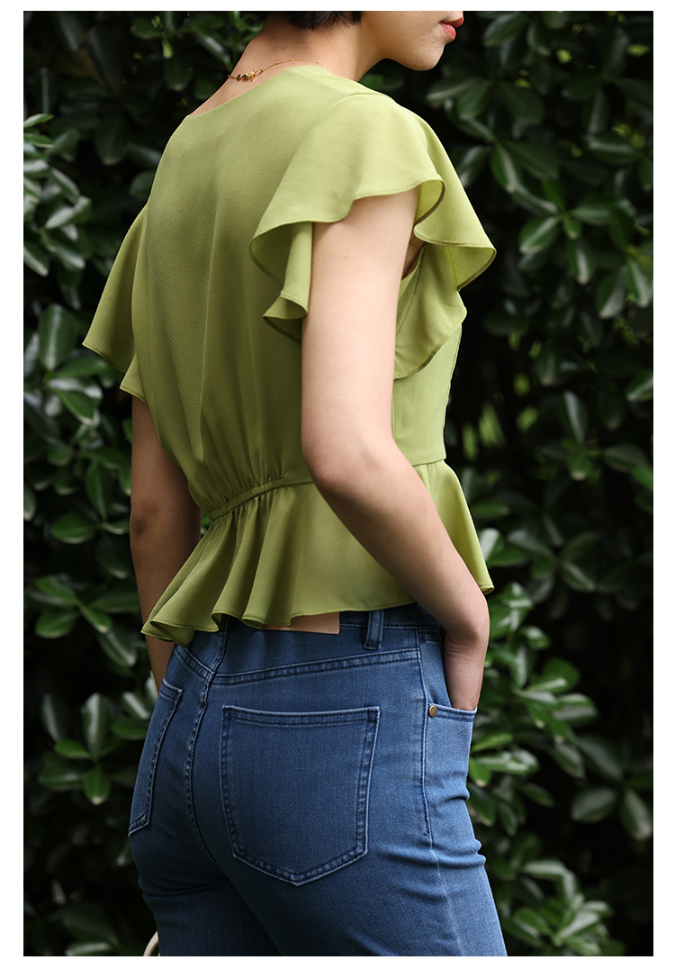 HeyDress法式复古V领衬衫女夏季收腰设计感浪漫荷叶袖雪纺衫上衣