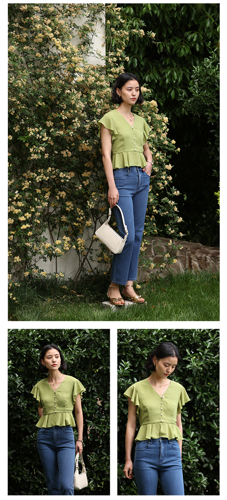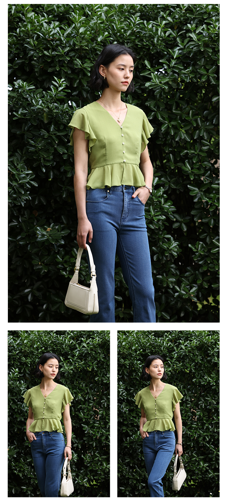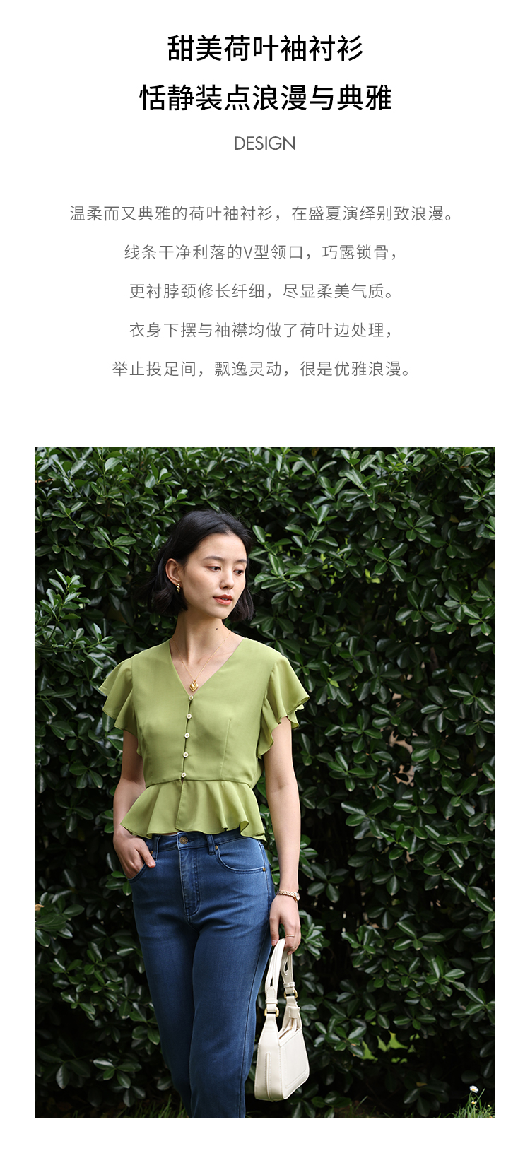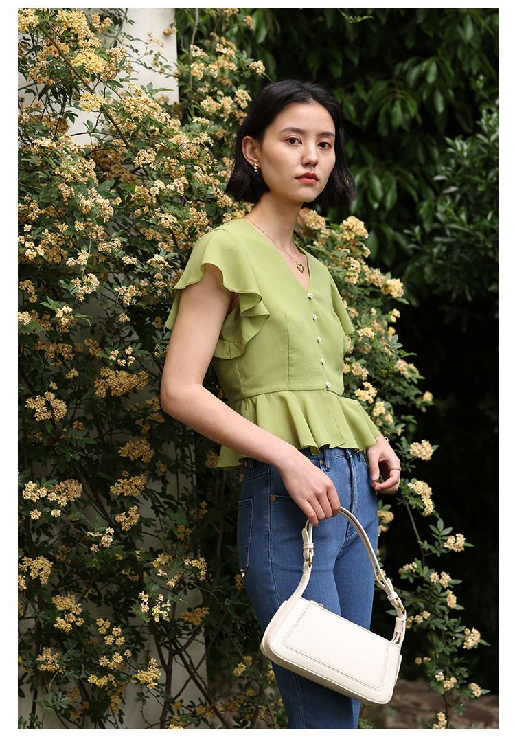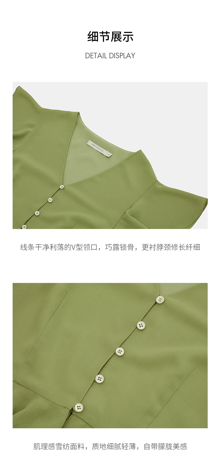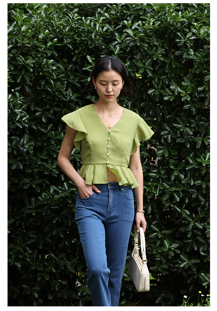 HeyDress法式复古V领衬衫女夏季收腰设计感浪漫荷叶袖雪纺衫上衣