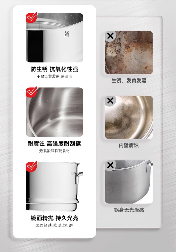 普通锅具易生锈发黄、内壁腐蚀、锅身暗淡无光,而这款WMF锅具以“三重防护”(防锈、耐腐蚀、镜面精抛)完胜,让“耐用”与“美观”兼得。