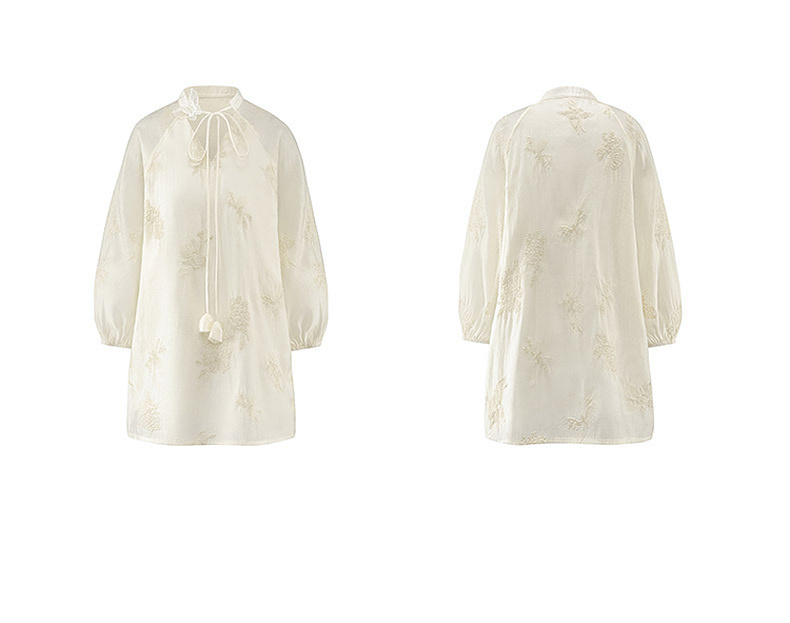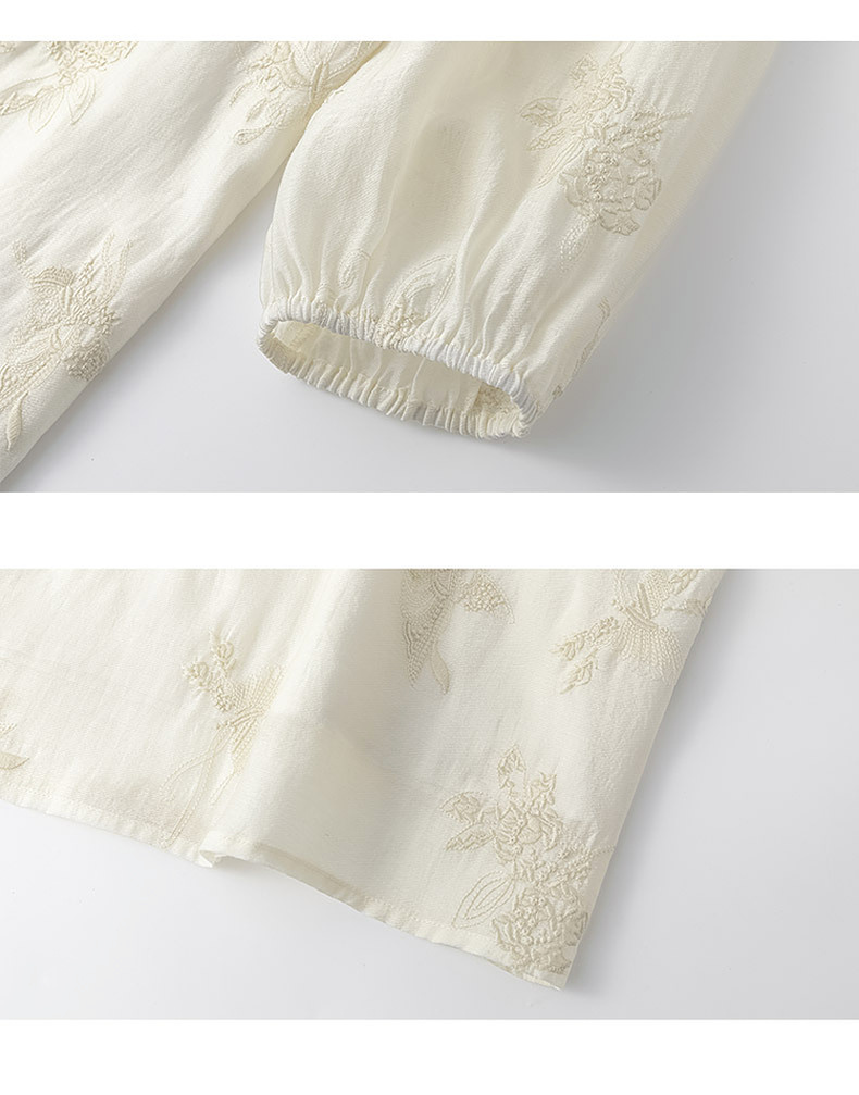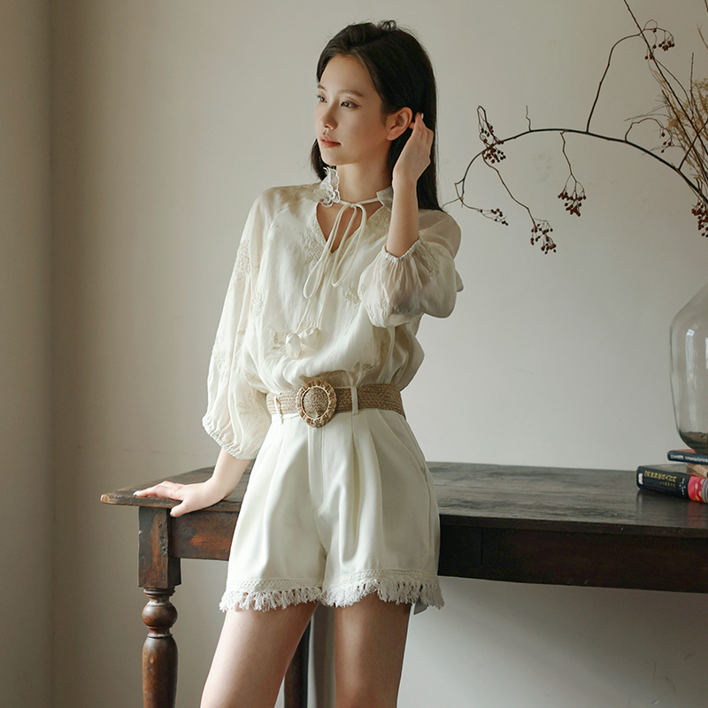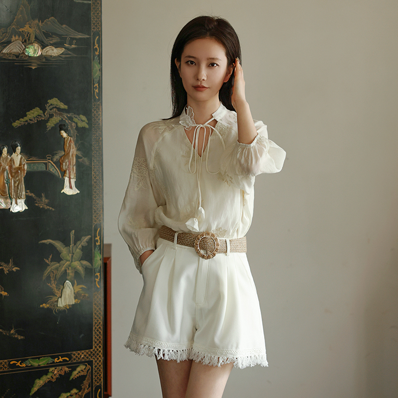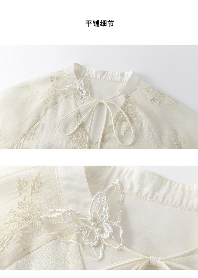 会员福利【天丝莱赛尔+刺绣】会拉夏贝尔/La Chapelle圆领立体蝴蝶系带七分袖小衫上衣2025年新款