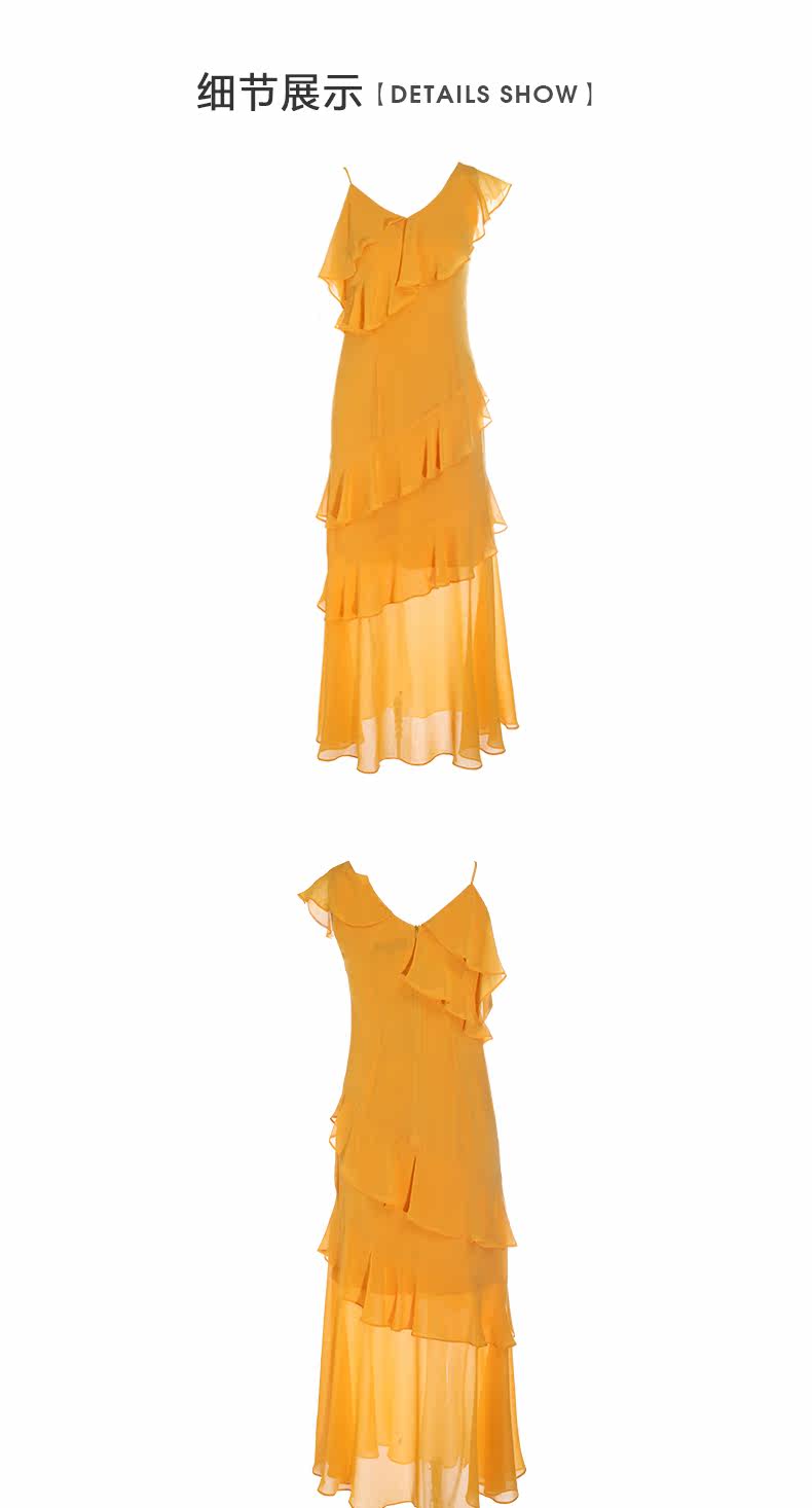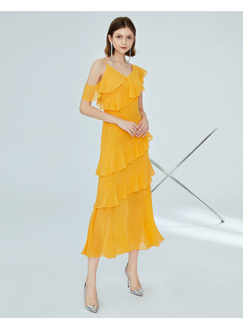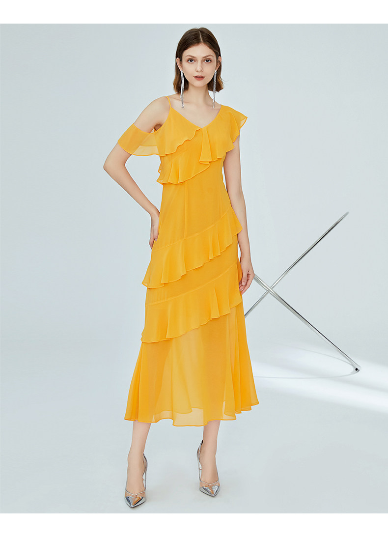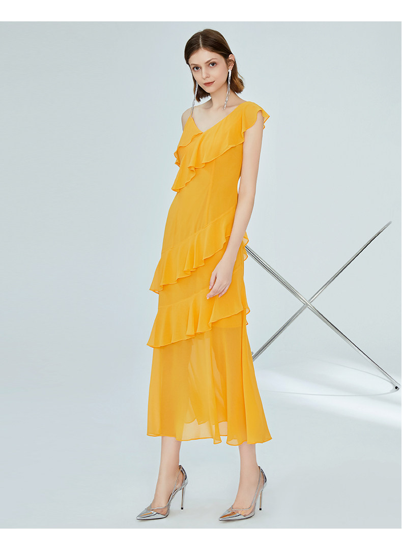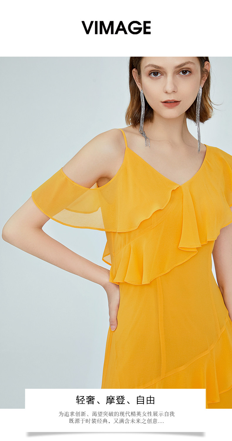 VIMAGE纬漫纪女装夏季新品蛋糕荷叶边斜肩雪纺连衣裙长款薄V1177708