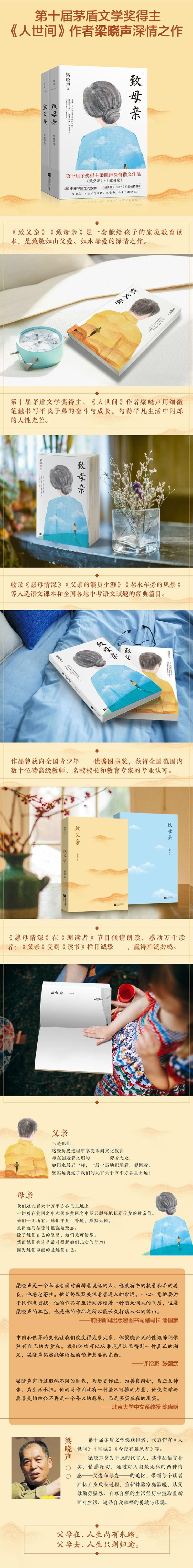 《致父亲》《致母亲》是梁晓声以父爱、母爱为主题的经典文章合集,收录了梁晓声不同时期创作的经典作品,其中《父亲的演员生涯》《大象小象和人》《慈母情深》《老水车旁的风景》等多篇入选了语文课本和中考试题。
