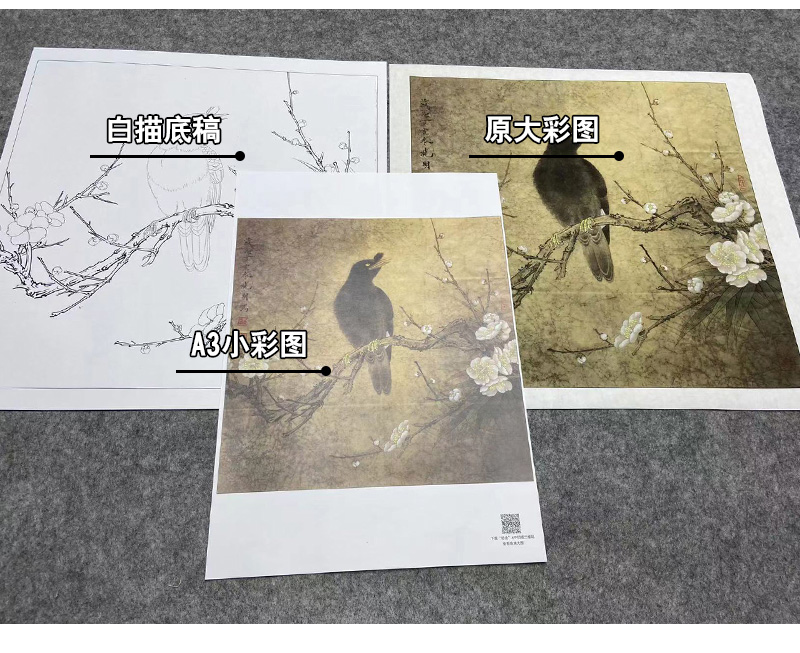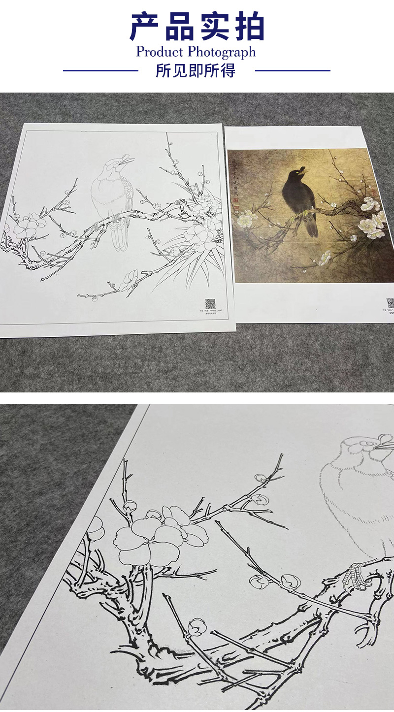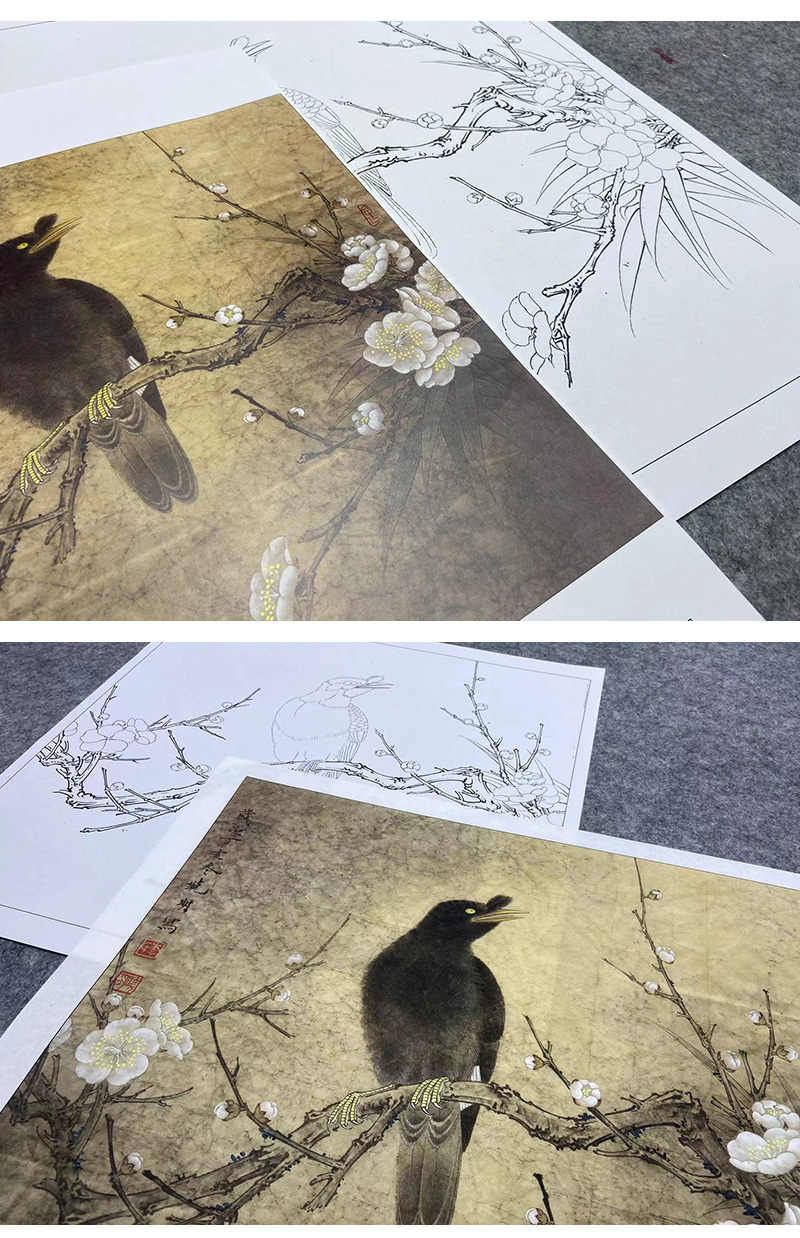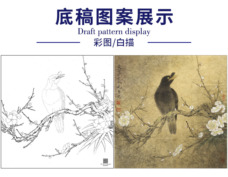 【大彩图】李晓明工笔画白描底稿斗方小品《梅花八哥》临摹勾线花鸟线稿K062
