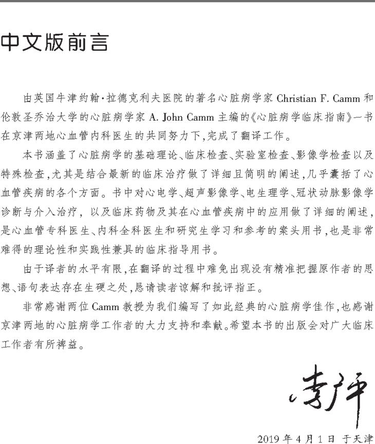 A.约翰·凯姆(A. John Camm):英国伦敦大学圣乔治医学院教授,欧洲心脏病学会心房颤动指南制定专家委员会主席,英国心脏基金会主席,同时也是欧洲心脏病学会教科书《心血管内科》《循证心脏病学》和《心电生理学》的编辑。