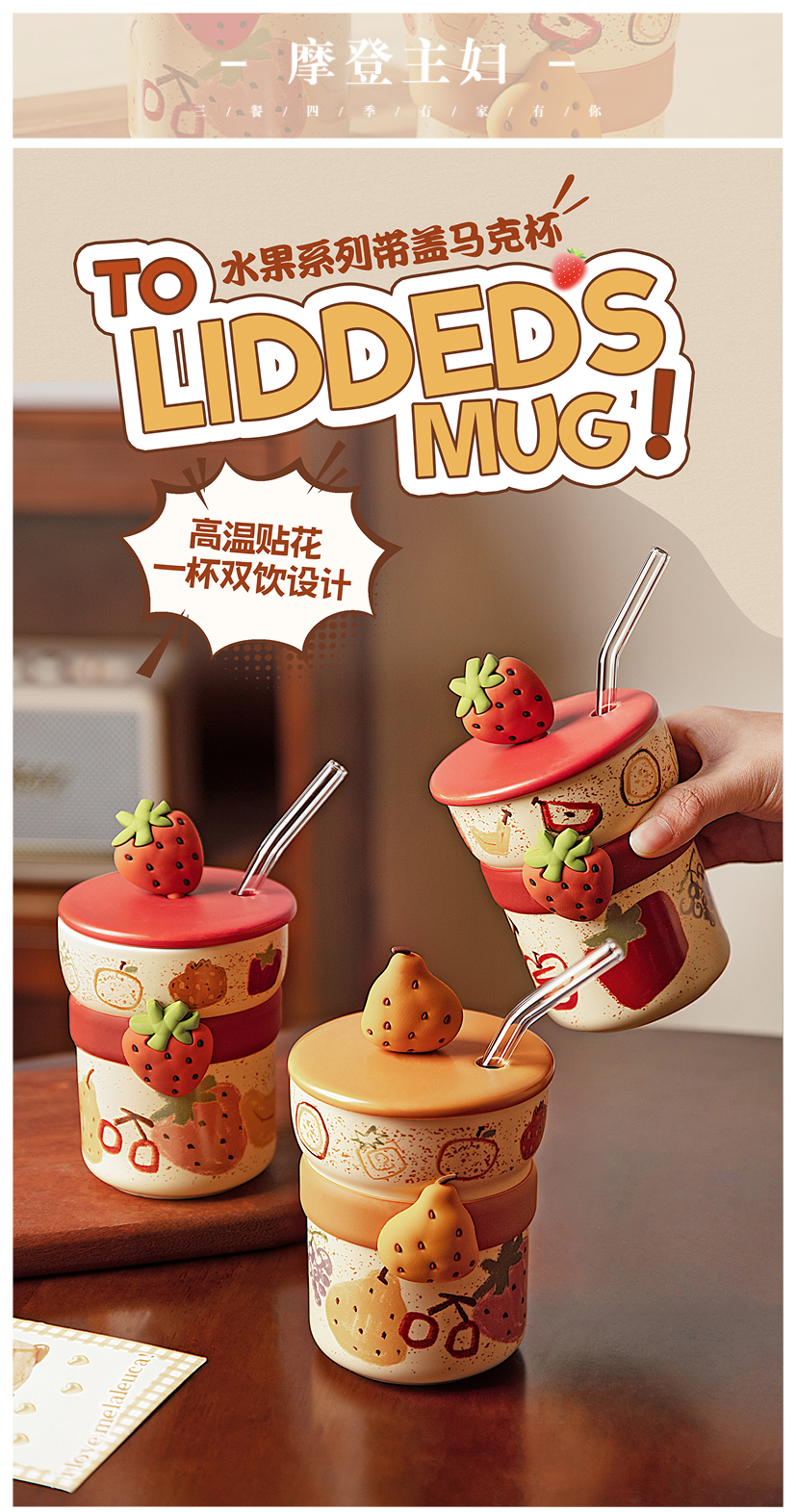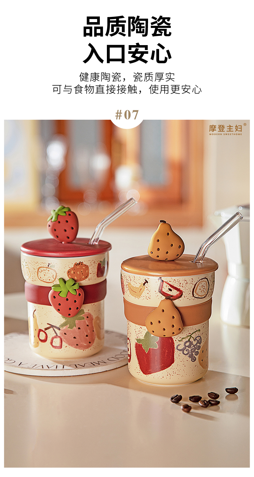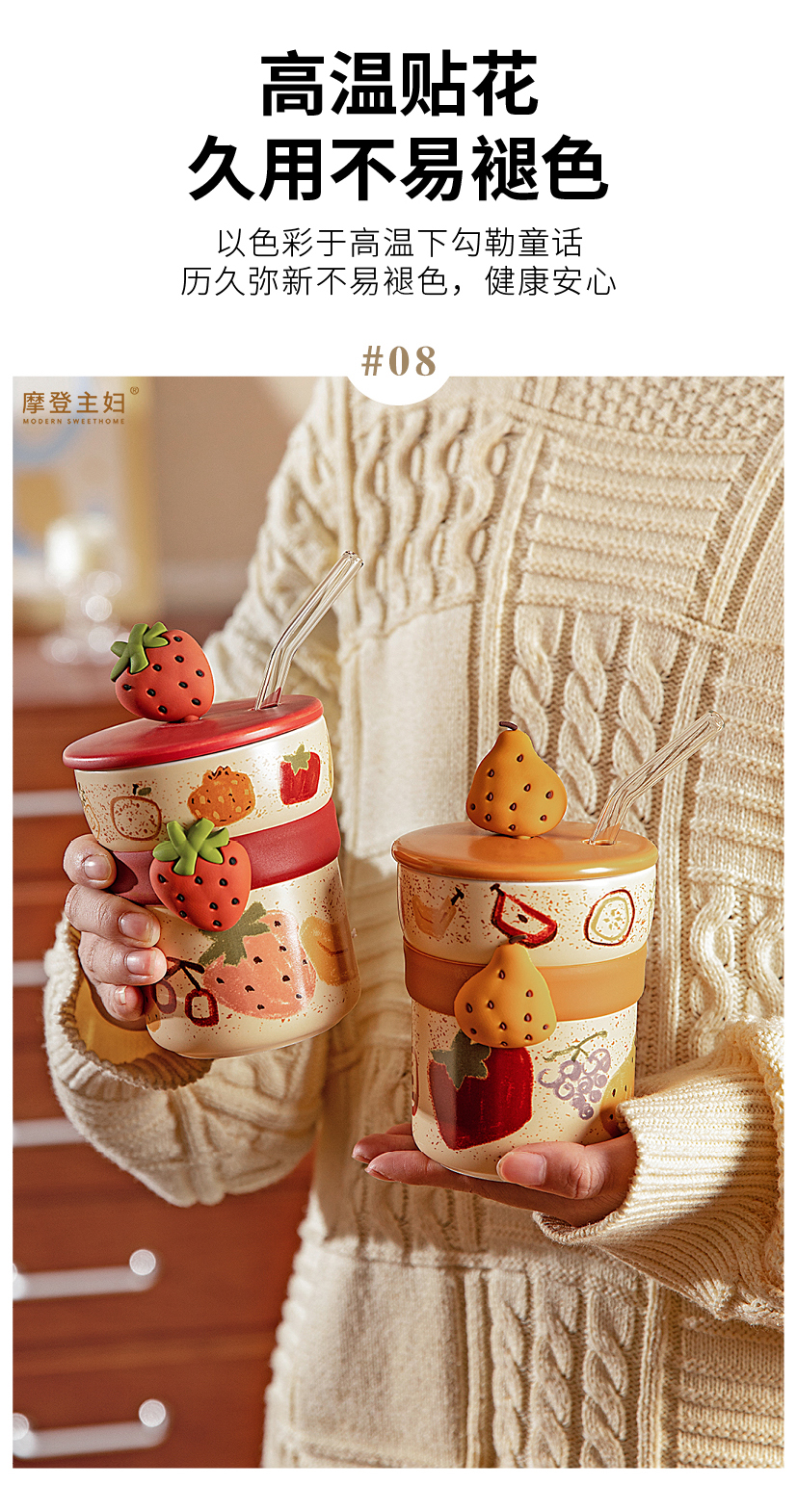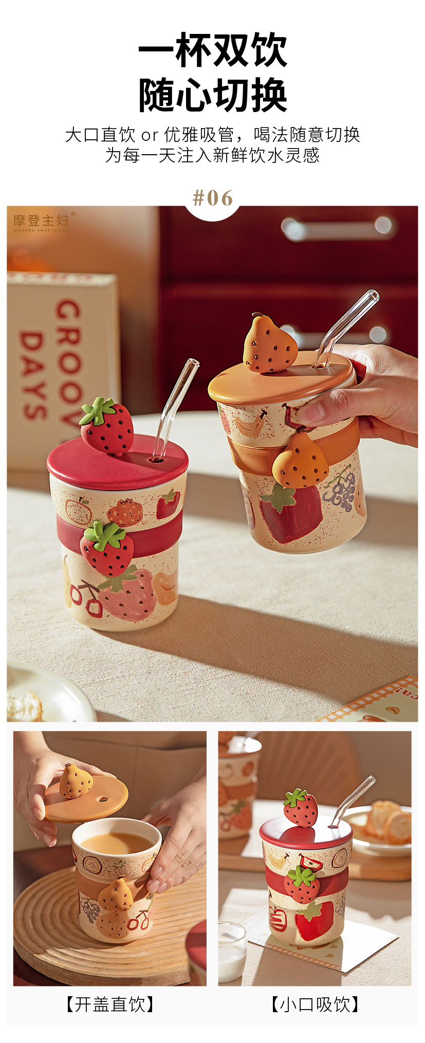摩登主妇带盖陶瓷马克杯本命年马年新年礼物家用吸管水杯咖啡杯子