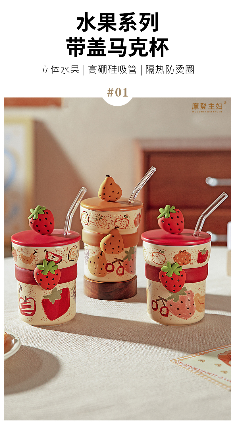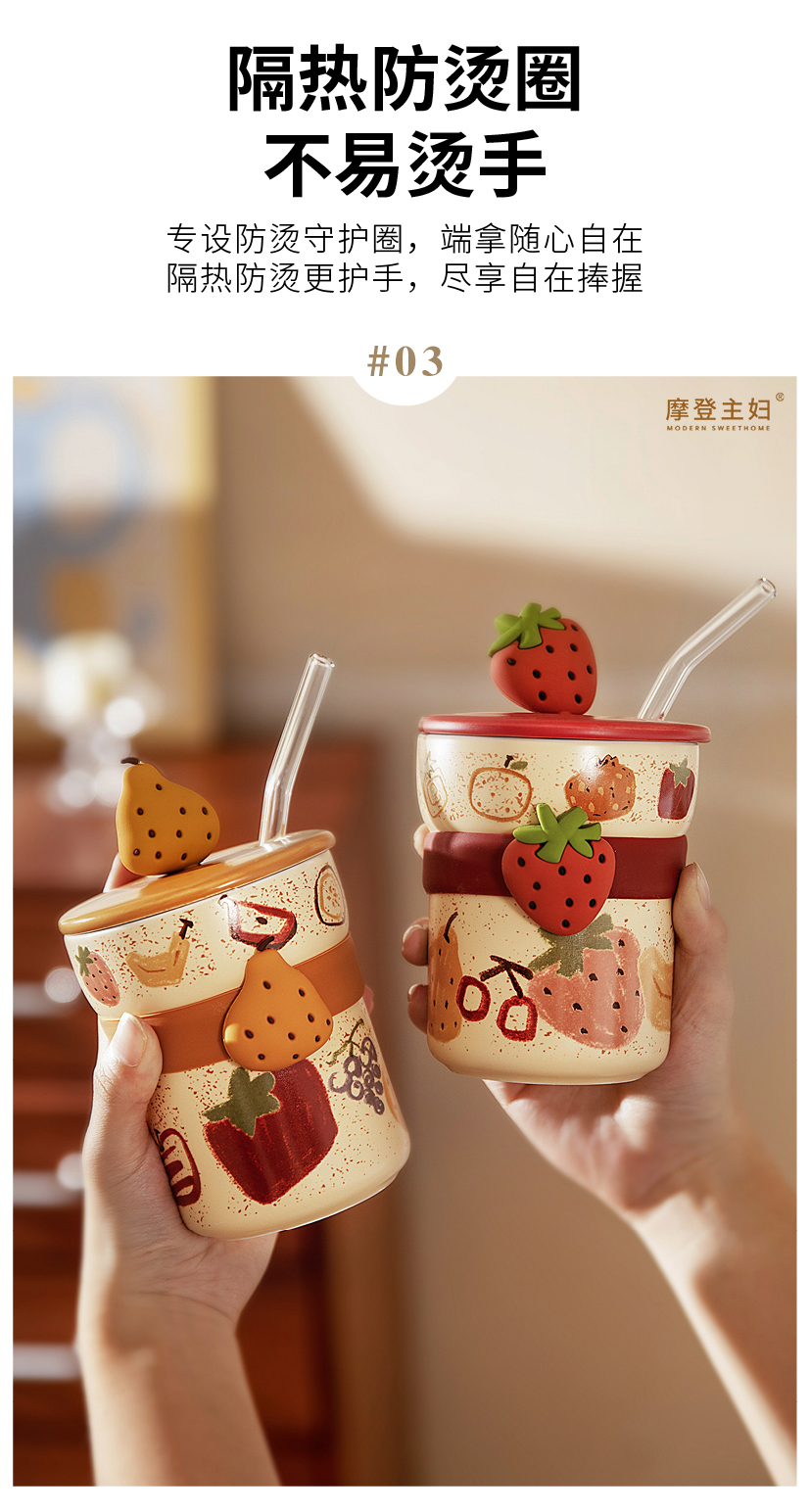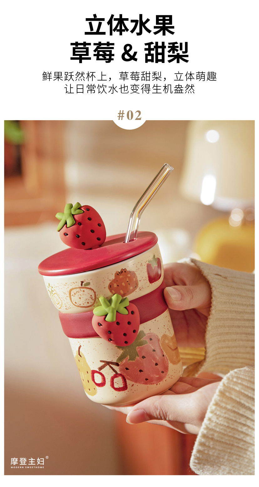摩登主妇带盖陶瓷马克杯本命年马年新年礼物家用吸管水杯咖啡杯子