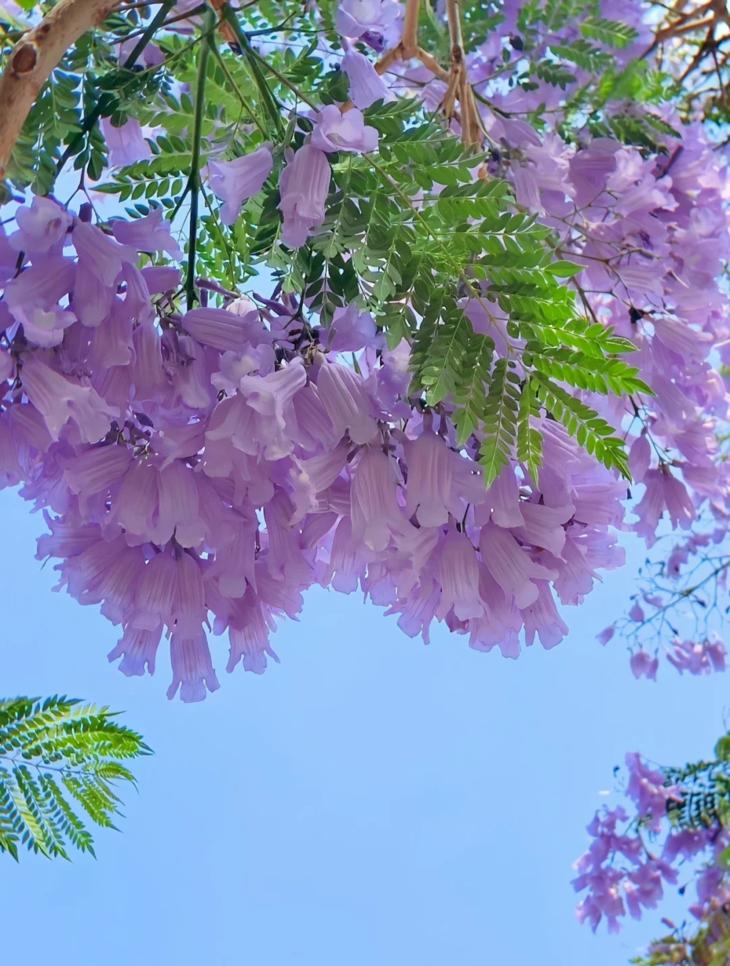 接着来到著名的蓝花楹路——【教场中路】,两公里的蓝紫色花海绵亘成一座花香满盈的隧道,它们成了蓝天的盖头,欲遮还羞雨似蝶飘来,花朵打落在泥土上,而雨早被花儿浸成了天然的香水。