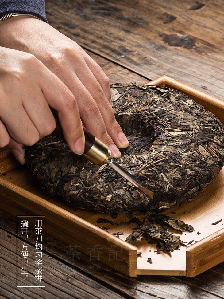 用茶刀顺茶饼、茶砖等紧压茶的纹理,