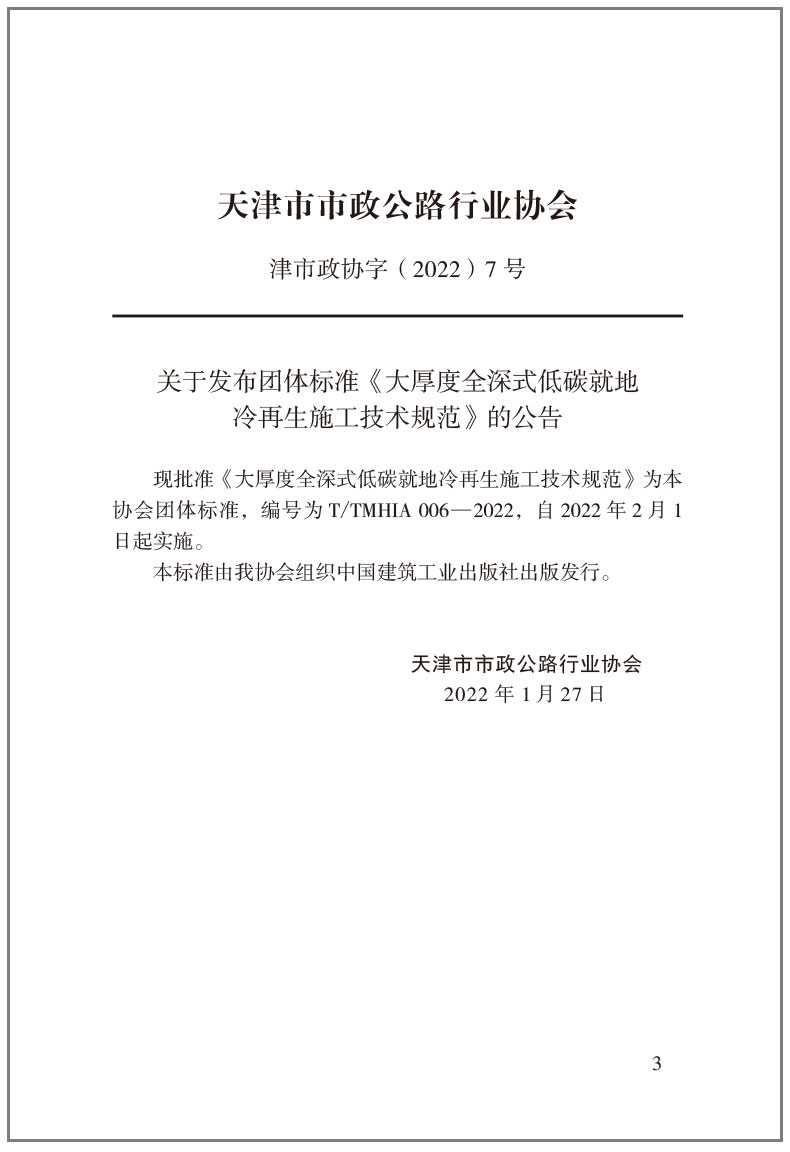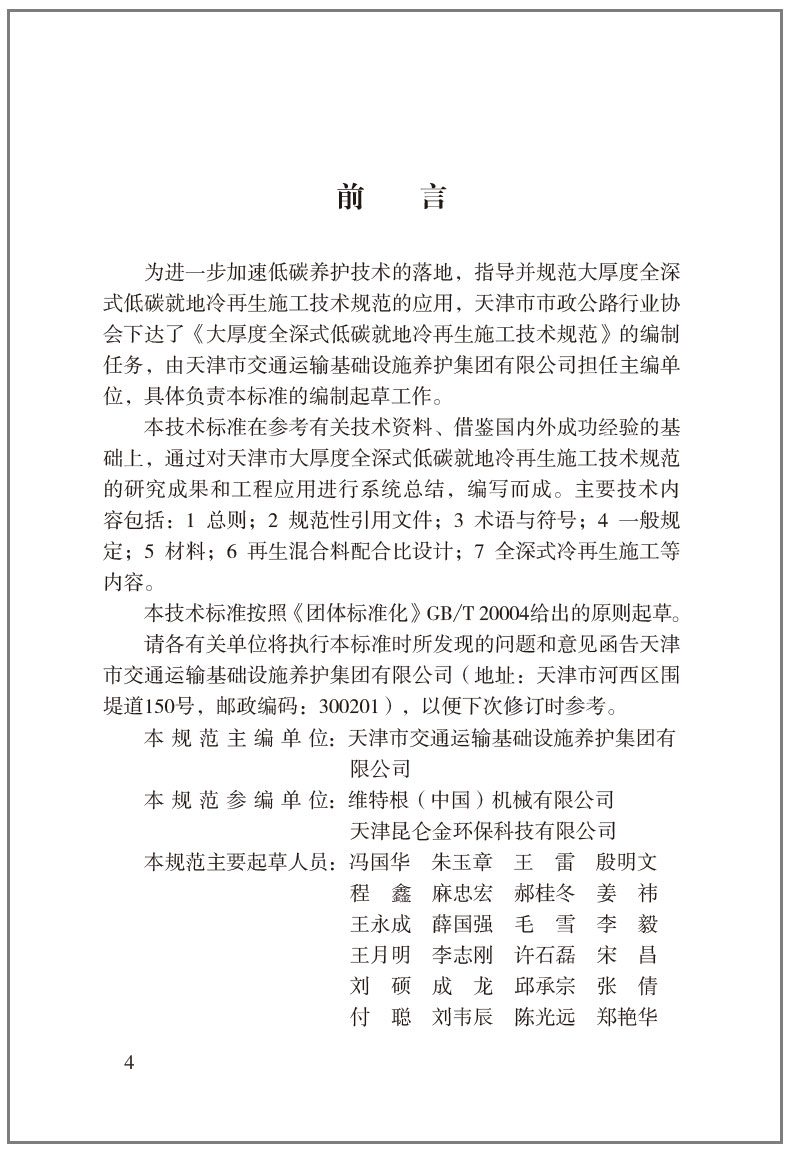 为进一步规范大厚度全深式低碳就地冷再生技术的应用,同时提升应用水平,加速优质养护成果落地,天津市市政公路行业协会下达了《大厚度全深式低碳就地冷再生技术》的编制任务,主要由天津市交通运输基础设施养护集团有限公司牵头担任《大厚度全深式低碳就地冷再生技术》团体标准主编单位,具体负责本标准的编制工作。 本技术标准在参考大量文献和吸收借鉴国内外先进地区宝贵经验的基础上,对天津市大厚度全深式低碳就地冷再生技术的研究成果和工程应用进行详细总结。标准共分7章、2个附录。主要内容包括:总则、规范引述性文件、术语与符号、原材料、再生混合料配合比设计、全深式冷再生施工等。