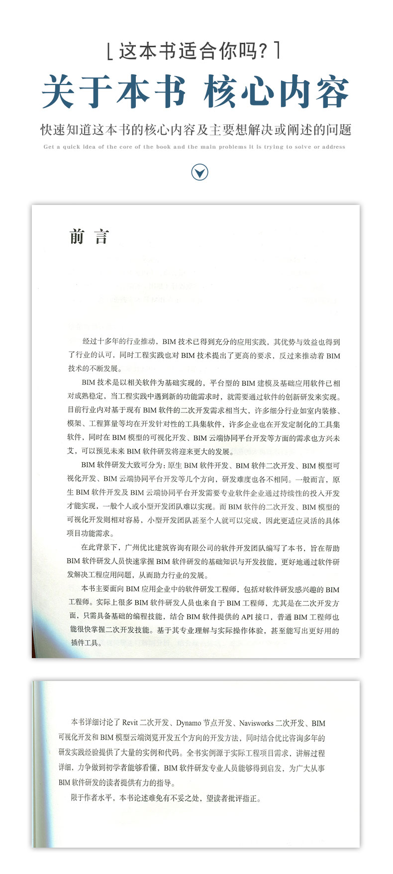 本书是“BIM技术及应用丛书”中的一本,主要面向BIM应用企业中的软件研发工程师,包括对软件研发感兴趣的BIM工程师。实际上很多BIM软件研发人员也来自于BIM工程师,尤其是在二次开发方面,只需具备基础的编程技能,结合BIM软件提供的API接口,普通BIM工程师也能很快掌握二次开发技能。全书共6章,包括:BIM软件研发概述、Revit二次开发、Dynamo节点开发、Navisworks二次开发、BIM可视化开发和BIM模型云端浏览开发,书中结合作者及其团队的研发实践经验提供了大量的实例和代码,实例源于实际工程项目需求,讲解过程详细。本书内容丰富,具有较强的指导性,可供BIM应用企业中的软件研发工程师和对软件研发感兴趣的BIM工程师参考使用。