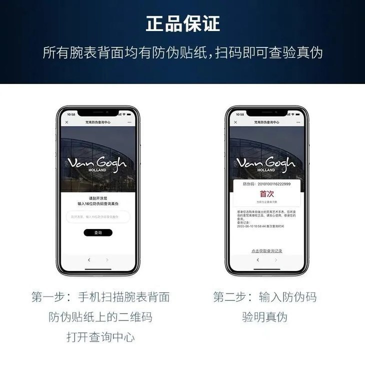 每块表都有一个防伪二维码,可以直接扫描二维码验真。