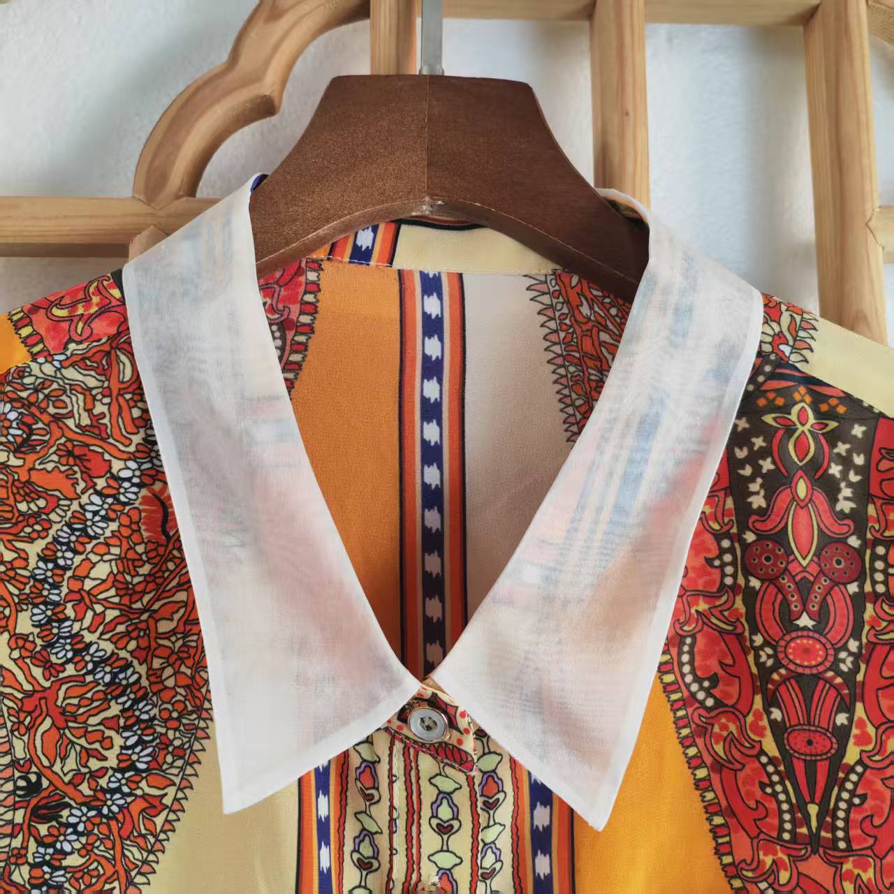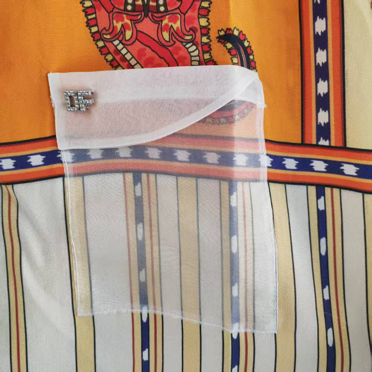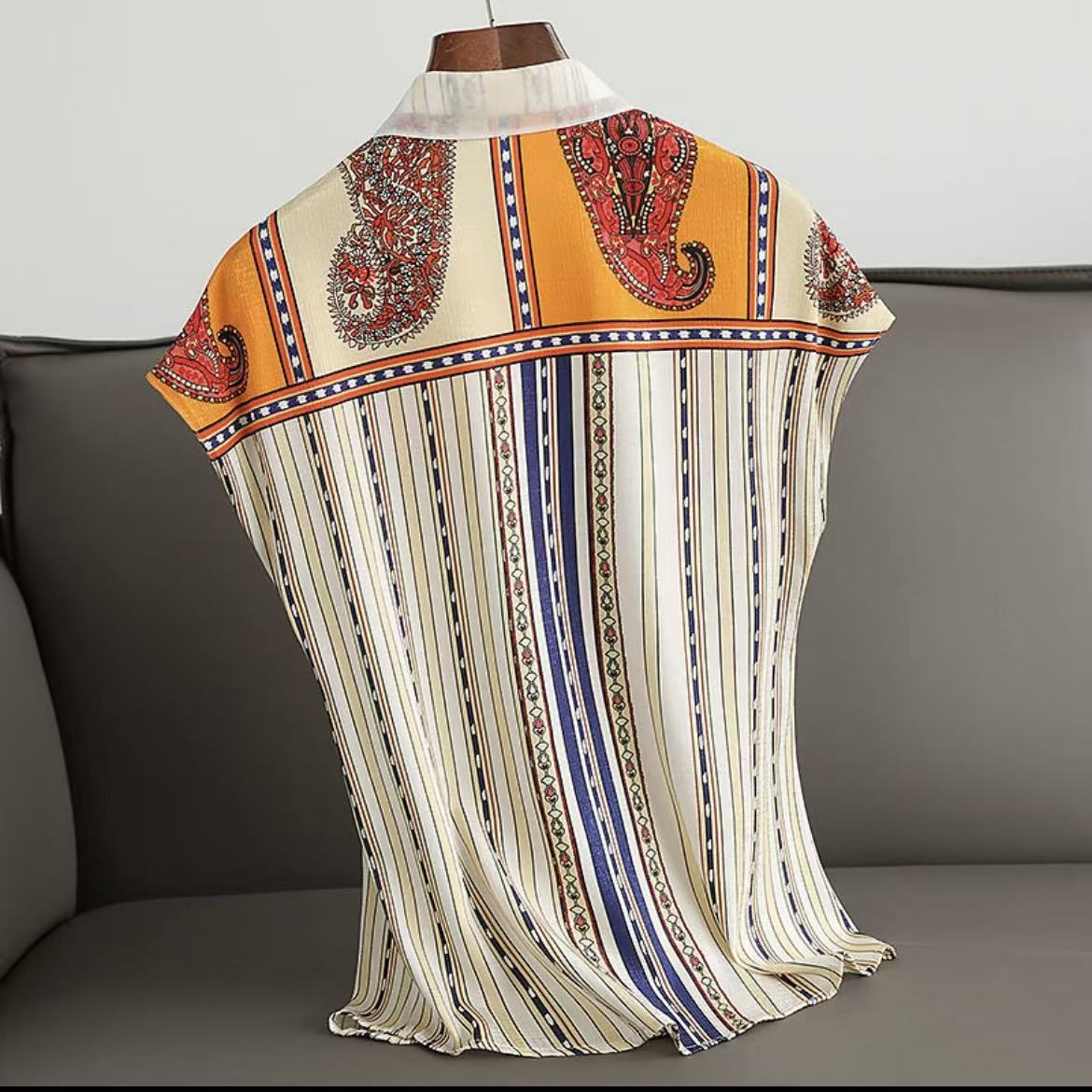 仅一件!【低价清仓】L码 民族风花纹拼接条纹无袖翻领桑蚕丝上衣ZFYY019