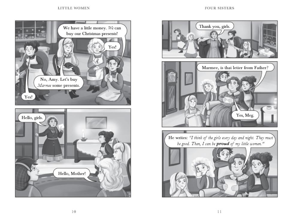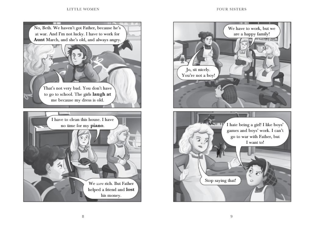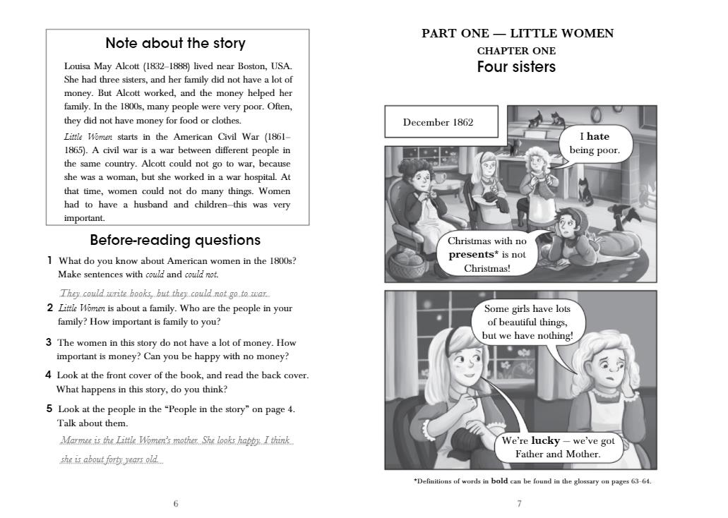 Little Women is the story of a poor American family in the American Civil War. The four sisters, Beth, Jo, Meg and Amy are very different. But together they work hard and help their mother and father. Sometimes their lives are very happy, and sometimes they are very sad. But the family's love always helps them.