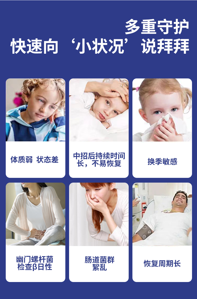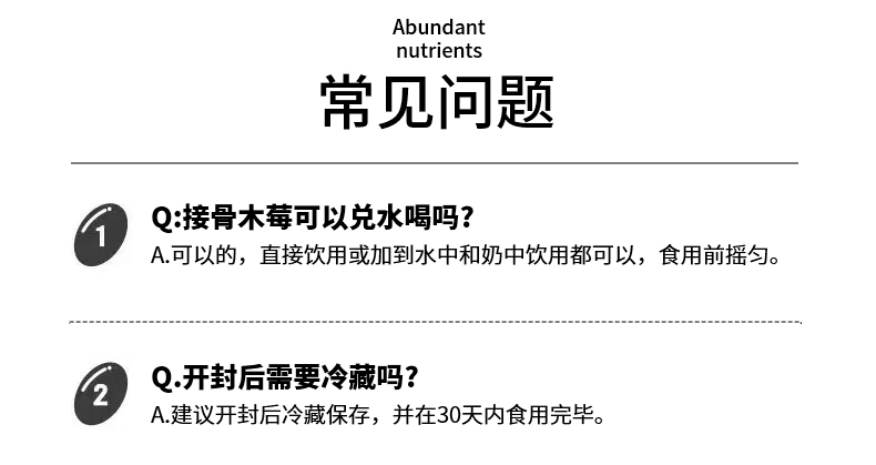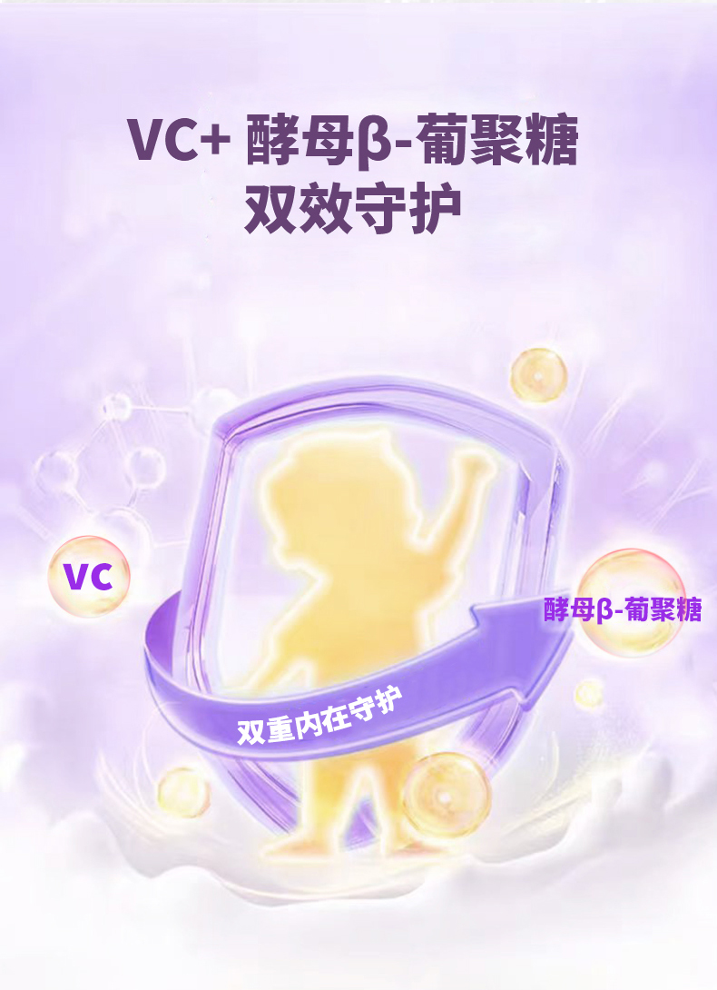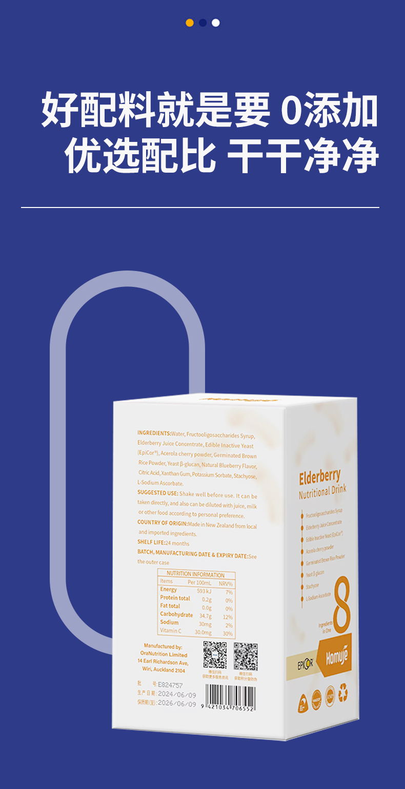 每条含:Epicor食用非活性酵母150mg、浓缩接骨木莓汁500mg(≈11000新鲜接骨木莓汁)、γ-氨基丁酸10mg、酵母β-葡聚糖40mg、针叶樱桃50mg、VC3mg